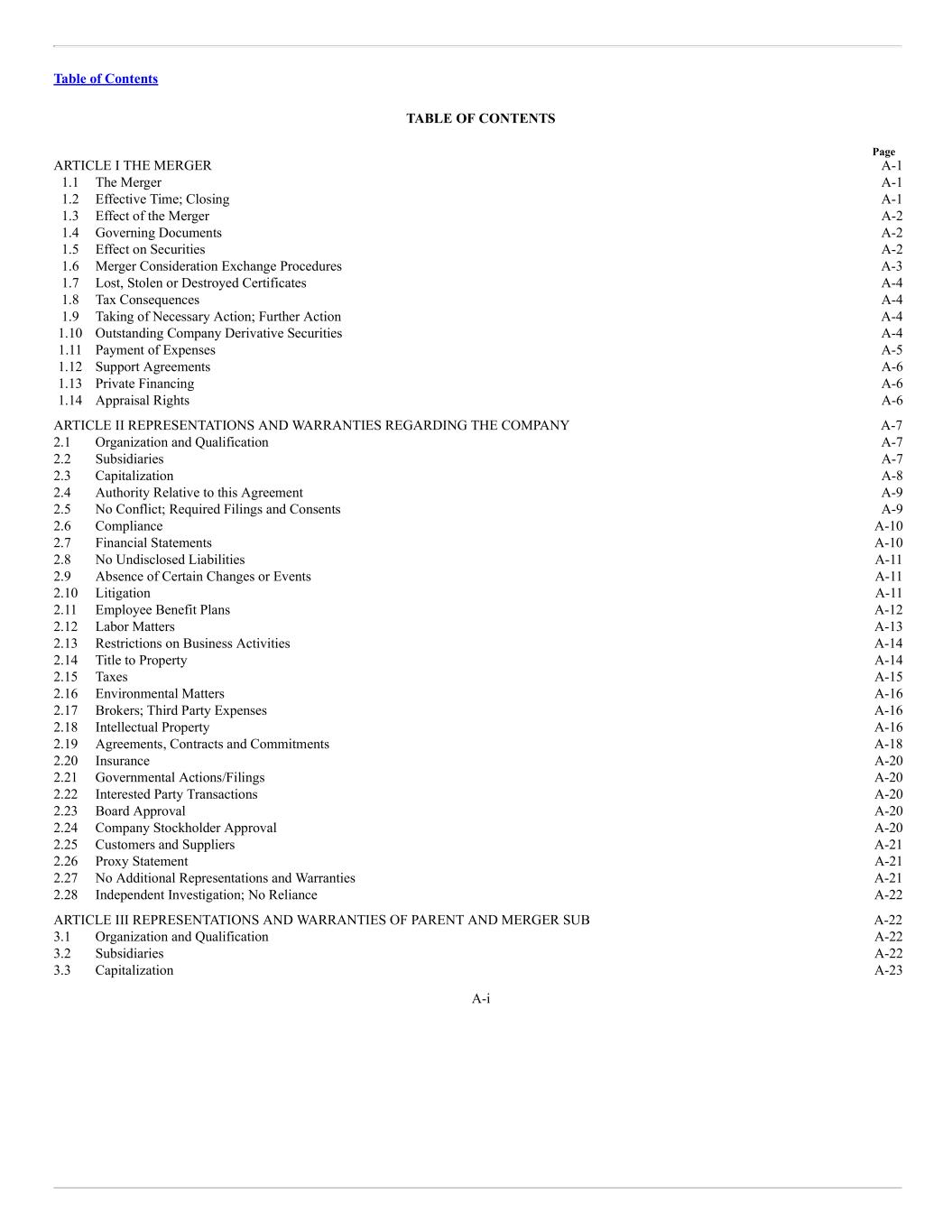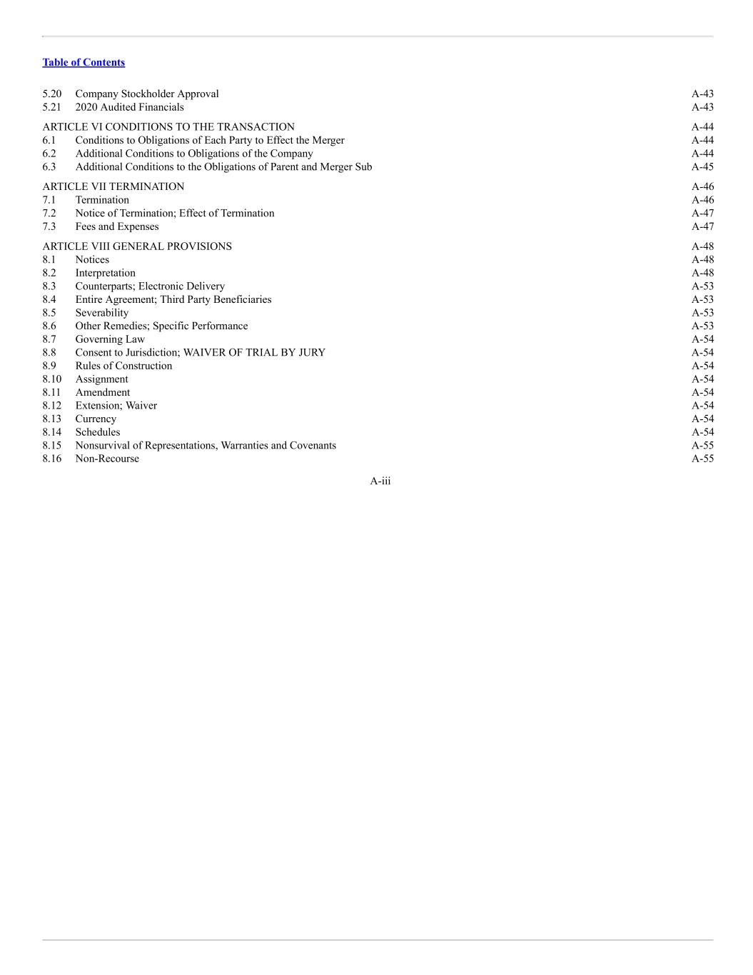Table of Contents 5.20   Company Stockholder Approval      A-43  5.21   2020 Audited Financials      A-43  ARTICLE VI CONDITIONS TO THE TRANSACTION      A-44  6.1   Conditions to Obligations of Each Party to Effect the Merger      A-44  6.2   Additional Conditions to Obligations of the Company      A-44  6.3   Additional Conditions to the Obligations of Parent and Merger Sub      A-45  ARTICLE VII TERMINATION     A-46  7.1   Termination      A-46  7.2   Notice of Termination; Effect of Termination      A-47  7.3   Fees and Expenses      A-47  ARTICLE VIII GENERAL PROVISIONS      A-48  8.1   Notices      A-48  8.2   Interpretation      A-48  8.3   Counterparts; Electronic Delivery      A-53  8.4   Entire Agreement; Third Party Beneficiaries      A-53  8.5   Severability      A-53  8.6   Other Remedies; Specific Performance      A-53  8.7   Governing Law      A-54  8.8   Consent to Jurisdiction; WAIVER OF TRIAL BY JURY      A-54  8.9   Rules of Construction      A-54  8.10   Assignment      A-54  8.11   Amendment      A-54  8.12   Extension; Waiver      A-54  8.13   Currency      A-54  8.14   Schedules      A-54  8.15   Nonsurvival of Representations, Warranties and Covenants      A-55  8.16   Non-Recourse      A-55    A-iii