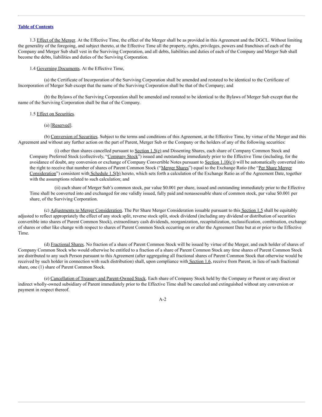 Table of Contents 1.3 Effect of the Merger. At the Effective Time, the effect of the Merger shall be as provided in this Agreement and the DGCL. Without limiting the generality of the foregoing, and subject thereto, at the Effective Time all the property, rights, privileges, powers and franchises of each of the Company and Merger Sub shall vest in the Surviving Corporation, and all debts, liabilities and duties of each of the Company and Merger Sub shall become the debts, liabilities and duties of the Surviving Corporation. 1.4 Governing Documents. At the Effective Time, (a) the Certificate of Incorporation of the Surviving Corporation shall be amended and restated to be identical to the Certificate of Incorporation of Merger Sub except that the name of the Surviving Corporation shall be that of the Company; and (b) the Bylaws of the Surviving Corporation shall be amended and restated to be identical to the Bylaws of Merger Sub except that the name of the Surviving Corporation shall be that of the Company. 1.5 Effect on Securities. (a) [Reserved]. (b) Conversion of Securities. Subject to the terms and conditions of this Agreement, at the Effective Time, by virtue of the Merger and this Agreement and without any further action on the part of Parent, Merger Sub or the Company or the holders of any of the following securities: (i) other than shares cancelled pursuant to Section 1.5(e) and Dissenting Shares, each share of Company Common Stock and Company Preferred Stock (collectively, “Company Stock”) issued and outstanding immediately prior to the Effective Time (including, for the avoidance of doubt, any conversion or exchange of Company Convertible Notes pursuant to Section 1.10(c)) will be automatically converted into the right to receive that number of shares of Parent Common Stock (“Merger Shares”) equal to the Exchange Ratio (the “Per Share Merger Consideration”) consistent with Schedule 1.5(b) hereto, which sets forth a calculation of the Exchange Ratio as of the Agreement Date, together with the assumptions related to such calculation; and (ii) each share of Merger Sub’s common stock, par value $0.001 per share, issued and outstanding immediately prior to the Effective Time shall be converted into and exchanged for one validly issued, fully paid and nonassessable share of common stock, par value $0.001 per share, of the Surviving Corporation. (c) Adjustments to Merger Consideration. The Per Share Merger Consideration issuable pursuant to this Section 1.5 shall be equitably adjusted to reflect appropriately the effect of any stock split, reverse stock split, stock dividend (including any dividend or distribution of securities convertible into shares of Parent Common Stock), extraordinary cash dividends, reorganization, recapitalization, reclassification, combination, exchange of shares or other like change with respect to shares of Parent Common Stock occurring on or after the Agreement Date but at or prior to the Effective Time. (d) Fractional Shares. No fraction of a share of Parent Common Stock will be issued by virtue of the Merger, and each holder of shares of Company Common Stock who would otherwise be entitled to a fraction of a share of Parent Common Stock any time shares of Parent Common Stock are distributed to any such Person pursuant to this Agreement (after aggregating all fractional shares of Parent Common Stock that otherwise would be received by such holder in connection with such distribution) shall, upon compliance with Section 1.6, receive from Parent, in lieu of such fractional share, one (1) share of Parent Common Stock. (e) Cancellation of Treasury and Parent-Owned Stock. Each share of Company Stock held by the Company or Parent or any direct or indirect wholly-owned subsidiary of Parent immediately prior to the Effective Time shall be canceled and extinguished without any conversion or payment in respect thereof.   A-2