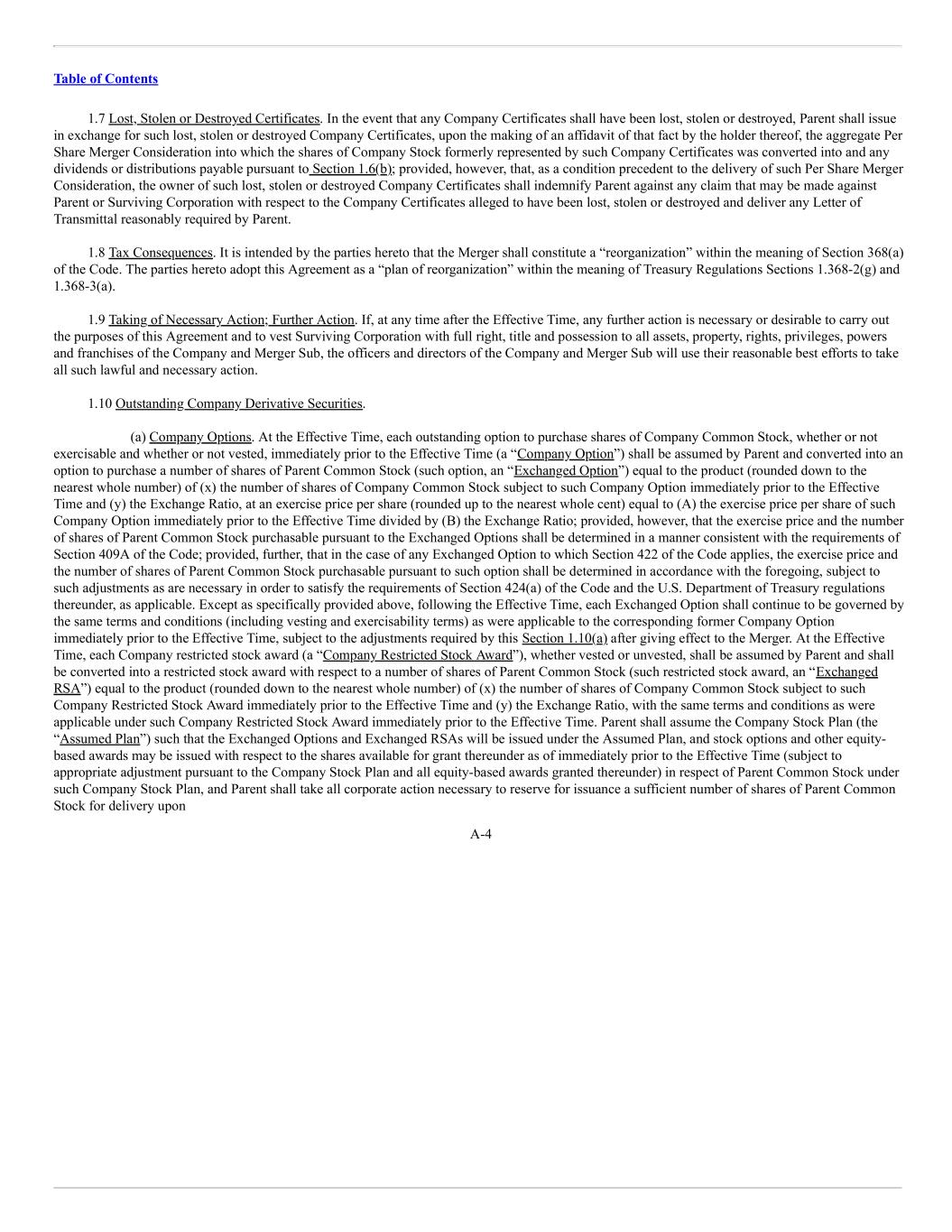 Table of Contents 1.7 Lost, Stolen or Destroyed Certificates. In the event that any Company Certificates shall have been lost, stolen or destroyed, Parent shall issue in exchange for such lost, stolen or destroyed Company Certificates, upon the making of an affidavit of that fact by the holder thereof, the aggregate Per Share Merger Consideration into which the shares of Company Stock formerly represented by such Company Certificates was converted into and any dividends or distributions payable pursuant to Section 1.6(b); provided, however, that, as a condition precedent to the delivery of such Per Share Merger Consideration, the owner of such lost, stolen or destroyed Company Certificates shall indemnify Parent against any claim that may be made against Parent or Surviving Corporation with respect to the Company Certificates alleged to have been lost, stolen or destroyed and deliver any Letter of Transmittal reasonably required by Parent. 1.8 Tax Consequences. It is intended by the parties hereto that the Merger shall constitute a “reorganization” within the meaning of Section 368(a) of the Code. The parties hereto adopt this Agreement as a “plan of reorganization” within the meaning of Treasury Regulations Sections 1.368-2(g) and 1.368-3(a). 1.9 Taking of Necessary Action; Further Action. If, at any time after the Effective Time, any further action is necessary or desirable to carry out the purposes of this Agreement and to vest Surviving Corporation with full right, title and possession to all assets, property, rights, privileges, powers and franchises of the Company and Merger Sub, the officers and directors of the Company and Merger Sub will use their reasonable best efforts to take all such lawful and necessary action. 1.10 Outstanding Company Derivative Securities. (a) Company Options. At the Effective Time, each outstanding option to purchase shares of Company Common Stock, whether or not exercisable and whether or not vested, immediately prior to the Effective Time (a “Company Option”) shall be assumed by Parent and converted into an option to purchase a number of shares of Parent Common Stock (such option, an “Exchanged Option”) equal to the product (rounded down to the nearest whole number) of (x) the number of shares of Company Common Stock subject to such Company Option immediately prior to the Effective Time and (y) the Exchange Ratio, at an exercise price per share (rounded up to the nearest whole cent) equal to (A) the exercise price per share of such Company Option immediately prior to the Effective Time divided by (B) the Exchange Ratio; provided, however, that the exercise price and the number of shares of Parent Common Stock purchasable pursuant to the Exchanged Options shall be determined in a manner consistent with the requirements of Section 409A of the Code; provided, further, that in the case of any Exchanged Option to which Section 422 of the Code applies, the exercise price and the number of shares of Parent Common Stock purchasable pursuant to such option shall be determined in accordance with the foregoing, subject to such adjustments as are necessary in order to satisfy the requirements of Section 424(a) of the Code and the U.S. Department of Treasury regulations thereunder, as applicable. Except as specifically provided above, following the Effective Time, each Exchanged Option shall continue to be governed by the same terms and conditions (including vesting and exercisability terms) as were applicable to the corresponding former Company Option immediately prior to the Effective Time, subject to the adjustments required by this Section 1.10(a) after giving effect to the Merger. At the Effective Time, each Company restricted stock award (a “Company Restricted Stock Award”), whether vested or unvested, shall be assumed by Parent and shall be converted into a restricted stock award with respect to a number of shares of Parent Common Stock (such restricted stock award, an “Exchanged RSA”) equal to the product (rounded down to the nearest whole number) of (x) the number of shares of Company Common Stock subject to such Company Restricted Stock Award immediately prior to the Effective Time and (y) the Exchange Ratio, with the same terms and conditions as were applicable under such Company Restricted Stock Award immediately prior to the Effective Time. Parent shall assume the Company Stock Plan (the “Assumed Plan”) such that the Exchanged Options and Exchanged RSAs will be issued under the Assumed Plan, and stock options and other equity- based awards may be issued with respect to the shares available for grant thereunder as of immediately prior to the Effective Time (subject to appropriate adjustment pursuant to the Company Stock Plan and all equity-based awards granted thereunder) in respect of Parent Common Stock under such Company Stock Plan, and Parent shall take all corporate action necessary to reserve for issuance a sufficient number of shares of Parent Common Stock for delivery upon   A-4