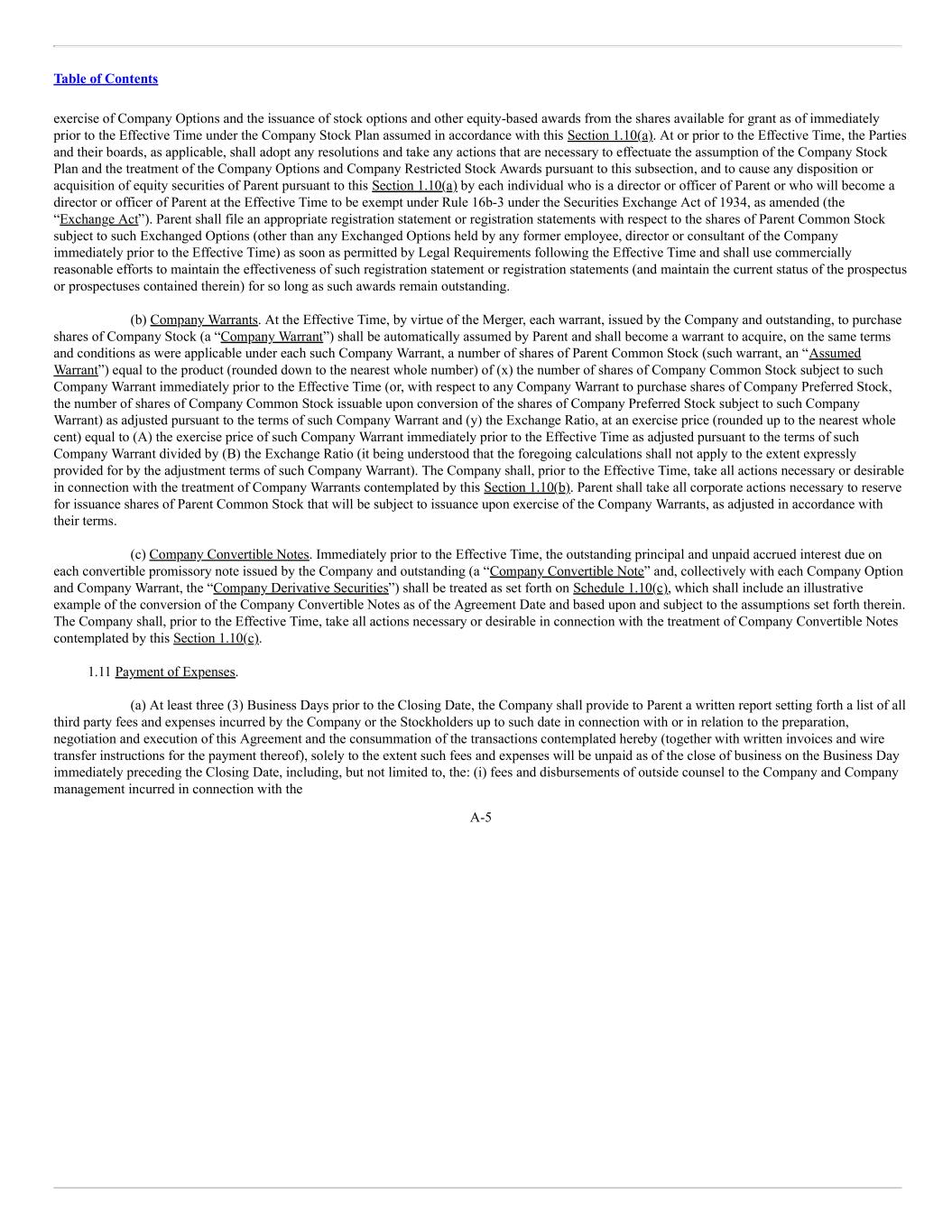 Table of Contents exercise of Company Options and the issuance of stock options and other equity-based awards from the shares available for grant as of immediately prior to the Effective Time under the Company Stock Plan assumed in accordance with this Section 1.10(a). At or prior to the Effective Time, the Parties and their boards, as applicable, shall adopt any resolutions and take any actions that are necessary to effectuate the assumption of the Company Stock Plan and the treatment of the Company Options and Company Restricted Stock Awards pursuant to this subsection, and to cause any disposition or acquisition of equity securities of Parent pursuant to this Section 1.10(a) by each individual who is a director or officer of Parent or who will become a director or officer of Parent at the Effective Time to be exempt under Rule 16b-3 under the Securities Exchange Act of 1934, as amended (the “Exchange Act”). Parent shall file an appropriate registration statement or registration statements with respect to the shares of Parent Common Stock subject to such Exchanged Options (other than any Exchanged Options held by any former employee, director or consultant of the Company immediately prior to the Effective Time) as soon as permitted by Legal Requirements following the Effective Time and shall use commercially reasonable efforts to maintain the effectiveness of such registration statement or registration statements (and maintain the current status of the prospectus or prospectuses contained therein) for so long as such awards remain outstanding. (b) Company Warrants. At the Effective Time, by virtue of the Merger, each warrant, issued by the Company and outstanding, to purchase shares of Company Stock (a “Company Warrant”) shall be automatically assumed by Parent and shall become a warrant to acquire, on the same terms and conditions as were applicable under each such Company Warrant, a number of shares of Parent Common Stock (such warrant, an “Assumed Warrant”) equal to the product (rounded down to the nearest whole number) of (x) the number of shares of Company Common Stock subject to such Company Warrant immediately prior to the Effective Time (or, with respect to any Company Warrant to purchase shares of Company Preferred Stock, the number of shares of Company Common Stock issuable upon conversion of the shares of Company Preferred Stock subject to such Company Warrant) as adjusted pursuant to the terms of such Company Warrant and (y) the Exchange Ratio, at an exercise price (rounded up to the nearest whole cent) equal to (A) the exercise price of such Company Warrant immediately prior to the Effective Time as adjusted pursuant to the terms of such Company Warrant divided by (B) the Exchange Ratio (it being understood that the foregoing calculations shall not apply to the extent expressly provided for by the adjustment terms of such Company Warrant). The Company shall, prior to the Effective Time, take all actions necessary or desirable in connection with the treatment of Company Warrants contemplated by this Section 1.10(b). Parent shall take all corporate actions necessary to reserve for issuance shares of Parent Common Stock that will be subject to issuance upon exercise of the Company Warrants, as adjusted in accordance with their terms. (c) Company Convertible Notes. Immediately prior to the Effective Time, the outstanding principal and unpaid accrued interest due on each convertible promissory note issued by the Company and outstanding (a “Company Convertible Note” and, collectively with each Company Option and Company Warrant, the “Company Derivative Securities”) shall be treated as set forth on Schedule 1.10(c), which shall include an illustrative example of the conversion of the Company Convertible Notes as of the Agreement Date and based upon and subject to the assumptions set forth therein. The Company shall, prior to the Effective Time, take all actions necessary or desirable in connection with the treatment of Company Convertible Notes contemplated by this Section 1.10(c). 1.11 Payment of Expenses. (a) At least three (3) Business Days prior to the Closing Date, the Company shall provide to Parent a written report setting forth a list of all third party fees and expenses incurred by the Company or the Stockholders up to such date in connection with or in relation to the preparation, negotiation and execution of this Agreement and the consummation of the transactions contemplated hereby (together with written invoices and wire transfer instructions for the payment thereof), solely to the extent such fees and expenses will be unpaid as of the close of business on the Business Day immediately preceding the Closing Date, including, but not limited to, the: (i) fees and disbursements of outside counsel to the Company and Company management incurred in connection with the   A-5
