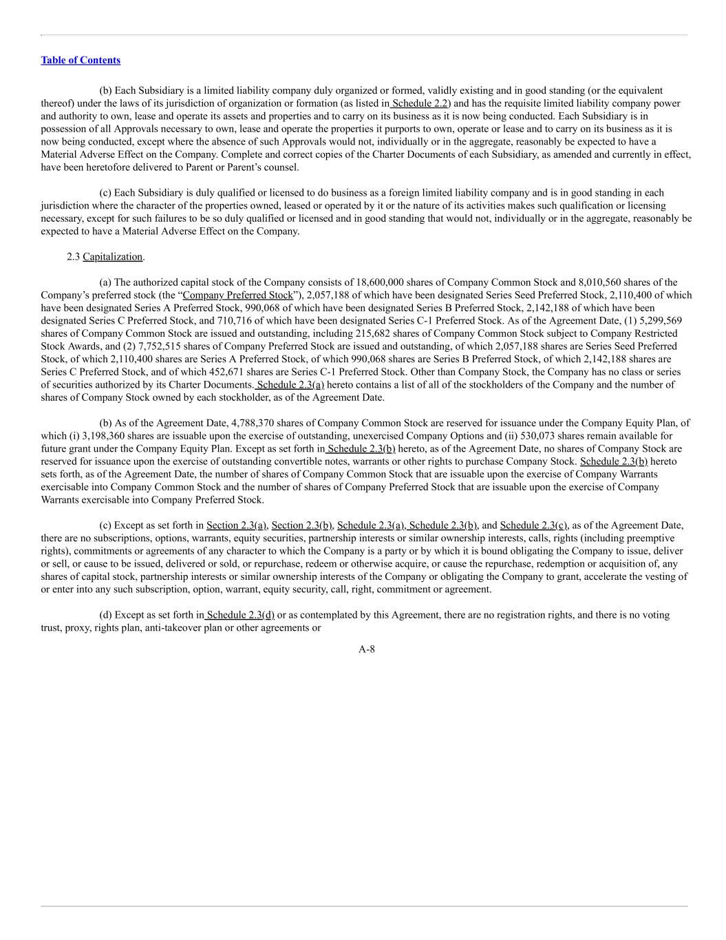 Table of Contents (b) Each Subsidiary is a limited liability company duly organized or formed, validly existing and in good standing (or the equivalent thereof) under the laws of its jurisdiction of organization or formation (as listed in Schedule 2.2) and has the requisite limited liability company power and authority to own, lease and operate its assets and properties and to carry on its business as it is now being conducted. Each Subsidiary is in possession of all Approvals necessary to own, lease and operate the properties it purports to own, operate or lease and to carry on its business as it is now being conducted, except where the absence of such Approvals would not, individually or in the aggregate, reasonably be expected to have a Material Adverse Effect on the Company. Complete and correct copies of the Charter Documents of each Subsidiary, as amended and currently in effect, have been heretofore delivered to Parent or Parent’s counsel. (c) Each Subsidiary is duly qualified or licensed to do business as a foreign limited liability company and is in good standing in each jurisdiction where the character of the properties owned, leased or operated by it or the nature of its activities makes such qualification or licensing necessary, except for such failures to be so duly qualified or licensed and in good standing that would not, individually or in the aggregate, reasonably be expected to have a Material Adverse Effect on the Company. 2.3 Capitalization. (a) The authorized capital stock of the Company consists of 18,600,000 shares of Company Common Stock and 8,010,560 shares of the Company’s preferred stock (the “Company Preferred Stock”), 2,057,188 of which have been designated Series Seed Preferred Stock, 2,110,400 of which have been designated Series A Preferred Stock, 990,068 of which have been designated Series B Preferred Stock, 2,142,188 of which have been designated Series C Preferred Stock, and 710,716 of which have been designated Series C-1 Preferred Stock. As of the Agreement Date, (1) 5,299,569 shares of Company Common Stock are issued and outstanding, including 215,682 shares of Company Common Stock subject to Company Restricted Stock Awards, and (2) 7,752,515 shares of Company Preferred Stock are issued and outstanding, of which 2,057,188 shares are Series Seed Preferred Stock, of which 2,110,400 shares are Series A Preferred Stock, of which 990,068 shares are Series B Preferred Stock, of which 2,142,188 shares are Series C Preferred Stock, and of which 452,671 shares are Series C-1 Preferred Stock. Other than Company Stock, the Company has no class or series of securities authorized by its Charter Documents. Schedule 2.3(a) hereto contains a list of all of the stockholders of the Company and the number of shares of Company Stock owned by each stockholder, as of the Agreement Date. (b) As of the Agreement Date, 4,788,370 shares of Company Common Stock are reserved for issuance under the Company Equity Plan, of which (i) 3,198,360 shares are issuable upon the exercise of outstanding, unexercised Company Options and (ii) 530,073 shares remain available for future grant under the Company Equity Plan. Except as set forth in Schedule 2.3(b) hereto, as of the Agreement Date, no shares of Company Stock are reserved for issuance upon the exercise of outstanding convertible notes, warrants or other rights to purchase Company Stock. Schedule 2.3(b) hereto sets forth, as of the Agreement Date, the number of shares of Company Common Stock that are issuable upon the exercise of Company Warrants exercisable into Company Common Stock and the number of shares of Company Preferred Stock that are issuable upon the exercise of Company Warrants exercisable into Company Preferred Stock. (c) Except as set forth in Section 2.3(a), Section 2.3(b), Schedule 2.3(a), Schedule 2.3(b), and Schedule 2.3(c), as of the Agreement Date, there are no subscriptions, options, warrants, equity securities, partnership interests or similar ownership interests, calls, rights (including preemptive rights), commitments or agreements of any character to which the Company is a party or by which it is bound obligating the Company to issue, deliver or sell, or cause to be issued, delivered or sold, or repurchase, redeem or otherwise acquire, or cause the repurchase, redemption or acquisition of, any shares of capital stock, partnership interests or similar ownership interests of the Company or obligating the Company to grant, accelerate the vesting of or enter into any such subscription, option, warrant, equity security, call, right, commitment or agreement. (d) Except as set forth in Schedule 2.3(d) or as contemplated by this Agreement, there are no registration rights, and there is no voting trust, proxy, rights plan, anti-takeover plan or other agreements or   A-8