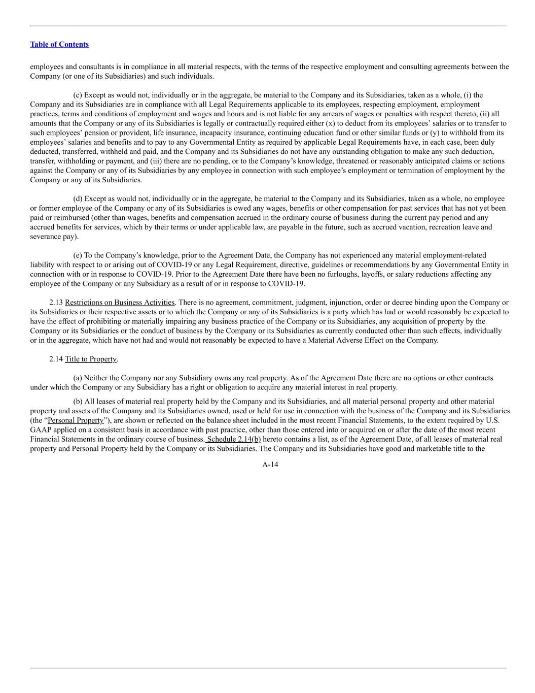 Table of Contents employees and consultants is in compliance in all material respects, with the terms of the respective employment and consulting agreements between the Company (or one of its Subsidiaries) and such individuals. (c) Except as would not, individually or in the aggregate, be material to the Company and its Subsidiaries, taken as a whole, (i) the Company and its Subsidiaries are in compliance with all Legal Requirements applicable to its employees, respecting employment, employment practices, terms and conditions of employment and wages and hours and is not liable for any arrears of wages or penalties with respect thereto, (ii) all amounts that the Company or any of its Subsidiaries is legally or contractually required either (x) to deduct from its employees’ salaries or to transfer to such employees’ pension or provident, life insurance, incapacity insurance, continuing education fund or other similar funds or (y) to withhold from its employees’ salaries and benefits and to pay to any Governmental Entity as required by applicable Legal Requirements have, in each case, been duly deducted, transferred, withheld and paid, and the Company and its Subsidiaries do not have any outstanding obligation to make any such deduction, transfer, withholding or payment, and (iii) there are no pending, or to the Company’s knowledge, threatened or reasonably anticipated claims or actions against the Company or any of its Subsidiaries by any employee in connection with such employee’s employment or termination of employment by the Company or any of its Subsidiaries. (d) Except as would not, individually or in the aggregate, be material to the Company and its Subsidiaries, taken as a whole, no employee or former employee of the Company or any of its Subsidiaries is owed any wages, benefits or other compensation for past services that has not yet been paid or reimbursed (other than wages, benefits and compensation accrued in the ordinary course of business during the current pay period and any accrued benefits for services, which by their terms or under applicable law, are payable in the future, such as accrued vacation, recreation leave and severance pay). (e) To the Company’s knowledge, prior to the Agreement Date, the Company has not experienced any material employment-related liability with respect to or arising out of COVID-19 or any Legal Requirement, directive, guidelines or recommendations by any Governmental Entity in connection with or in response to COVID-19. Prior to the Agreement Date there have been no furloughs, layoffs, or salary reductions affecting any employee of the Company or any Subsidiary as a result of or in response to COVID-19. 2.13 Restrictions on Business Activities. There is no agreement, commitment, judgment, injunction, order or decree binding upon the Company or its Subsidiaries or their respective assets or to which the Company or any of its Subsidiaries is a party which has had or would reasonably be expected to have the effect of prohibiting or materially impairing any business practice of the Company or its Subsidiaries, any acquisition of property by the Company or its Subsidiaries or the conduct of business by the Company or its Subsidiaries as currently conducted other than such effects, individually or in the aggregate, which have not had and would not reasonably be expected to have a Material Adverse Effect on the Company. 2.14 Title to Property. (a) Neither the Company nor any Subsidiary owns any real property. As of the Agreement Date there are no options or other contracts under which the Company or any Subsidiary has a right or obligation to acquire any material interest in real property. (b) All leases of material real property held by the Company and its Subsidiaries, and all material personal property and other material property and assets of the Company and its Subsidiaries owned, used or held for use in connection with the business of the Company and its Subsidiaries (the “Personal Property”), are shown or reflected on the balance sheet included in the most recent Financial Statements, to the extent required by U.S. GAAP applied on a consistent basis in accordance with past practice, other than those entered into or acquired on or after the date of the most recent Financial Statements in the ordinary course of business. Schedule 2.14(b) hereto contains a list, as of the Agreement Date, of all leases of material real property and Personal Property held by the Company or its Subsidiaries. The Company and its Subsidiaries have good and marketable title to the   A-14