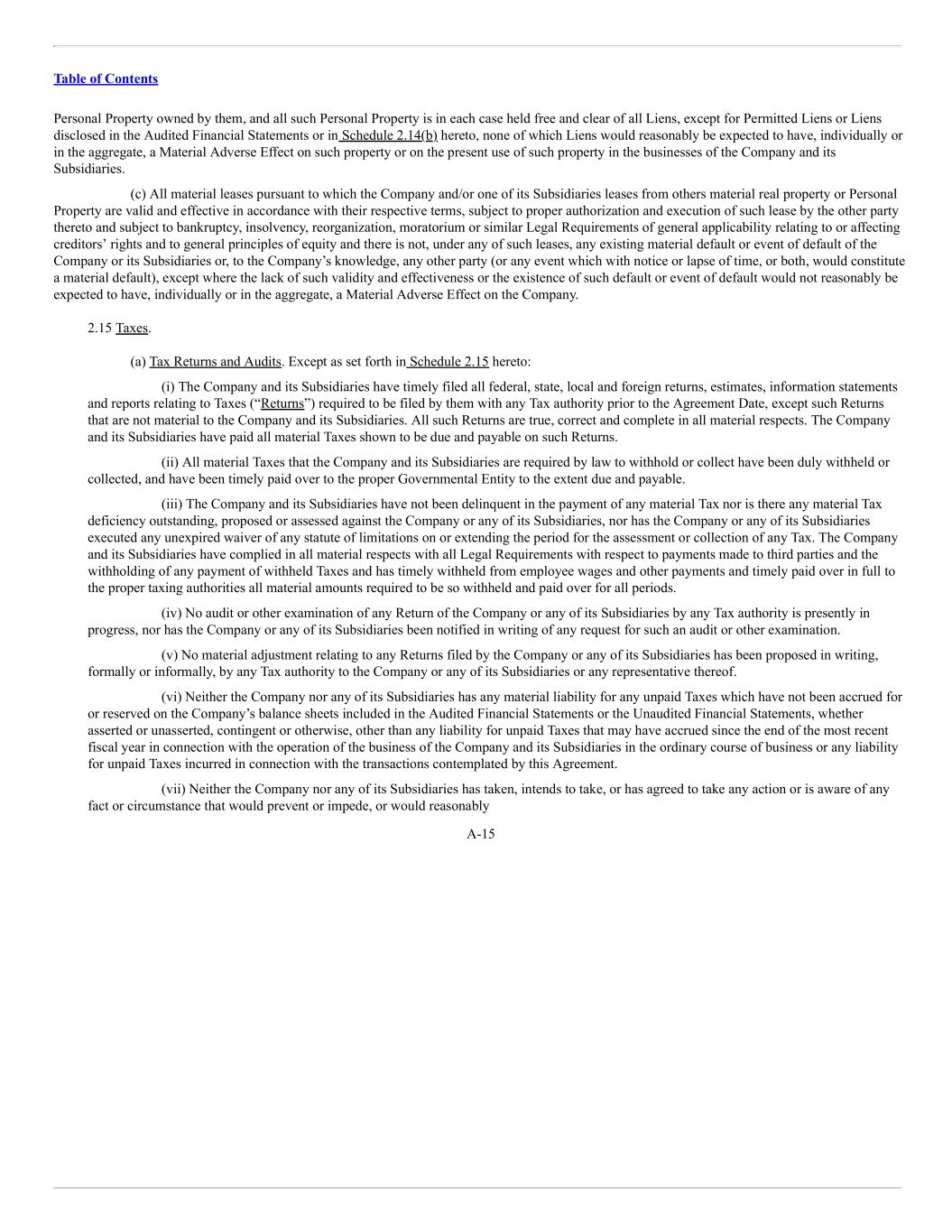 Table of Contents Personal Property owned by them, and all such Personal Property is in each case held free and clear of all Liens, except for Permitted Liens or Liens disclosed in the Audited Financial Statements or in Schedule 2.14(b) hereto, none of which Liens would reasonably be expected to have, individually or in the aggregate, a Material Adverse Effect on such property or on the present use of such property in the businesses of the Company and its Subsidiaries. (c) All material leases pursuant to which the Company and/or one of its Subsidiaries leases from others material real property or Personal Property are valid and effective in accordance with their respective terms, subject to proper authorization and execution of such lease by the other party thereto and subject to bankruptcy, insolvency, reorganization, moratorium or similar Legal Requirements of general applicability relating to or affecting creditors’ rights and to general principles of equity and there is not, under any of such leases, any existing material default or event of default of the Company or its Subsidiaries or, to the Company’s knowledge, any other party (or any event which with notice or lapse of time, or both, would constitute a material default), except where the lack of such validity and effectiveness or the existence of such default or event of default would not reasonably be expected to have, individually or in the aggregate, a Material Adverse Effect on the Company. 2.15 Taxes. (a) Tax Returns and Audits. Except as set forth in Schedule 2.15 hereto: (i) The Company and its Subsidiaries have timely filed all federal, state, local and foreign returns, estimates, information statements and reports relating to Taxes (“Returns”) required to be filed by them with any Tax authority prior to the Agreement Date, except such Returns that are not material to the Company and its Subsidiaries. All such Returns are true, correct and complete in all material respects. The Company and its Subsidiaries have paid all material Taxes shown to be due and payable on such Returns. (ii) All material Taxes that the Company and its Subsidiaries are required by law to withhold or collect have been duly withheld or collected, and have been timely paid over to the proper Governmental Entity to the extent due and payable. (iii) The Company and its Subsidiaries have not been delinquent in the payment of any material Tax nor is there any material Tax deficiency outstanding, proposed or assessed against the Company or any of its Subsidiaries, nor has the Company or any of its Subsidiaries executed any unexpired waiver of any statute of limitations on or extending the period for the assessment or collection of any Tax. The Company and its Subsidiaries have complied in all material respects with all Legal Requirements with respect to payments made to third parties and the withholding of any payment of withheld Taxes and has timely withheld from employee wages and other payments and timely paid over in full to the proper taxing authorities all material amounts required to be so withheld and paid over for all periods. (iv) No audit or other examination of any Return of the Company or any of its Subsidiaries by any Tax authority is presently in progress, nor has the Company or any of its Subsidiaries been notified in writing of any request for such an audit or other examination. (v) No material adjustment relating to any Returns filed by the Company or any of its Subsidiaries has been proposed in writing, formally or informally, by any Tax authority to the Company or any of its Subsidiaries or any representative thereof. (vi) Neither the Company nor any of its Subsidiaries has any material liability for any unpaid Taxes which have not been accrued for or reserved on the Company’s balance sheets included in the Audited Financial Statements or the Unaudited Financial Statements, whether asserted or unasserted, contingent or otherwise, other than any liability for unpaid Taxes that may have accrued since the end of the most recent fiscal year in connection with the operation of the business of the Company and its Subsidiaries in the ordinary course of business or any liability for unpaid Taxes incurred in connection with the transactions contemplated by this Agreement. (vii) Neither the Company nor any of its Subsidiaries has taken, intends to take, or has agreed to take any action or is aware of any fact or circumstance that would prevent or impede, or would reasonably   A-15