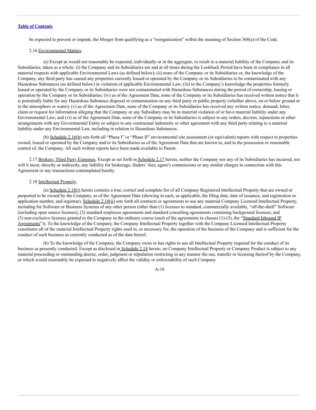 Table of Contents be expected to prevent or impede, the Merger from qualifying as a “reorganization” within the meaning of Section 368(a) of the Code. 2.16 Environmental Matters. (a) Except as would not reasonably be expected, individually or in the aggregate, to result in a material liability of the Company and its Subsidiaries, taken as a whole: (i) the Company and its Subsidiaries are and at all times during the Lookback Period have been in compliance in all material respects with applicable Environmental Laws (as defined below); (ii) none of the Company or its Subsidiaries or, the knowledge of the Company, any third party has caused any properties currently leased or operated by the Company or its Subsidiaries to be contaminated with any Hazardous Substances (as defined below) in violation of applicable Environmental Law; (iii) to the Company’s knowledge the properties formerly leased or operated by the Company or its Subsidiaries were not contaminated with Hazardous Substances during the period of ownership, leasing or operation by the Company or its Subsidiaries; (iv) as of the Agreement Date, none of the Company or its Subsidiaries has received written notice that it is potentially liable for any Hazardous Substance disposal or contamination on any third party or public property (whether above, on or below ground or in the atmosphere or water); (v) as of the Agreement Date, none of the Company or its Subsidiaries has received any written notice, demand, letter, claim or request for information alleging that the Company or any Subsidiary may be in material violation of or have material liability under any Environmental Law; and (vi) as of the Agreement Date, none of the Company or its Subsidiaries is subject to any orders, decrees, injunctions or other arrangements with any Governmental Entity or subject to any contractual indemnity or other agreement with any third party relating to a material liability under any Environmental Law, including in relation to Hazardous Substances. (b) Schedule 2.16(b) sets forth all “Phase I” or “Phase II” environmental site assessment (or equivalent) reports with respect to properties owned, leased or operated by the Company and/or its Subsidiaries as of the Agreement Date that are known to, and in the possession or reasonable control of, the Company. All such written reports have been made available to Parent. 2.17 Brokers; Third Party Expenses. Except as set forth in Schedule 2.17 hereto, neither the Company nor any of its Subsidiaries has incurred, nor will it incur, directly or indirectly, any liability for brokerage, finders’ fees, agent’s commissions or any similar charges in connection with this Agreement or any transactions contemplated hereby. 2.18 Intellectual Property. (a) Schedule 2.18(i) hereto contains a true, correct and complete list of all Company Registered Intellectual Property that are owned or purported to be owned by the Company, as of the Agreement Date (showing in each, as applicable, the filing date, date of issuance, and registration or application number, and registrar). Schedule 2.18(ii) sets forth all contracts or agreements to use any material Company Licensed Intellectual Property, including for Software or Business Systems of any other person (other than (1) licenses to standard, commercially available, “off-the-shelf” Software (including open source licenses), (2) standard employee agreements and standard consulting agreements containing background licenses; and (3) non-exclusive licenses granted to the Company in the ordinary course (each of the agreements in clauses (1)-(3), the “Standard Inbound IP Agreements”)). To the knowledge of the Company, the Company Intellectual Property together with the Company Licensed Intellectual Property constitutes all of the material Intellectual Property rights used in, or necessary for, the operation of the business of the Company and is sufficient for the conduct of such business as currently conducted as of the date hereof. (b) To the knowledge of the Company, the Company owns or has rights to use all Intellectual Property required for the conduct of its business as presently conducted. Except as disclosed in Schedule 2.18 hereto, no Company Intellectual Property or Company Product is subject to any material proceeding or outstanding decree, order, judgment or stipulation restricting in any manner the use, transfer or licensing thereof by the Company, or which would reasonably be expected to negatively affect the validity or enforceability of such Company   A-16