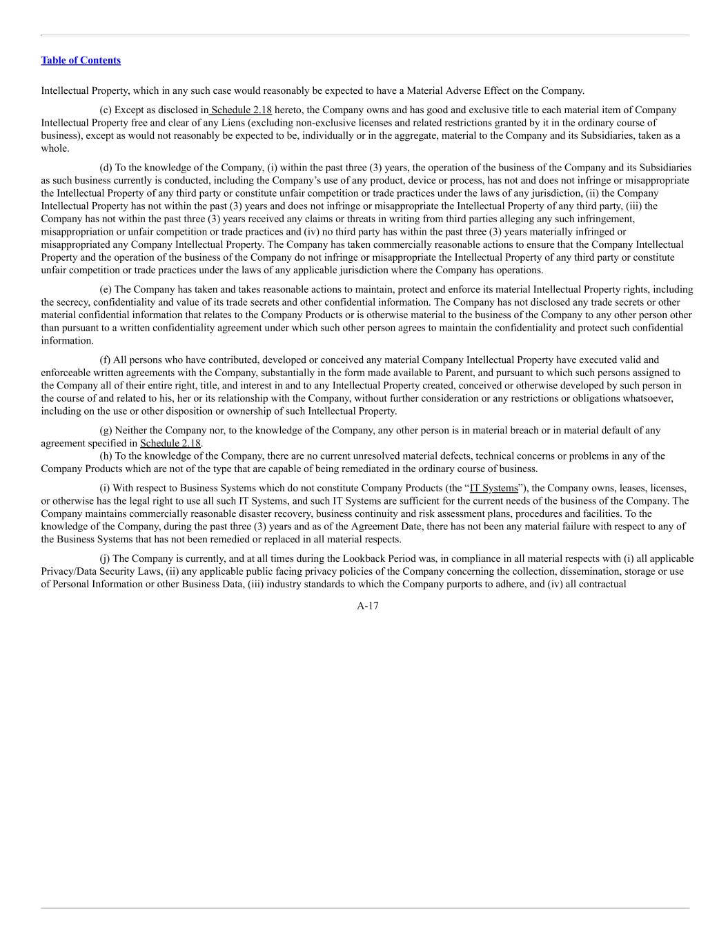 Table of Contents Intellectual Property, which in any such case would reasonably be expected to have a Material Adverse Effect on the Company. (c) Except as disclosed in Schedule 2.18 hereto, the Company owns and has good and exclusive title to each material item of Company Intellectual Property free and clear of any Liens (excluding non-exclusive licenses and related restrictions granted by it in the ordinary course of business), except as would not reasonably be expected to be, individually or in the aggregate, material to the Company and its Subsidiaries, taken as a whole. (d) To the knowledge of the Company, (i) within the past three (3) years, the operation of the business of the Company and its Subsidiaries as such business currently is conducted, including the Company’s use of any product, device or process, has not and does not infringe or misappropriate the Intellectual Property of any third party or constitute unfair competition or trade practices under the laws of any jurisdiction, (ii) the Company Intellectual Property has not within the past (3) years and does not infringe or misappropriate the Intellectual Property of any third party, (iii) the Company has not within the past three (3) years received any claims or threats in writing from third parties alleging any such infringement, misappropriation or unfair competition or trade practices and (iv) no third party has within the past three (3) years materially infringed or misappropriated any Company Intellectual Property. The Company has taken commercially reasonable actions to ensure that the Company Intellectual Property and the operation of the business of the Company do not infringe or misappropriate the Intellectual Property of any third party or constitute unfair competition or trade practices under the laws of any applicable jurisdiction where the Company has operations. (e) The Company has taken and takes reasonable actions to maintain, protect and enforce its material Intellectual Property rights, including the secrecy, confidentiality and value of its trade secrets and other confidential information. The Company has not disclosed any trade secrets or other material confidential information that relates to the Company Products or is otherwise material to the business of the Company to any other person other than pursuant to a written confidentiality agreement under which such other person agrees to maintain the confidentiality and protect such confidential information. (f) All persons who have contributed, developed or conceived any material Company Intellectual Property have executed valid and enforceable written agreements with the Company, substantially in the form made available to Parent, and pursuant to which such persons assigned to the Company all of their entire right, title, and interest in and to any Intellectual Property created, conceived or otherwise developed by such person in the course of and related to his, her or its relationship with the Company, without further consideration or any restrictions or obligations whatsoever, including on the use or other disposition or ownership of such Intellectual Property. (g) Neither the Company nor, to the knowledge of the Company, any other person is in material breach or in material default of any agreement specified in Schedule 2.18. (h) To the knowledge of the Company, there are no current unresolved material defects, technical concerns or problems in any of the Company Products which are not of the type that are capable of being remediated in the ordinary course of business. (i) With respect to Business Systems which do not constitute Company Products (the “IT Systems”), the Company owns, leases, licenses, or otherwise has the legal right to use all such IT Systems, and such IT Systems are sufficient for the current needs of the business of the Company. The Company maintains commercially reasonable disaster recovery, business continuity and risk assessment plans, procedures and facilities. To the knowledge of the Company, during the past three (3) years and as of the Agreement Date, there has not been any material failure with respect to any of the Business Systems that has not been remedied or replaced in all material respects. (j) The Company is currently, and at all times during the Lookback Period was, in compliance in all material respects with (i) all applicable Privacy/Data Security Laws, (ii) any applicable public facing privacy policies of the Company concerning the collection, dissemination, storage or use of Personal Information or other Business Data, (iii) industry standards to which the Company purports to adhere, and (iv) all contractual   A-17