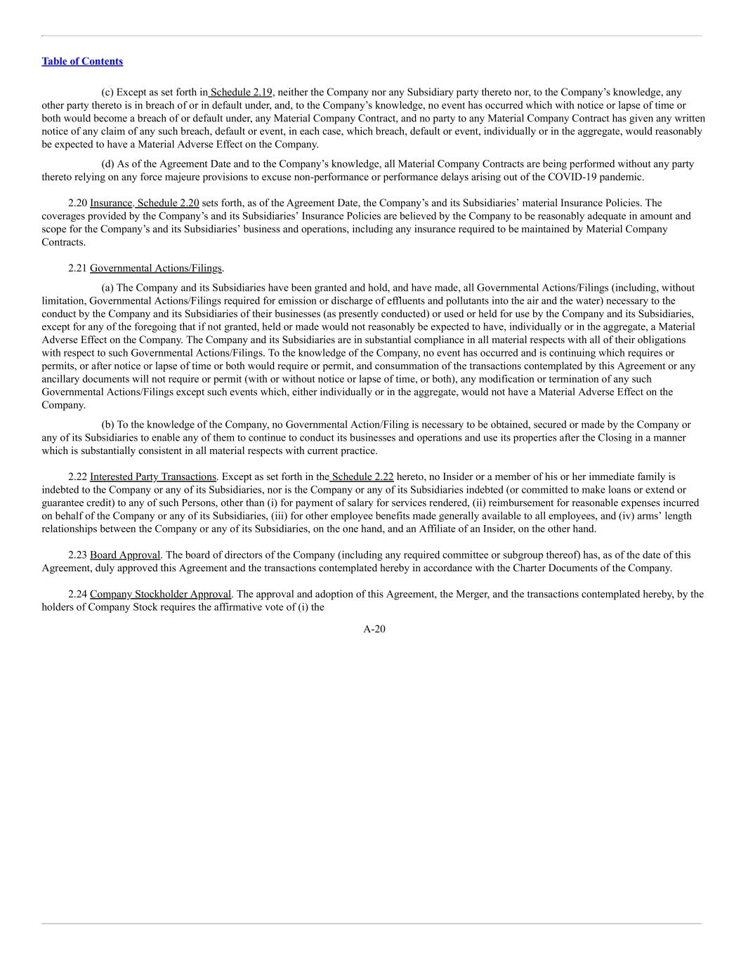 Table of Contents (c) Except as set forth in Schedule 2.19, neither the Company nor any Subsidiary party thereto nor, to the Company’s knowledge, any other party thereto is in breach of or in default under, and, to the Company’s knowledge, no event has occurred which with notice or lapse of time or both would become a breach of or default under, any Material Company Contract, and no party to any Material Company Contract has given any written notice of any claim of any such breach, default or event, in each case, which breach, default or event, individually or in the aggregate, would reasonably be expected to have a Material Adverse Effect on the Company. (d) As of the Agreement Date and to the Company’s knowledge, all Material Company Contracts are being performed without any party thereto relying on any force majeure provisions to excuse non-performance or performance delays arising out of the COVID-19 pandemic. 2.20 Insurance. Schedule 2.20 sets forth, as of the Agreement Date, the Company’s and its Subsidiaries’ material Insurance Policies. The coverages provided by the Company’s and its Subsidiaries’ Insurance Policies are believed by the Company to be reasonably adequate in amount and scope for the Company’s and its Subsidiaries’ business and operations, including any insurance required to be maintained by Material Company Contracts. 2.21 Governmental Actions/Filings. (a) The Company and its Subsidiaries have been granted and hold, and have made, all Governmental Actions/Filings (including, without limitation, Governmental Actions/Filings required for emission or discharge of effluents and pollutants into the air and the water) necessary to the conduct by the Company and its Subsidiaries of their businesses (as presently conducted) or used or held for use by the Company and its Subsidiaries, except for any of the foregoing that if not granted, held or made would not reasonably be expected to have, individually or in the aggregate, a Material Adverse Effect on the Company. The Company and its Subsidiaries are in substantial compliance in all material respects with all of their obligations with respect to such Governmental Actions/Filings. To the knowledge of the Company, no event has occurred and is continuing which requires or permits, or after notice or lapse of time or both would require or permit, and consummation of the transactions contemplated by this Agreement or any ancillary documents will not require or permit (with or without notice or lapse of time, or both), any modification or termination of any such Governmental Actions/Filings except such events which, either individually or in the aggregate, would not have a Material Adverse Effect on the Company. (b) To the knowledge of the Company, no Governmental Action/Filing is necessary to be obtained, secured or made by the Company or any of its Subsidiaries to enable any of them to continue to conduct its businesses and operations and use its properties after the Closing in a manner which is substantially consistent in all material respects with current practice. 2.22 Interested Party Transactions. Except as set forth in the Schedule 2.22 hereto, no Insider or a member of his or her immediate family is indebted to the Company or any of its Subsidiaries, nor is the Company or any of its Subsidiaries indebted (or committed to make loans or extend or guarantee credit) to any of such Persons, other than (i) for payment of salary for services rendered, (ii) reimbursement for reasonable expenses incurred on behalf of the Company or any of its Subsidiaries, (iii) for other employee benefits made generally available to all employees, and (iv) arms’ length relationships between the Company or any of its Subsidiaries, on the one hand, and an Affiliate of an Insider, on the other hand. 2.23 Board Approval. The board of directors of the Company (including any required committee or subgroup thereof) has, as of the date of this Agreement, duly approved this Agreement and the transactions contemplated hereby in accordance with the Charter Documents of the Company. 2.24 Company Stockholder Approval. The approval and adoption of this Agreement, the Merger, and the transactions contemplated hereby, by the holders of Company Stock requires the affirmative vote of (i) the   A-20