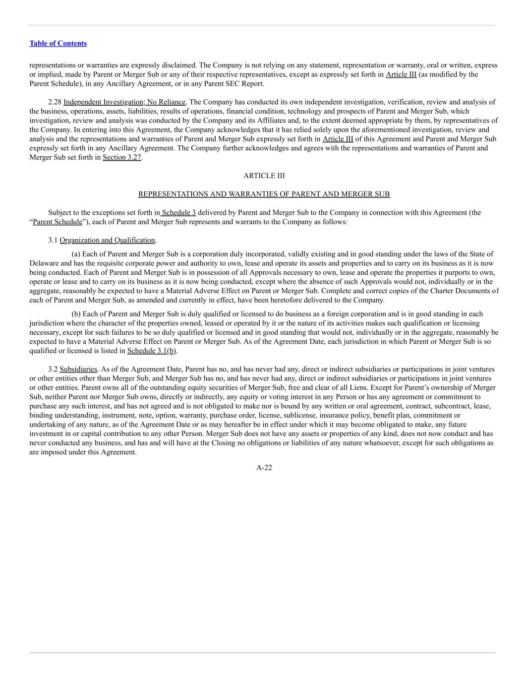 Table of Contents representations or warranties are expressly disclaimed. The Company is not relying on any statement, representation or warranty, oral or written, express or implied, made by Parent or Merger Sub or any of their respective representatives, except as expressly set forth in Article III (as modified by the Parent Schedule), in any Ancillary Agreement, or in any Parent SEC Report. 2.28 Independent Investigation; No Reliance. The Company has conducted its own independent investigation, verification, review and analysis of the business, operations, assets, liabilities, results of operations, financial condition, technology and prospects of Parent and Merger Sub, which investigation, review and analysis was conducted by the Company and its Affiliates and, to the extent deemed appropriate by them, by representatives of the Company. In entering into this Agreement, the Company acknowledges that it has relied solely upon the aforementioned investigation, review and analysis and the representations and warranties of Parent and Merger Sub expressly set forth in Article III of this Agreement and Parent and Merger Sub expressly set forth in any Ancillary Agreement. The Company further acknowledges and agrees with the representations and warranties of Parent and Merger Sub set forth in Section 3.27. ARTICLE III REPRESENTATIONS AND WARRANTIES OF PARENT AND MERGER SUB Subject to the exceptions set forth in Schedule 3 delivered by Parent and Merger Sub to the Company in connection with this Agreement (the “Parent Schedule”), each of Parent and Merger Sub represents and warrants to the Company as follows: 3.1 Organization and Qualification. (a) Each of Parent and Merger Sub is a corporation duly incorporated, validly existing and in good standing under the laws of the State of Delaware and has the requisite corporate power and authority to own, lease and operate its assets and properties and to carry on its business as it is now being conducted. Each of Parent and Merger Sub is in possession of all Approvals necessary to own, lease and operate the properties it purports to own, operate or lease and to carry on its business as it is now being conducted, except where the absence of such Approvals would not, individually or in the aggregate, reasonably be expected to have a Material Adverse Effect on Parent or Merger Sub. Complete and correct copies of the Charter Documents of each of Parent and Merger Sub, as amended and currently in effect, have been heretofore delivered to the Company. (b) Each of Parent and Merger Sub is duly qualified or licensed to do business as a foreign corporation and is in good standing in each jurisdiction where the character of the properties owned, leased or operated by it or the nature of its activities makes such qualification or licensing necessary, except for such failures to be so duly qualified or licensed and in good standing that would not, individually or in the aggregate, reasonably be expected to have a Material Adverse Effect on Parent or Merger Sub. As of the Agreement Date, each jurisdiction in which Parent or Merger Sub is so qualified or licensed is listed in Schedule 3.1(b). 3.2 Subsidiaries. As of the Agreement Date, Parent has no, and has never had any, direct or indirect subsidiaries or participations in joint ventures or other entities other than Merger Sub, and Merger Sub has no, and has never had any, direct or indirect subsidiaries or participations in joint ventures or other entities. Parent owns all of the outstanding equity securities of Merger Sub, free and clear of all Liens. Except for Parent’s ownership of Merger Sub, neither Parent nor Merger Sub owns, directly or indirectly, any equity or voting interest in any Person or has any agreement or commitment to purchase any such interest, and has not agreed and is not obligated to make nor is bound by any written or oral agreement, contract, subcontract, lease, binding understanding, instrument, note, option, warranty, purchase order, license, sublicense, insurance policy, benefit plan, commitment or undertaking of any nature, as of the Agreement Date or as may hereafter be in effect under which it may become obligated to make, any future investment in or capital contribution to any other Person. Merger Sub does not have any assets or properties of any kind, does not now conduct and has never conducted any business, and has and will have at the Closing no obligations or liabilities of any nature whatsoever, except for such obligations as are imposed under this Agreement.   A-22