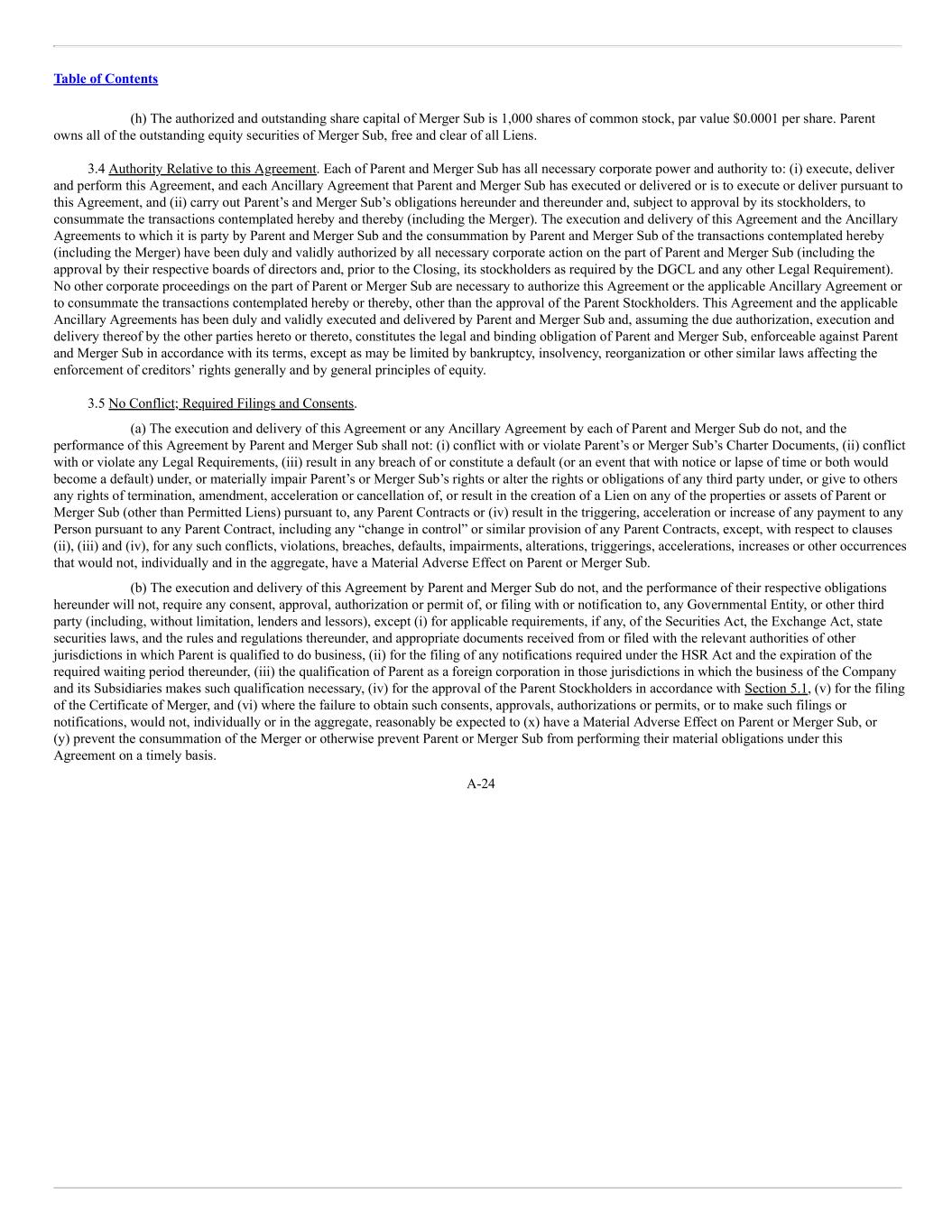 Table of Contents (h) The authorized and outstanding share capital of Merger Sub is 1,000 shares of common stock, par value $0.0001 per share. Parent owns all of the outstanding equity securities of Merger Sub, free and clear of all Liens. 3.4 Authority Relative to this Agreement. Each of Parent and Merger Sub has all necessary corporate power and authority to: (i) execute, deliver and perform this Agreement, and each Ancillary Agreement that Parent and Merger Sub has executed or delivered or is to execute or deliver pursuant to this Agreement, and (ii) carry out Parent’s and Merger Sub’s obligations hereunder and thereunder and, subject to approval by its stockholders, to consummate the transactions contemplated hereby and thereby (including the Merger). The execution and delivery of this Agreement and the Ancillary Agreements to which it is party by Parent and Merger Sub and the consummation by Parent and Merger Sub of the transactions contemplated hereby (including the Merger) have been duly and validly authorized by all necessary corporate action on the part of Parent and Merger Sub (including the approval by their respective boards of directors and, prior to the Closing, its stockholders as required by the DGCL and any other Legal Requirement). No other corporate proceedings on the part of Parent or Merger Sub are necessary to authorize this Agreement or the applicable Ancillary Agreement or to consummate the transactions contemplated hereby or thereby, other than the approval of the Parent Stockholders. This Agreement and the applicable Ancillary Agreements has been duly and validly executed and delivered by Parent and Merger Sub and, assuming the due authorization, execution and delivery thereof by the other parties hereto or thereto, constitutes the legal and binding obligation of Parent and Merger Sub, enforceable against Parent and Merger Sub in accordance with its terms, except as may be limited by bankruptcy, insolvency, reorganization or other similar laws affecting the enforcement of creditors’ rights generally and by general principles of equity. 3.5 No Conflict; Required Filings and Consents. (a) The execution and delivery of this Agreement or any Ancillary Agreement by each of Parent and Merger Sub do not, and the performance of this Agreement by Parent and Merger Sub shall not: (i) conflict with or violate Parent’s or Merger Sub’s Charter Documents, (ii) conflict with or violate any Legal Requirements, (iii) result in any breach of or constitute a default (or an event that with notice or lapse of time or both would become a default) under, or materially impair Parent’s or Merger Sub’s rights or alter the rights or obligations of any third party under, or give to others any rights of termination, amendment, acceleration or cancellation of, or result in the creation of a Lien on any of the properties or assets of Parent or Merger Sub (other than Permitted Liens) pursuant to, any Parent Contracts or (iv) result in the triggering, acceleration or increase of any payment to any Person pursuant to any Parent Contract, including any “change in control” or similar provision of any Parent Contracts, except, with respect to clauses (ii), (iii) and (iv), for any such conflicts, violations, breaches, defaults, impairments, alterations, triggerings, accelerations, increases or other occurrences that would not, individually and in the aggregate, have a Material Adverse Effect on Parent or Merger Sub. (b) The execution and delivery of this Agreement by Parent and Merger Sub do not, and the performance of their respective obligations hereunder will not, require any consent, approval, authorization or permit of, or filing with or notification to, any Governmental Entity, or other third party (including, without limitation, lenders and lessors), except (i) for applicable requirements, if any, of the Securities Act, the Exchange Act, state securities laws, and the rules and regulations thereunder, and appropriate documents received from or filed with the relevant authorities of other jurisdictions in which Parent is qualified to do business, (ii) for the filing of any notifications required under the HSR Act and the expiration of the required waiting period thereunder, (iii) the qualification of Parent as a foreign corporation in those jurisdictions in which the business of the Company and its Subsidiaries makes such qualification necessary, (iv) for the approval of the Parent Stockholders in accordance with Section 5.1, (v) for the filing of the Certificate of Merger, and (vi) where the failure to obtain such consents, approvals, authorizations or permits, or to make such filings or notifications, would not, individually or in the aggregate, reasonably be expected to (x) have a Material Adverse Effect on Parent or Merger Sub, or (y) prevent the consummation of the Merger or otherwise prevent Parent or Merger Sub from performing their material obligations under this Agreement on a timely basis.   A-24