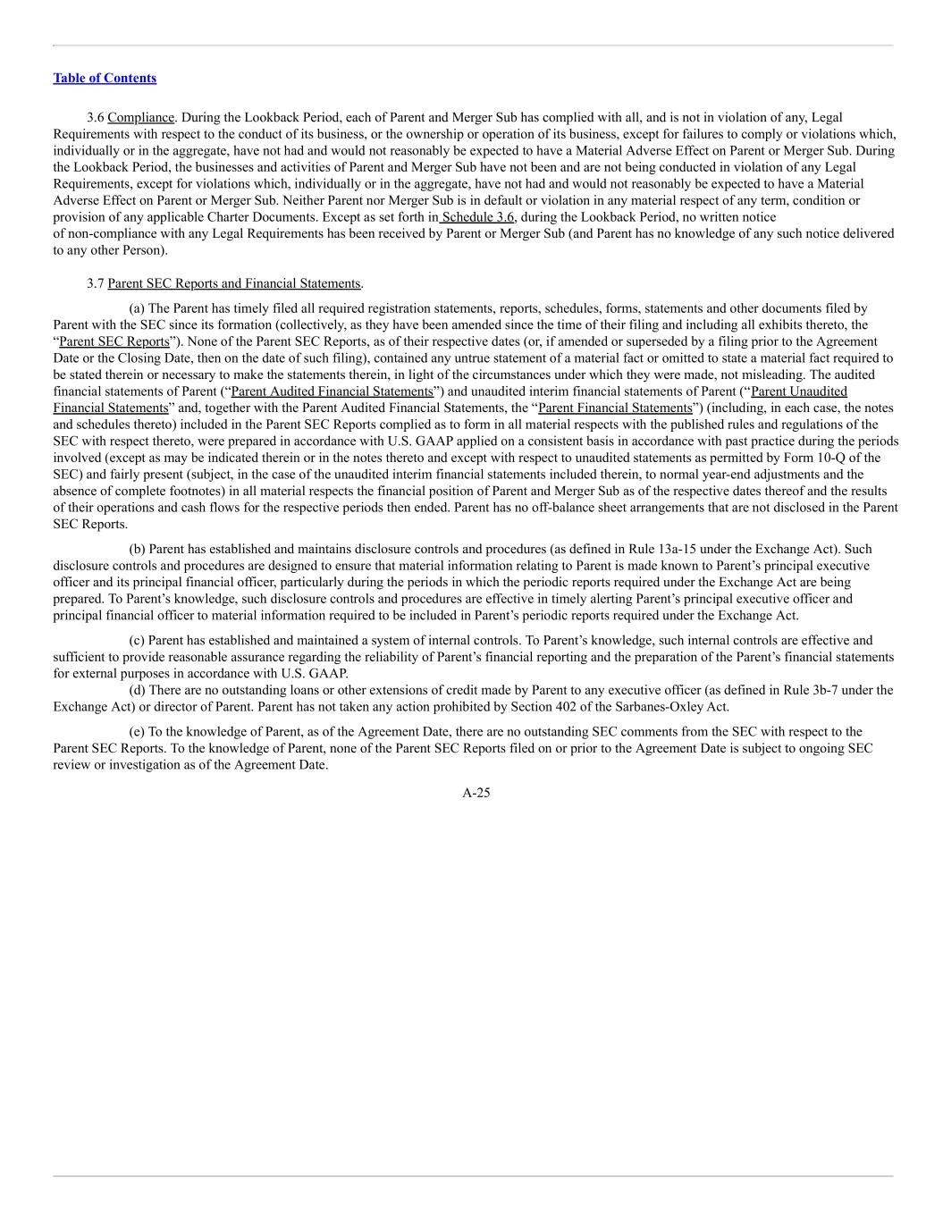 Table of Contents 3.6 Compliance. During the Lookback Period, each of Parent and Merger Sub has complied with all, and is not in violation of any, Legal Requirements with respect to the conduct of its business, or the ownership or operation of its business, except for failures to comply or violations which, individually or in the aggregate, have not had and would not reasonably be expected to have a Material Adverse Effect on Parent or Merger Sub. During the Lookback Period, the businesses and activities of Parent and Merger Sub have not been and are not being conducted in violation of any Legal Requirements, except for violations which, individually or in the aggregate, have not had and would not reasonably be expected to have a Material Adverse Effect on Parent or Merger Sub. Neither Parent nor Merger Sub is in default or violation in any material respect of any term, condition or provision of any applicable Charter Documents. Except as set forth in Schedule 3.6, during the Lookback Period, no written notice of non-compliance with any Legal Requirements has been received by Parent or Merger Sub (and Parent has no knowledge of any such notice delivered to any other Person). 3.7 Parent SEC Reports and Financial Statements. (a) The Parent has timely filed all required registration statements, reports, schedules, forms, statements and other documents filed by Parent with the SEC since its formation (collectively, as they have been amended since the time of their filing and including all exhibits thereto, the “Parent SEC Reports”). None of the Parent SEC Reports, as of their respective dates (or, if amended or superseded by a filing prior to the Agreement Date or the Closing Date, then on the date of such filing), contained any untrue statement of a material fact or omitted to state a material fact required to be stated therein or necessary to make the statements therein, in light of the circumstances under which they were made, not misleading. The audited financial statements of Parent (“Parent Audited Financial Statements”) and unaudited interim financial statements of Parent (“Parent Unaudited Financial Statements” and, together with the Parent Audited Financial Statements, the “Parent Financial Statements”) (including, in each case, the notes and schedules thereto) included in the Parent SEC Reports complied as to form in all material respects with the published rules and regulations of the SEC with respect thereto, were prepared in accordance with U.S. GAAP applied on a consistent basis in accordance with past practice during the periods involved (except as may be indicated therein or in the notes thereto and except with respect to unaudited statements as permitted by Form 10-Q of the SEC) and fairly present (subject, in the case of the unaudited interim financial statements included therein, to normal year-end adjustments and the absence of complete footnotes) in all material respects the financial position of Parent and Merger Sub as of the respective dates thereof and the results of their operations and cash flows for the respective periods then ended. Parent has no off-balance sheet arrangements that are not disclosed in the Parent SEC Reports. (b) Parent has established and maintains disclosure controls and procedures (as defined in Rule 13a-15 under the Exchange Act). Such disclosure controls and procedures are designed to ensure that material information relating to Parent is made known to Parent’s principal executive officer and its principal financial officer, particularly during the periods in which the periodic reports required under the Exchange Act are being prepared. To Parent’s knowledge, such disclosure controls and procedures are effective in timely alerting Parent’s principal executive officer and principal financial officer to material information required to be included in Parent’s periodic reports required under the Exchange Act. (c) Parent has established and maintained a system of internal controls. To Parent’s knowledge, such internal controls are effective and sufficient to provide reasonable assurance regarding the reliability of Parent’s financial reporting and the preparation of the Parent’s financial statements for external purposes in accordance with U.S. GAAP. (d) There are no outstanding loans or other extensions of credit made by Parent to any executive officer (as defined in Rule 3b-7 under the Exchange Act) or director of Parent. Parent has not taken any action prohibited by Section 402 of the Sarbanes-Oxley Act. (e) To the knowledge of Parent, as of the Agreement Date, there are no outstanding SEC comments from the SEC with respect to the Parent SEC Reports. To the knowledge of Parent, none of the Parent SEC Reports filed on or prior to the Agreement Date is subject to ongoing SEC review or investigation as of the Agreement Date.   A-25
