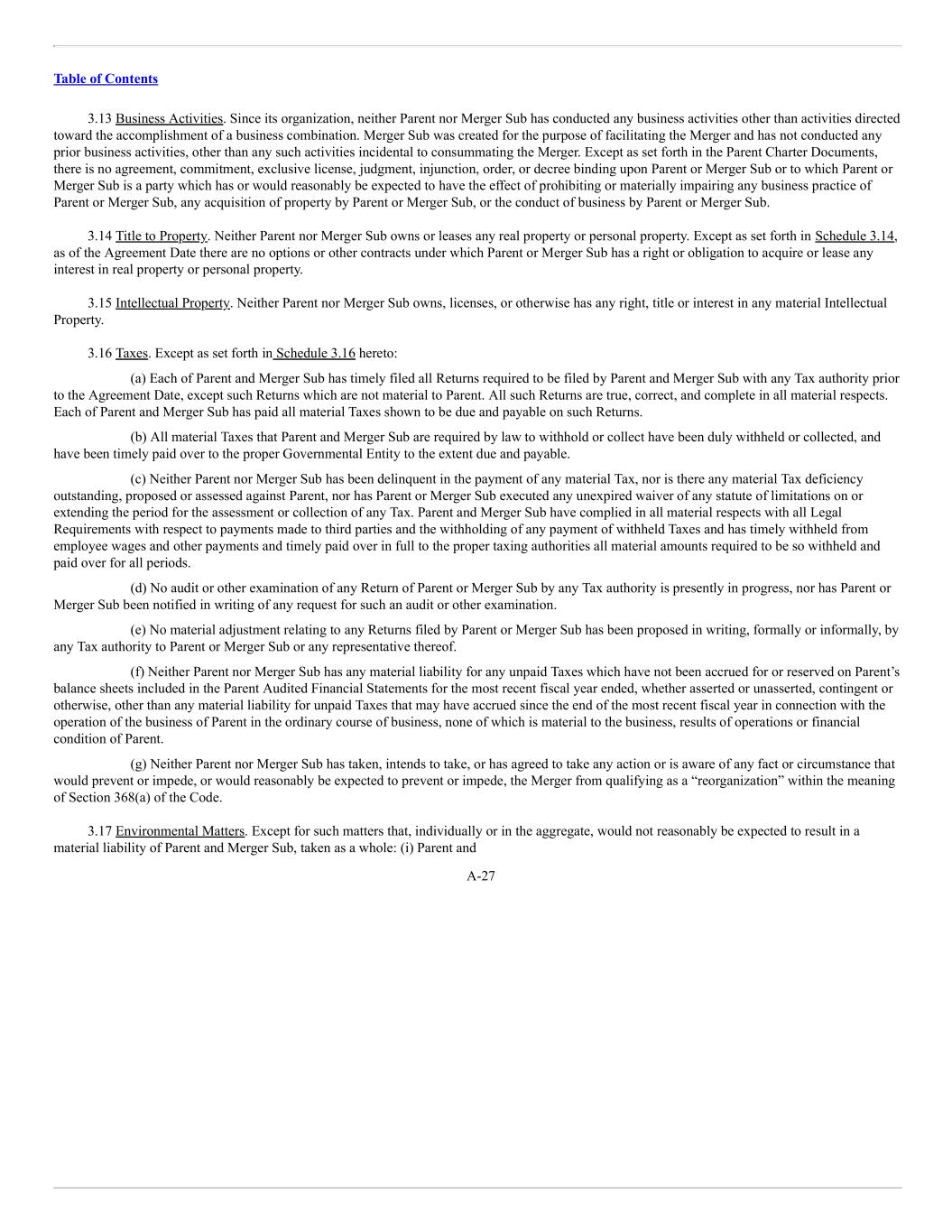 Table of Contents 3.13 Business Activities. Since its organization, neither Parent nor Merger Sub has conducted any business activities other than activities directed toward the accomplishment of a business combination. Merger Sub was created for the purpose of facilitating the Merger and has not conducted any prior business activities, other than any such activities incidental to consummating the Merger. Except as set forth in the Parent Charter Documents, there is no agreement, commitment, exclusive license, judgment, injunction, order, or decree binding upon Parent or Merger Sub or to which Parent or Merger Sub is a party which has or would reasonably be expected to have the effect of prohibiting or materially impairing any business practice of Parent or Merger Sub, any acquisition of property by Parent or Merger Sub, or the conduct of business by Parent or Merger Sub. 3.14 Title to Property. Neither Parent nor Merger Sub owns or leases any real property or personal property. Except as set forth in Schedule 3.14, as of the Agreement Date there are no options or other contracts under which Parent or Merger Sub has a right or obligation to acquire or lease any interest in real property or personal property. 3.15 Intellectual Property. Neither Parent nor Merger Sub owns, licenses, or otherwise has any right, title or interest in any material Intellectual Property. 3.16 Taxes. Except as set forth in Schedule 3.16 hereto: (a) Each of Parent and Merger Sub has timely filed all Returns required to be filed by Parent and Merger Sub with any Tax authority prior to the Agreement Date, except such Returns which are not material to Parent. All such Returns are true, correct, and complete in all material respects. Each of Parent and Merger Sub has paid all material Taxes shown to be due and payable on such Returns. (b) All material Taxes that Parent and Merger Sub are required by law to withhold or collect have been duly withheld or collected, and have been timely paid over to the proper Governmental Entity to the extent due and payable. (c) Neither Parent nor Merger Sub has been delinquent in the payment of any material Tax, nor is there any material Tax deficiency outstanding, proposed or assessed against Parent, nor has Parent or Merger Sub executed any unexpired waiver of any statute of limitations on or extending the period for the assessment or collection of any Tax. Parent and Merger Sub have complied in all material respects with all Legal Requirements with respect to payments made to third parties and the withholding of any payment of withheld Taxes and has timely withheld from employee wages and other payments and timely paid over in full to the proper taxing authorities all material amounts required to be so withheld and paid over for all periods. (d) No audit or other examination of any Return of Parent or Merger Sub by any Tax authority is presently in progress, nor has Parent or Merger Sub been notified in writing of any request for such an audit or other examination. (e) No material adjustment relating to any Returns filed by Parent or Merger Sub has been proposed in writing, formally or informally, by any Tax authority to Parent or Merger Sub or any representative thereof. (f) Neither Parent nor Merger Sub has any material liability for any unpaid Taxes which have not been accrued for or reserved on Parent’s balance sheets included in the Parent Audited Financial Statements for the most recent fiscal year ended, whether asserted or unasserted, contingent or otherwise, other than any material liability for unpaid Taxes that may have accrued since the end of the most recent fiscal year in connection with the operation of the business of Parent in the ordinary course of business, none of which is material to the business, results of operations or financial condition of Parent. (g) Neither Parent nor Merger Sub has taken, intends to take, or has agreed to take any action or is aware of any fact or circumstance that would prevent or impede, or would reasonably be expected to prevent or impede, the Merger from qualifying as a “reorganization” within the meaning of Section 368(a) of the Code. 3.17 Environmental Matters. Except for such matters that, individually or in the aggregate, would not reasonably be expected to result in a material liability of Parent and Merger Sub, taken as a whole: (i) Parent and   A-27