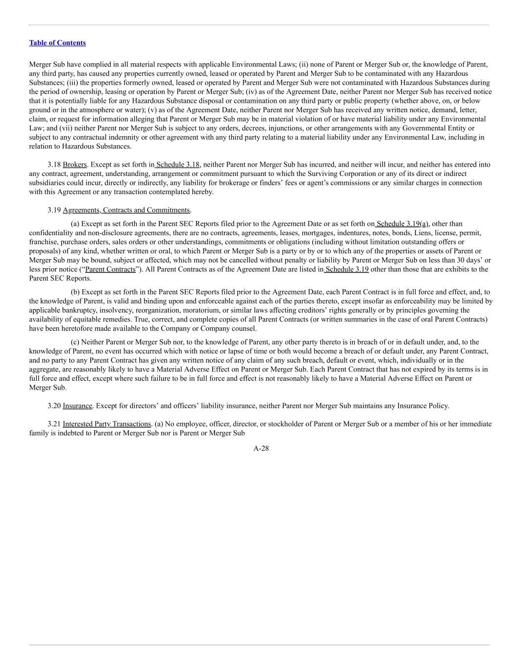 Table of Contents Merger Sub have complied in all material respects with applicable Environmental Laws; (ii) none of Parent or Merger Sub or, the knowledge of Parent, any third party, has caused any properties currently owned, leased or operated by Parent and Merger Sub to be contaminated with any Hazardous Substances; (iii) the properties formerly owned, leased or operated by Parent and Merger Sub were not contaminated with Hazardous Substances during the period of ownership, leasing or operation by Parent or Merger Sub; (iv) as of the Agreement Date, neither Parent nor Merger Sub has received notice that it is potentially liable for any Hazardous Substance disposal or contamination on any third party or public property (whether above, on, or below ground or in the atmosphere or water); (v) as of the Agreement Date, neither Parent nor Merger Sub has received any written notice, demand, letter, claim, or request for information alleging that Parent or Merger Sub may be in material violation of or have material liability under any Environmental Law; and (vii) neither Parent nor Merger Sub is subject to any orders, decrees, injunctions, or other arrangements with any Governmental Entity or subject to any contractual indemnity or other agreement with any third party relating to a material liability under any Environmental Law, including in relation to Hazardous Substances. 3.18 Brokers. Except as set forth in Schedule 3.18, neither Parent nor Merger Sub has incurred, and neither will incur, and neither has entered into any contract, agreement, understanding, arrangement or commitment pursuant to which the Surviving Corporation or any of its direct or indirect subsidiaries could incur, directly or indirectly, any liability for brokerage or finders’ fees or agent’s commissions or any similar charges in connection with this Agreement or any transaction contemplated hereby. 3.19 Agreements, Contracts and Commitments. (a) Except as set forth in the Parent SEC Reports filed prior to the Agreement Date or as set forth on Schedule 3.19(a), other than confidentiality and non-disclosure agreements, there are no contracts, agreements, leases, mortgages, indentures, notes, bonds, Liens, license, permit, franchise, purchase orders, sales orders or other understandings, commitments or obligations (including without limitation outstanding offers or proposals) of any kind, whether written or oral, to which Parent or Merger Sub is a party or by or to which any of the properties or assets of Parent or Merger Sub may be bound, subject or affected, which may not be cancelled without penalty or liability by Parent or Merger Sub on less than 30 days’ or less prior notice (“Parent Contracts”). All Parent Contracts as of the Agreement Date are listed in Schedule 3.19 other than those that are exhibits to the Parent SEC Reports. (b) Except as set forth in the Parent SEC Reports filed prior to the Agreement Date, each Parent Contract is in full force and effect, and, to the knowledge of Parent, is valid and binding upon and enforceable against each of the parties thereto, except insofar as enforceability may be limited by applicable bankruptcy, insolvency, reorganization, moratorium, or similar laws affecting creditors’ rights generally or by principles governing the availability of equitable remedies. True, correct, and complete copies of all Parent Contracts (or written summaries in the case of oral Parent Contracts) have been heretofore made available to the Company or Company counsel. (c) Neither Parent or Merger Sub nor, to the knowledge of Parent, any other party thereto is in breach of or in default under, and, to the knowledge of Parent, no event has occurred which with notice or lapse of time or both would become a breach of or default under, any Parent Contract, and no party to any Parent Contract has given any written notice of any claim of any such breach, default or event, which, individually or in the aggregate, are reasonably likely to have a Material Adverse Effect on Parent or Merger Sub. Each Parent Contract that has not expired by its terms is in full force and effect, except where such failure to be in full force and effect is not reasonably likely to have a Material Adverse Effect on Parent or Merger Sub. 3.20 Insurance. Except for directors’ and officers’ liability insurance, neither Parent nor Merger Sub maintains any Insurance Policy. 3.21 Interested Party Transactions. (a) No employee, officer, director, or stockholder of Parent or Merger Sub or a member of his or her immediate family is indebted to Parent or Merger Sub nor is Parent or Merger Sub   A-28