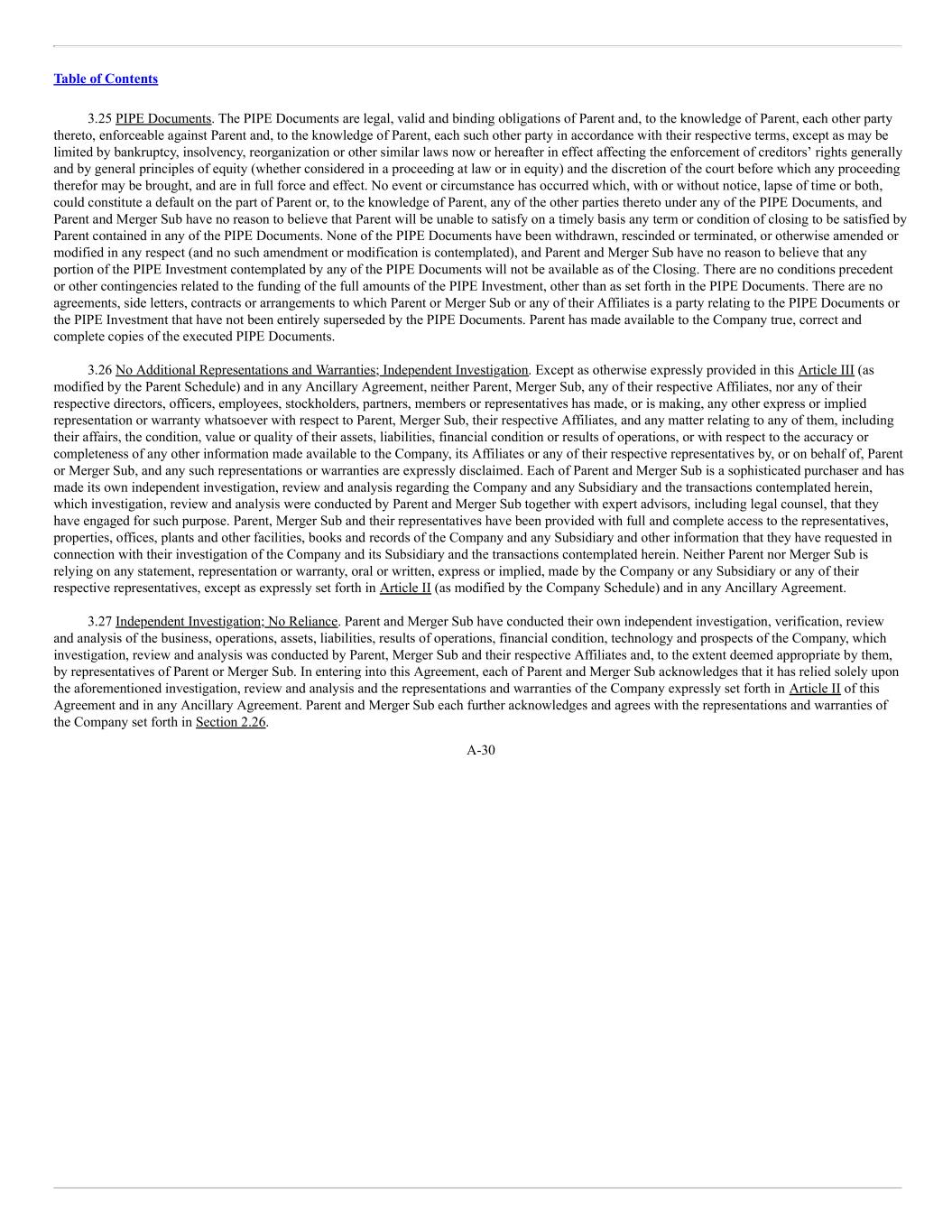 Table of Contents 3.25 PIPE Documents. The PIPE Documents are legal, valid and binding obligations of Parent and, to the knowledge of Parent, each other party thereto, enforceable against Parent and, to the knowledge of Parent, each such other party in accordance with their respective terms, except as may be limited by bankruptcy, insolvency, reorganization or other similar laws now or hereafter in effect affecting the enforcement of creditors’ rights generally and by general principles of equity (whether considered in a proceeding at law or in equity) and the discretion of the court before which any proceeding therefor may be brought, and are in full force and effect. No event or circumstance has occurred which, with or without notice, lapse of time or both, could constitute a default on the part of Parent or, to the knowledge of Parent, any of the other parties thereto under any of the PIPE Documents, and Parent and Merger Sub have no reason to believe that Parent will be unable to satisfy on a timely basis any term or condition of closing to be satisfied by Parent contained in any of the PIPE Documents. None of the PIPE Documents have been withdrawn, rescinded or terminated, or otherwise amended or modified in any respect (and no such amendment or modification is contemplated), and Parent and Merger Sub have no reason to believe that any portion of the PIPE Investment contemplated by any of the PIPE Documents will not be available as of the Closing. There are no conditions precedent or other contingencies related to the funding of the full amounts of the PIPE Investment, other than as set forth in the PIPE Documents. There are no agreements, side letters, contracts or arrangements to which Parent or Merger Sub or any of their Affiliates is a party relating to the PIPE Documents or the PIPE Investment that have not been entirely superseded by the PIPE Documents. Parent has made available to the Company true, correct and complete copies of the executed PIPE Documents. 3.26 No Additional Representations and Warranties; Independent Investigation. Except as otherwise expressly provided in this Article III (as modified by the Parent Schedule) and in any Ancillary Agreement, neither Parent, Merger Sub, any of their respective Affiliates, nor any of their respective directors, officers, employees, stockholders, partners, members or representatives has made, or is making, any other express or implied representation or warranty whatsoever with respect to Parent, Merger Sub, their respective Affiliates, and any matter relating to any of them, including their affairs, the condition, value or quality of their assets, liabilities, financial condition or results of operations, or with respect to the accuracy or completeness of any other information made available to the Company, its Affiliates or any of their respective representatives by, or on behalf of, Parent or Merger Sub, and any such representations or warranties are expressly disclaimed. Each of Parent and Merger Sub is a sophisticated purchaser and has made its own independent investigation, review and analysis regarding the Company and any Subsidiary and the transactions contemplated herein, which investigation, review and analysis were conducted by Parent and Merger Sub together with expert advisors, including legal counsel, that they have engaged for such purpose. Parent, Merger Sub and their representatives have been provided with full and complete access to the representatives, properties, offices, plants and other facilities, books and records of the Company and any Subsidiary and other information that they have requested in connection with their investigation of the Company and its Subsidiary and the transactions contemplated herein. Neither Parent nor Merger Sub is relying on any statement, representation or warranty, oral or written, express or implied, made by the Company or any Subsidiary or any of their respective representatives, except as expressly set forth in Article II (as modified by the Company Schedule) and in any Ancillary Agreement. 3.27 Independent Investigation; No Reliance. Parent and Merger Sub have conducted their own independent investigation, verification, review and analysis of the business, operations, assets, liabilities, results of operations, financial condition, technology and prospects of the Company, which investigation, review and analysis was conducted by Parent, Merger Sub and their respective Affiliates and, to the extent deemed appropriate by them, by representatives of Parent or Merger Sub. In entering into this Agreement, each of Parent and Merger Sub acknowledges that it has relied solely upon the aforementioned investigation, review and analysis and the representations and warranties of the Company expressly set forth in Article II of this Agreement and in any Ancillary Agreement. Parent and Merger Sub each further acknowledges and agrees with the representations and warranties of the Company set forth in Section 2.26.   A-30