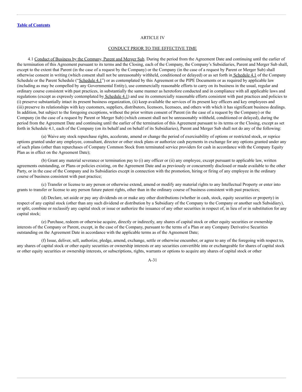 Table of Contents ARTICLE IV CONDUCT PRIOR TO THE EFFECTIVE TIME 4.1 Conduct of Business by the Company, Parent and Merger Sub. During the period from the Agreement Date and continuing until the earlier of the termination of this Agreement pursuant to its terms and the Closing, each of the Company, the Company’s Subsidiaries, Parent and Merger Sub shall, except to the extent that Parent (in the case of a request by the Company) or the Company (in the case of a request by Parent or Merger Sub) shall otherwise consent in writing (which consent shall not be unreasonably withheld, conditioned or delayed) or as set forth in Schedule 4.1 of the Company Schedule or the Parent Schedule (“Schedule 4.1”) or as contemplated by this Agreement or the PIPE Documents or as required by applicable law (including as may be compelled by any Governmental Entity), use commercially reasonable efforts to carry on its business in the usual, regular and ordinary course consistent with past practices, in substantially the same manner as heretofore conducted and in compliance with all applicable laws and regulations (except as expressly contemplated by Schedule 4.1) and use its commercially reasonable efforts consistent with past practices and policies to (i) preserve substantially intact its present business organization, (ii) keep available the services of its present key officers and key employees and (iii) preserve its relationships with key customers, suppliers, distributors, licensors, licensees, and others with which it has significant business dealings. In addition, but subject to the foregoing exceptions, without the prior written consent of Parent (in the case of a request by the Company) or the Company (in the case of a request by Parent or Merger Sub) (which consent shall not be unreasonably withheld, conditioned or delayed), during the period from the Agreement Date and continuing until the earlier of the termination of this Agreement pursuant to its terms or the Closing, except as set forth in Schedule 4.1, each of the Company (on its behalf and on behalf of its Subsidiaries), Parent and Merger Sub shall not do any of the following: (a) Waive any stock repurchase rights, accelerate, amend or change the period of exercisability of options or restricted stock, or reprice options granted under any employee, consultant, director or other stock plans or authorize cash payments in exchange for any options granted under any of such plans (other than repurchases of Company Common Stock from terminated service providers for cash in accordance with the Company Equity Plan as in effect on the Agreement Date); (b) Grant any material severance or termination pay to (i) any officer or (ii) any employee, except pursuant to applicable law, written agreements outstanding, or Plans or policies existing, on the Agreement Date and as previously or concurrently disclosed or made available to the other Party, or in the case of the Company and its Subsidiaries except in connection with the promotion, hiring or firing of any employee in the ordinary course of business consistent with past practice; (c) Transfer or license to any person or otherwise extend, amend or modify any material rights to any Intellectual Property or enter into grants to transfer or license to any person future patent rights, other than in the ordinary course of business consistent with past practices; (d) Declare, set aside or pay any dividends on or make any other distributions (whether in cash, stock, equity securities or property) in respect of any capital stock (other than any such dividend or distribution by a Subsidiary of the Company to the Company or another such Subsidiary), or split, combine or reclassify any capital stock or issue or authorize the issuance of any other securities in respect of, in lieu of or in substitution for any capital stock; (e) Purchase, redeem or otherwise acquire, directly or indirectly, any shares of capital stock or other equity securities or ownership interests of the Company or Parent, except, in the case of the Company, pursuant to the terms of a Plan or any Company Derivative Securities outstanding on the Agreement Date in accordance with the applicable terms as of the Agreement Date; (f) Issue, deliver, sell, authorize, pledge, amend, exchange, settle or otherwise encumber, or agree to any of the foregoing with respect to, any shares of capital stock or other equity securities or ownership interests or any securities convertible into or exchangeable for shares of capital stock or other equity securities or ownership interests, or subscriptions, rights, warrants or options to acquire any shares of capital stock or other   A-31