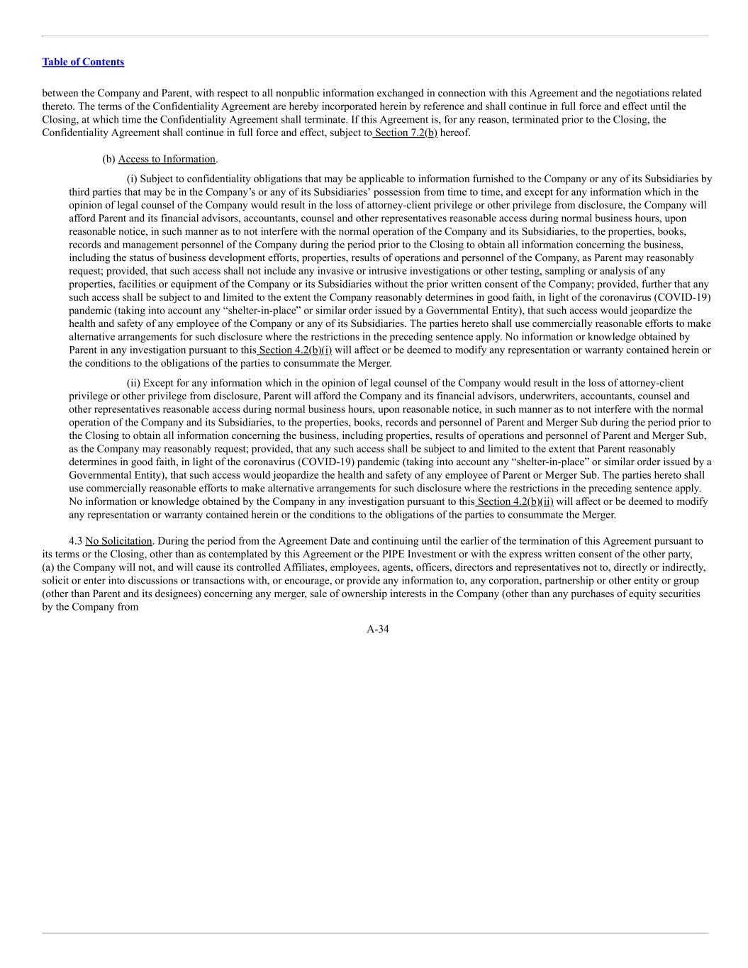Table of Contents between the Company and Parent, with respect to all nonpublic information exchanged in connection with this Agreement and the negotiations related thereto. The terms of the Confidentiality Agreement are hereby incorporated herein by reference and shall continue in full force and effect until the Closing, at which time the Confidentiality Agreement shall terminate. If this Agreement is, for any reason, terminated prior to the Closing, the Confidentiality Agreement shall continue in full force and effect, subject to Section 7.2(b) hereof. (b) Access to Information. (i) Subject to confidentiality obligations that may be applicable to information furnished to the Company or any of its Subsidiaries by third parties that may be in the Company’s or any of its Subsidiaries’ possession from time to time, and except for any information which in the opinion of legal counsel of the Company would result in the loss of attorney-client privilege or other privilege from disclosure, the Company will afford Parent and its financial advisors, accountants, counsel and other representatives reasonable access during normal business hours, upon reasonable notice, in such manner as to not interfere with the normal operation of the Company and its Subsidiaries, to the properties, books, records and management personnel of the Company during the period prior to the Closing to obtain all information concerning the business, including the status of business development efforts, properties, results of operations and personnel of the Company, as Parent may reasonably request; provided, that such access shall not include any invasive or intrusive investigations or other testing, sampling or analysis of any properties, facilities or equipment of the Company or its Subsidiaries without the prior written consent of the Company; provided, further that any such access shall be subject to and limited to the extent the Company reasonably determines in good faith, in light of the coronavirus (COVID-19) pandemic (taking into account any “shelter-in-place” or similar order issued by a Governmental Entity), that such access would jeopardize the health and safety of any employee of the Company or any of its Subsidiaries. The parties hereto shall use commercially reasonable efforts to make alternative arrangements for such disclosure where the restrictions in the preceding sentence apply. No information or knowledge obtained by Parent in any investigation pursuant to this Section 4.2(b)(i) will affect or be deemed to modify any representation or warranty contained herein or the conditions to the obligations of the parties to consummate the Merger. (ii) Except for any information which in the opinion of legal counsel of the Company would result in the loss of attorney-client privilege or other privilege from disclosure, Parent will afford the Company and its financial advisors, underwriters, accountants, counsel and other representatives reasonable access during normal business hours, upon reasonable notice, in such manner as to not interfere with the normal operation of the Company and its Subsidiaries, to the properties, books, records and personnel of Parent and Merger Sub during the period prior to the Closing to obtain all information concerning the business, including properties, results of operations and personnel of Parent and Merger Sub, as the Company may reasonably request; provided, that any such access shall be subject to and limited to the extent that Parent reasonably determines in good faith, in light of the coronavirus (COVID-19) pandemic (taking into account any “shelter-in-place” or similar order issued by a Governmental Entity), that such access would jeopardize the health and safety of any employee of Parent or Merger Sub. The parties hereto shall use commercially reasonable efforts to make alternative arrangements for such disclosure where the restrictions in the preceding sentence apply. No information or knowledge obtained by the Company in any investigation pursuant to this Section 4.2(b)(ii) will affect or be deemed to modify any representation or warranty contained herein or the conditions to the obligations of the parties to consummate the Merger. 4.3 No Solicitation. During the period from the Agreement Date and continuing until the earlier of the termination of this Agreement pursuant to its terms or the Closing, other than as contemplated by this Agreement or the PIPE Investment or with the express written consent of the other party, (a) the Company will not, and will cause its controlled Affiliates, employees, agents, officers, directors and representatives not to, directly or indirectly, solicit or enter into discussions or transactions with, or encourage, or provide any information to, any corporation, partnership or other entity or group (other than Parent and its designees) concerning any merger, sale of ownership interests in the Company (other than any purchases of equity securities by the Company from   A-34