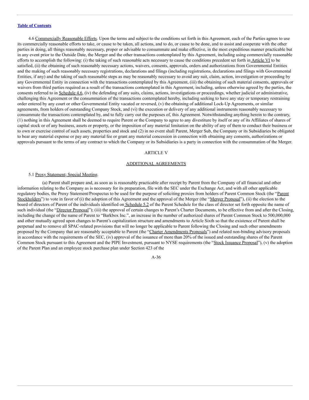 Table of Contents 4.6 Commercially Reasonable Efforts. Upon the terms and subject to the conditions set forth in this Agreement, each of the Parties agrees to use its commercially reasonable efforts to take, or cause to be taken, all actions, and to do, or cause to be done, and to assist and cooperate with the other parties in doing, all things reasonably necessary, proper or advisable to consummate and make effective, in the most expeditious manner practicable but in any event prior to the Outside Date, the Merger and the other transactions contemplated by this Agreement, including using commercially reasonable efforts to accomplish the following: (i) the taking of such reasonable acts necessary to cause the conditions precedent set forth in Article VI to be satisfied, (ii) the obtaining of such reasonably necessary actions, waivers, consents, approvals, orders and authorizations from Governmental Entities and the making of such reasonably necessary registrations, declarations and filings (including registrations, declarations and filings with Governmental Entities, if any) and the taking of such reasonable steps as may be reasonably necessary to avoid any suit, claim, action, investigation or proceeding by any Governmental Entity in connection with the transactions contemplated by this Agreement, (iii) the obtaining of such material consents, approvals or waivers from third parties required as a result of the transactions contemplated in this Agreement, including, unless otherwise agreed by the parties, the consents referred to in Schedule 4.6, (iv) the defending of any suits, claims, actions, investigations or proceedings, whether judicial or administrative, challenging this Agreement or the consummation of the transactions contemplated hereby, including seeking to have any stay or temporary restraining order entered by any court or other Governmental Entity vacated or reversed, (v) the obtaining of additional Lock-Up Agreements, or similar agreements, from holders of outstanding Company Stock, and (vi) the execution or delivery of any additional instruments reasonably necessary to consummate the transactions contemplated by, and to fully carry out the purposes of, this Agreement. Notwithstanding anything herein to the contrary, (1) nothing in this Agreement shall be deemed to require Parent or the Company to agree to any divestiture by itself or any of its Affiliates of shares of capital stock or of any business, assets or property, or the imposition of any material limitation on the ability of any of them to conduct their business or to own or exercise control of such assets, properties and stock and (2) in no event shall Parent, Merger Sub, the Company or its Subsidiaries be obligated to bear any material expense or pay any material fee or grant any material concession in connection with obtaining any consents, authorizations or approvals pursuant to the terms of any contract to which the Company or its Subsidiaries is a party in connection with the consummation of the Merger. ARTICLE V ADDITIONAL AGREEMENTS 5.1 Proxy Statement; Special Meeting. (a) Parent shall prepare and, as soon as is reasonably practicable after receipt by Parent from the Company of all financial and other information relating to the Company as is necessary for its preparation, file with the SEC under the Exchange Act, and with all other applicable regulatory bodies, the Proxy Statement/Prospectus to be used for the purpose of soliciting proxies from holders of Parent Common Stock (the “Parent Stockholders”) to vote in favor of (i) the adoption of this Agreement and the approval of the Merger (the “Merger Proposal”), (ii) the election to the board of directors of Parent of the individuals identified on Schedule 5.2 of the Parent Schedule for the class of director set forth opposite the name of such individual (the “Director Proposal”); (iii) the approval of certain changes to Parent’s Charter Documents, to be effective from and after the Closing, including the change of the name of Parent to “Barkbox Inc.”, an increase in the number of authorized shares of Parent Common Stock to 500,000,000 and other mutually agreed upon changes to Parent’s capitalization structure and amendments to Article Sixth so that the existence of Parent shall be perpetual and to remove all SPAC-related provisions that will no longer be applicable to Parent following the Closing and such other amendments proposed by the Company that are reasonably acceptable to Parent (the “Charter Amendments Proposals”) and related non-binding advisory proposals in accordance with the requirements of the SEC, (iv) approval of the issuance of more than 20% of the issued and outstanding shares of the Parent Common Stock pursuant to this Agreement and the PIPE Investment, pursuant to NYSE requirements (the “Stock Issuance Proposal”), (v) the adoption of the Parent Plan and an employee stock purchase plan under Section 423 of the   A-36