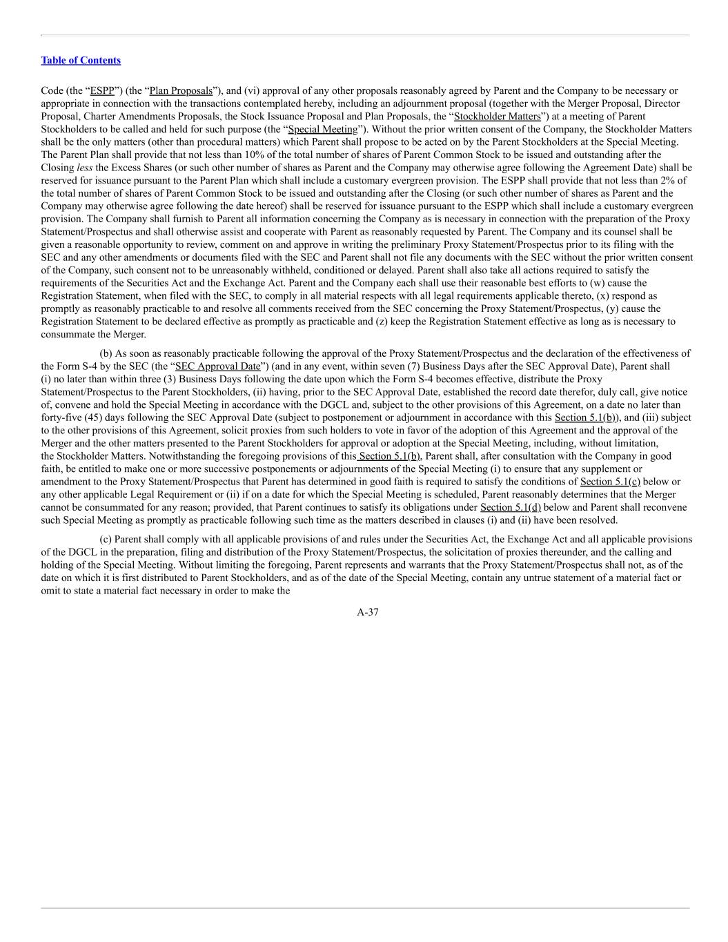 Table of Contents Code (the “ESPP”) (the “Plan Proposals”), and (vi) approval of any other proposals reasonably agreed by Parent and the Company to be necessary or appropriate in connection with the transactions contemplated hereby, including an adjournment proposal (together with the Merger Proposal, Director Proposal, Charter Amendments Proposals, the Stock Issuance Proposal and Plan Proposals, the “Stockholder Matters”) at a meeting of Parent Stockholders to be called and held for such purpose (the “Special Meeting”). Without the prior written consent of the Company, the Stockholder Matters shall be the only matters (other than procedural matters) which Parent shall propose to be acted on by the Parent Stockholders at the Special Meeting. The Parent Plan shall provide that not less than 10% of the total number of shares of Parent Common Stock to be issued and outstanding after the Closing less the Excess Shares (or such other number of shares as Parent and the Company may otherwise agree following the Agreement Date) shall be reserved for issuance pursuant to the Parent Plan which shall include a customary evergreen provision. The ESPP shall provide that not less than 2% of the total number of shares of Parent Common Stock to be issued and outstanding after the Closing (or such other number of shares as Parent and the Company may otherwise agree following the date hereof) shall be reserved for issuance pursuant to the ESPP which shall include a customary evergreen provision. The Company shall furnish to Parent all information concerning the Company as is necessary in connection with the preparation of the Proxy Statement/Prospectus and shall otherwise assist and cooperate with Parent as reasonably requested by Parent. The Company and its counsel shall be given a reasonable opportunity to review, comment on and approve in writing the preliminary Proxy Statement/Prospectus prior to its filing with the SEC and any other amendments or documents filed with the SEC and Parent shall not file any documents with the SEC without the prior written consent of the Company, such consent not to be unreasonably withheld, conditioned or delayed. Parent shall also take all actions required to satisfy the requirements of the Securities Act and the Exchange Act. Parent and the Company each shall use their reasonable best efforts to (w) cause the Registration Statement, when filed with the SEC, to comply in all material respects with all legal requirements applicable thereto, (x) respond as promptly as reasonably practicable to and resolve all comments received from the SEC concerning the Proxy Statement/Prospectus, (y) cause the Registration Statement to be declared effective as promptly as practicable and (z) keep the Registration Statement effective as long as is necessary to consummate the Merger. (b) As soon as reasonably practicable following the approval of the Proxy Statement/Prospectus and the declaration of the effectiveness of the Form S-4 by the SEC (the “SEC Approval Date”) (and in any event, within seven (7) Business Days after the SEC Approval Date), Parent shall (i) no later than within three (3) Business Days following the date upon which the Form S-4 becomes effective, distribute the Proxy Statement/Prospectus to the Parent Stockholders, (ii) having, prior to the SEC Approval Date, established the record date therefor, duly call, give notice of, convene and hold the Special Meeting in accordance with the DGCL and, subject to the other provisions of this Agreement, on a date no later than forty-five (45) days following the SEC Approval Date (subject to postponement or adjournment in accordance with this Section 5.1(b)), and (iii) subject to the other provisions of this Agreement, solicit proxies from such holders to vote in favor of the adoption of this Agreement and the approval of the Merger and the other matters presented to the Parent Stockholders for approval or adoption at the Special Meeting, including, without limitation, the Stockholder Matters. Notwithstanding the foregoing provisions of this Section 5.1(b), Parent shall, after consultation with the Company in good faith, be entitled to make one or more successive postponements or adjournments of the Special Meeting (i) to ensure that any supplement or amendment to the Proxy Statement/Prospectus that Parent has determined in good faith is required to satisfy the conditions of Section 5.1(c) below or any other applicable Legal Requirement or (ii) if on a date for which the Special Meeting is scheduled, Parent reasonably determines that the Merger cannot be consummated for any reason; provided, that Parent continues to satisfy its obligations under Section 5.1(d) below and Parent shall reconvene such Special Meeting as promptly as practicable following such time as the matters described in clauses (i) and (ii) have been resolved. (c) Parent shall comply with all applicable provisions of and rules under the Securities Act, the Exchange Act and all applicable provisions of the DGCL in the preparation, filing and distribution of the Proxy Statement/Prospectus, the solicitation of proxies thereunder, and the calling and holding of the Special Meeting.