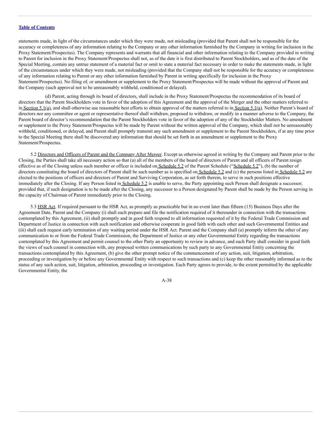 Table of Contents statements made, in light of the circumstances under which they were made, not misleading (provided that Parent shall not be responsible for the accuracy or completeness of any information relating to the Company or any other information furnished by the Company in writing for inclusion in the Proxy Statement/Prospectus). The Company represents and warrants that all financial and other information relating to the Company provided in writing to Parent for inclusion in the Proxy Statement/Prospectus shall not, as of the date it is first distributed to Parent Stockholders, and as of the date of the Special Meeting, contain any untrue statement of a material fact or omit to state a material fact necessary in order to make the statements made, in light of the circumstances under which they were made, not misleading (provided that the Company shall not be responsible for the accuracy or completeness of any information relating to Parent or any other information furnished by Parent in writing specifically for inclusion in the Proxy Statement/Prospectus). No filing of, or amendment or supplement to the Proxy Statement/Prospectus will be made without the approval of Parent and the Company (such approval not to be unreasonably withheld, conditioned or delayed). (d) Parent, acting through its board of directors, shall include in the Proxy Statement/Prospectus the recommendation of its board of directors that the Parent Stockholders vote in favor of the adoption of this Agreement and the approval of the Merger and the other matters referred to in Section 5.1(a), and shall otherwise use reasonable best efforts to obtain approval of the matters referred to in Section 5.1(a). Neither Parent’s board of directors nor any committee or agent or representative thereof shall withdraw, proposed to withdraw, or modify in a manner adverse to the Company, the Parent board of director’s recommendation that the Parent Stockholders vote in favor of the adoption of any of the Stockholder Matters. No amendment or supplement to the Proxy Statement/Prospectus will be made by Parent without the written approval of the Company, which shall not be unreasonably withheld, conditioned, or delayed, and Parent shall promptly transmit any such amendment or supplement to the Parent Stockholders, if at any time prior to the Special Meeting there shall be discovered any information that should be set forth in an amendment or supplement to the Proxy Statement/Prospectus. 5.2 Directors and Officers of Parent and the Company After Merger. Except as otherwise agreed in writing by the Company and Parent prior to the Closing, the Parties shall take all necessary action so that (a) all of the members of the board of directors of Parent and all officers of Parent resign effective as of the Closing unless such member or officer is included on Schedule 5.2 of the Parent Schedule (“Schedule 5.2”), (b) the number of directors constituting the board of directors of Parent shall be such number as is specified on Schedule 5.2 and (c) the persons listed in Schedule 5.2 are elected to the positions of officers and directors of Parent and Surviving Corporation, as set forth therein, to serve in such positions effective immediately after the Closing. If any Person listed in Schedule 5.2 is unable to serve, the Party appointing such Person shall designate a successor; provided that, if such designation is to be made after the Closing, any successor to a Person designated by Parent shall be made by the Person serving in the capacity of Chairman of Parent immediately prior to the Closing. 5.3 HSR Act. If required pursuant to the HSR Act, as promptly as practicable but in no event later than fifteen (15) Business Days after the Agreement Date, Parent and the Company (i) shall each prepare and file the notification required of it thereunder in connection with the transactions contemplated by this Agreement, (ii) shall promptly and in good faith respond to all information requested of it by the Federal Trade Commission and Department of Justice in connection with such notification and otherwise cooperate in good faith with each other and such Governmental Entities and (iii) shall each request early termination of any waiting period under the HSR Act. Parent and the Company shall (a) promptly inform the other of any communication to or from the Federal Trade Commission, the Department of Justice or any other Governmental Entity regarding the transactions contemplated by this Agreement and permit counsel to the other Party an opportunity to review in advance, and each Party shall consider in good faith the views of such counsel in connection with, any proposed written communications by such party to any Governmental Entity concerning the transactions contemplated by this Agreement, (b) give the other prompt notice of the commencement of any action, suit, litigation, arbitration, proceeding or investigation by or before any Governmental Entity with respect to such transactions and (c) keep the other reasonably informed as to the status of any such action, suit, litigation, arbitration, proceeding or investigation. Each Party agrees to provide, to the exte