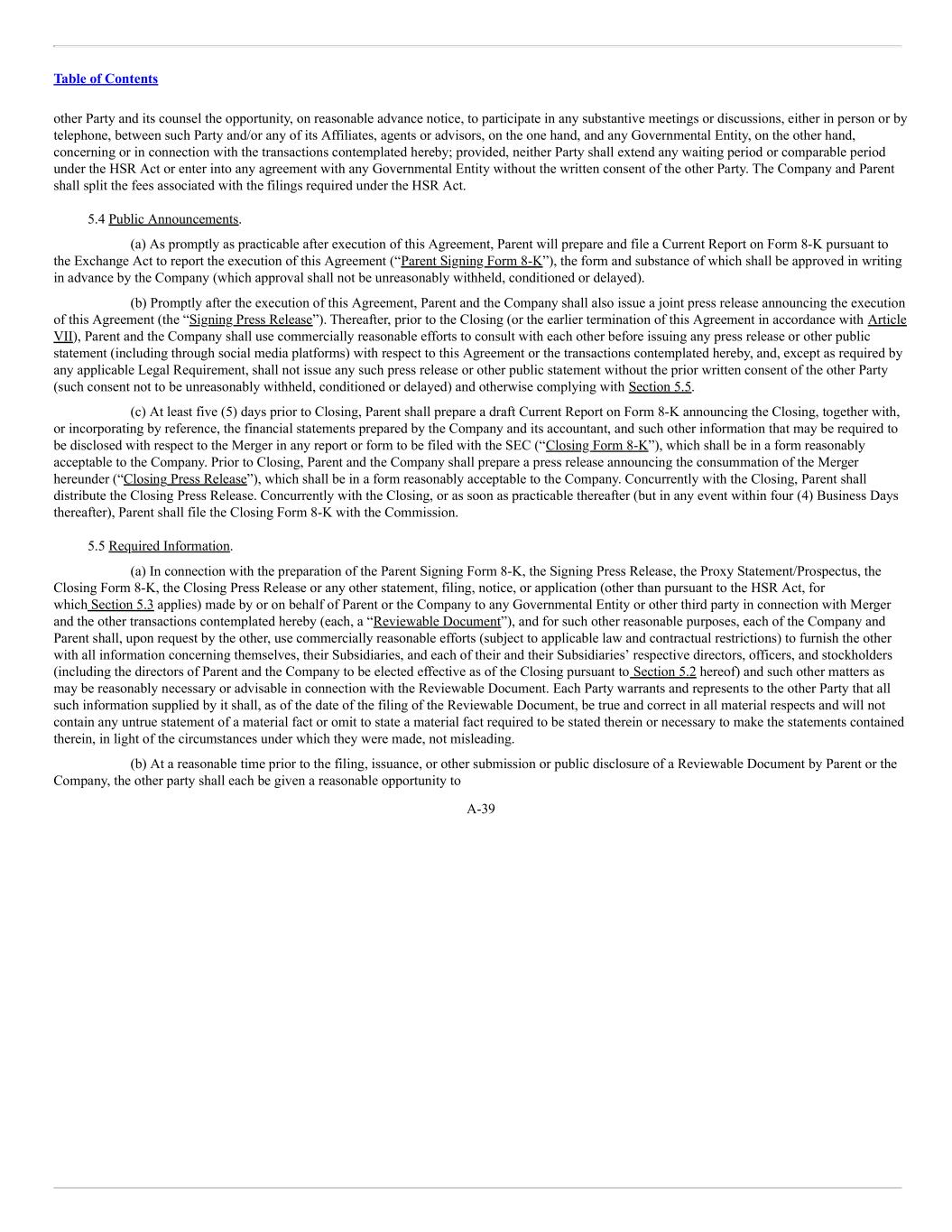 Table of Contents other Party and its counsel the opportunity, on reasonable advance notice, to participate in any substantive meetings or discussions, either in person or by telephone, between such Party and/or any of its Affiliates, agents or advisors, on the one hand, and any Governmental Entity, on the other hand, concerning or in connection with the transactions contemplated hereby; provided, neither Party shall extend any waiting period or comparable period under the HSR Act or enter into any agreement with any Governmental Entity without the written consent of the other Party. The Company and Parent shall split the fees associated with the filings required under the HSR Act. 5.4 Public Announcements. (a) As promptly as practicable after execution of this Agreement, Parent will prepare and file a Current Report on Form 8-K pursuant to the Exchange Act to report the execution of this Agreement (“Parent Signing Form 8-K”), the form and substance of which shall be approved in writing in advance by the Company (which approval shall not be unreasonably withheld, conditioned or delayed). (b) Promptly after the execution of this Agreement, Parent and the Company shall also issue a joint press release announcing the execution of this Agreement (the “Signing Press Release”). Thereafter, prior to the Closing (or the earlier termination of this Agreement in accordance with Article VII), Parent and the Company shall use commercially reasonable efforts to consult with each other before issuing any press release or other public statement (including through social media platforms) with respect to this Agreement or the transactions contemplated hereby, and, except as required by any applicable Legal Requirement, shall not issue any such press release or other public statement without the prior written consent of the other Party (such consent not to be unreasonably withheld, conditioned or delayed) and otherwise complying with Section 5.5. (c) At least five (5) days prior to Closing, Parent shall prepare a draft Current Report on Form 8-K announcing the Closing, together with, or incorporating by reference, the financial statements prepared by the Company and its accountant, and such other information that may be required to be disclosed with respect to the Merger in any report or form to be filed with the SEC (“Closing Form 8-K”), which shall be in a form reasonably acceptable to the Company. Prior to Closing, Parent and the Company shall prepare a press release announcing the consummation of the Merger hereunder (“Closing Press Release”), which shall be in a form reasonably acceptable to the Company. Concurrently with the Closing, Parent shall distribute the Closing Press Release. Concurrently with the Closing, or as soon as practicable thereafter (but in any event within four (4) Business Days thereafter), Parent shall file the Closing Form 8-K with the Commission. 5.5 Required Information. (a) In connection with the preparation of the Parent Signing Form 8-K, the Signing Press Release, the Proxy Statement/Prospectus, the Closing Form 8-K, the Closing Press Release or any other statement, filing, notice, or application (other than pursuant to the HSR Act, for which Section 5.3 applies) made by or on behalf of Parent or the Company to any Governmental Entity or other third party in connection with Merger and the other transactions contemplated hereby (each, a “Reviewable Document”), and for such other reasonable purposes, each of the Company and Parent shall, upon request by the other, use commercially reasonable efforts (subject to applicable law and contractual restrictions) to furnish the other with all information concerning themselves, their Subsidiaries, and each of their and their Subsidiaries’ respective directors, officers, and stockholders (including the directors of Parent and the Company to be elected effective as of the Closing pursuant to Section 5.2 hereof) and such other matters as may be reasonably necessary or advisable in connection with the Reviewable Document. Each Party warrants and represents to the other Party that all such information supplied by it shall, as of the date of the filing of the Reviewable Document, be true and correct in all material respects and will not contain any untrue statement of a material fact or omit to state a material fact required to be stated therein or necessary to make the statements contained therein, in light of the circumstances under which they were made, not misleading. (b) At a reasonable time prior to the filing, issuance, or other submission or public disclosure of a Reviewable Document by Parent or the Company, the other party shall each be given a reasonable opportunity to   A-39