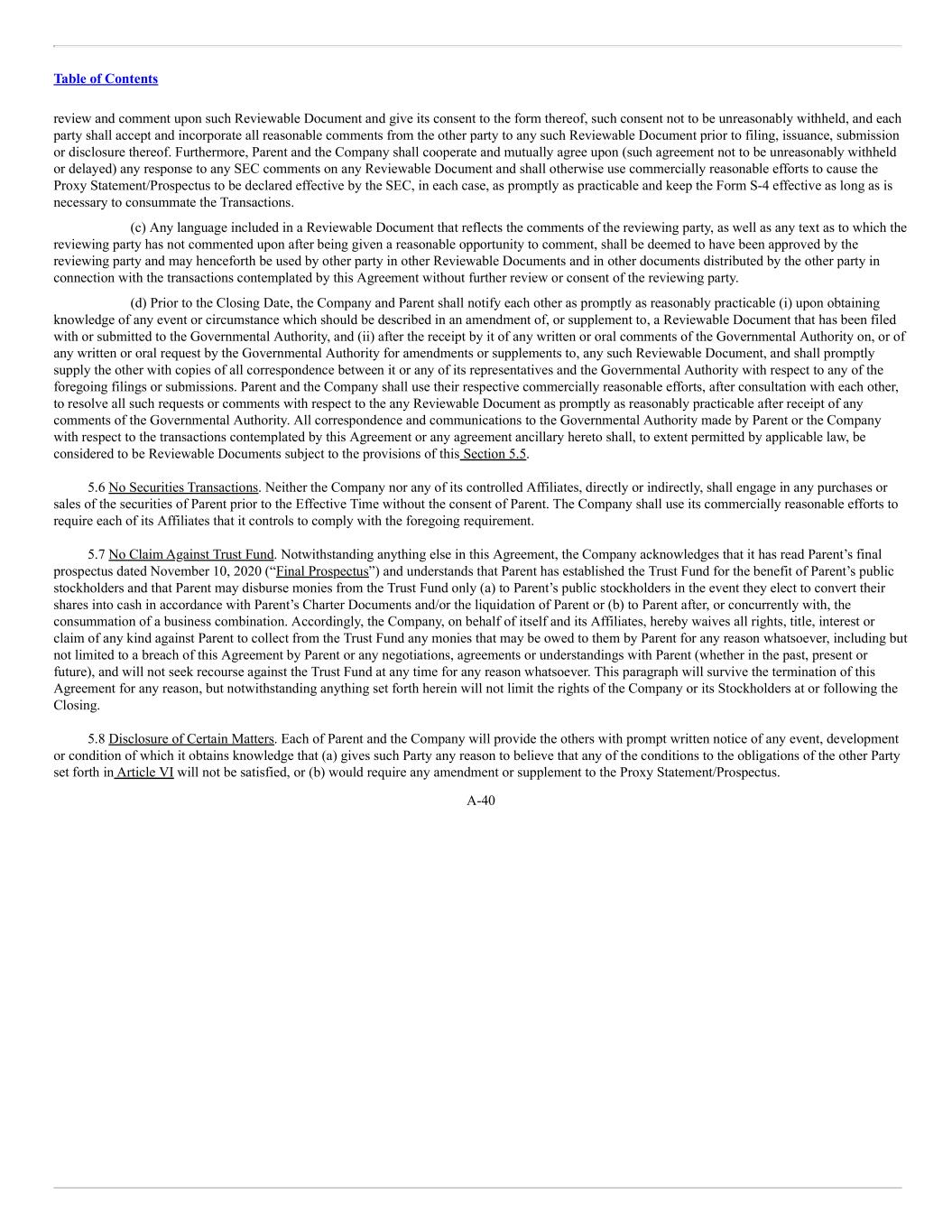 Table of Contents review and comment upon such Reviewable Document and give its consent to the form thereof, such consent not to be unreasonably withheld, and each party shall accept and incorporate all reasonable comments from the other party to any such Reviewable Document prior to filing, issuance, submission or disclosure thereof. Furthermore, Parent and the Company shall cooperate and mutually agree upon (such agreement not to be unreasonably withheld or delayed) any response to any SEC comments on any Reviewable Document and shall otherwise use commercially reasonable efforts to cause the Proxy Statement/Prospectus to be declared effective by the SEC, in each case, as promptly as practicable and keep the Form S-4 effective as long as is necessary to consummate the Transactions. (c) Any language included in a Reviewable Document that reflects the comments of the reviewing party, as well as any text as to which the reviewing party has not commented upon after being given a reasonable opportunity to comment, shall be deemed to have been approved by the reviewing party and may henceforth be used by other party in other Reviewable Documents and in other documents distributed by the other party in connection with the transactions contemplated by this Agreement without further review or consent of the reviewing party. (d) Prior to the Closing Date, the Company and Parent shall notify each other as promptly as reasonably practicable (i) upon obtaining knowledge of any event or circumstance which should be described in an amendment of, or supplement to, a Reviewable Document that has been filed with or submitted to the Governmental Authority, and (ii) after the receipt by it of any written or oral comments of the Governmental Authority on, or of any written or oral request by the Governmental Authority for amendments or supplements to, any such Reviewable Document, and shall promptly supply the other with copies of all correspondence between it or any of its representatives and the Governmental Authority with respect to any of the foregoing filings or submissions. Parent and the Company shall use their respective commercially reasonable efforts, after consultation with each other, to resolve all such requests or comments with respect to the any Reviewable Document as promptly as reasonably practicable after receipt of any comments of the Governmental Authority. All correspondence and communications to the Governmental Authority made by Parent or the Company with respect to the transactions contemplated by this Agreement or any agreement ancillary hereto shall, to extent permitted by applicable law, be considered to be Reviewable Documents subject to the provisions of this Section 5.5. 5.6 No Securities Transactions. Neither the Company nor any of its controlled Affiliates, directly or indirectly, shall engage in any purchases or sales of the securities of Parent prior to the Effective Time without the consent of Parent. The Company shall use its commercially reasonable efforts to require each of its Affiliates that it controls to comply with the foregoing requirement. 5.7 No Claim Against Trust Fund. Notwithstanding anything else in this Agreement, the Company acknowledges that it has read Parent’s final prospectus dated November 10, 2020 (“Final Prospectus”) and understands that Parent has established the Trust Fund for the benefit of Parent’s public stockholders and that Parent may disburse monies from the Trust Fund only (a) to Parent’s public stockholders in the event they elect to convert their shares into cash in accordance with Parent’s Charter Documents and/or the liquidation of Parent or (b) to Parent after, or concurrently with, the consummation of a business combination. Accordingly, the Company, on behalf of itself and its Affiliates, hereby waives all rights, title, interest or claim of any kind against Parent to collect from the Trust Fund any monies that may be owed to them by Parent for any reason whatsoever, including but not limited to a breach of this Agreement by Parent or any negotiations, agreements or understandings with Parent (whether in the past, present or future), and will not seek recourse against the Trust Fund at any time for any reason whatsoever. This paragraph will survive the termination of this Agreement for any reason, but notwithstanding anything set forth herein will not limit the rights of the Company or its Stockholders at or following the Closing. 5.8 Disclosure of Certain Matters. Each of Parent and the Company will provide the others with prompt written notice of any event, development or condition of which it obtains knowledge that (a) gives such Party any reason to believe that any of the conditions to the obligations of the other Party set forth in Article VI will not be satisfied, or (b) would require any amendment or supplement to the Proxy Statement/Prospectus.   A-40