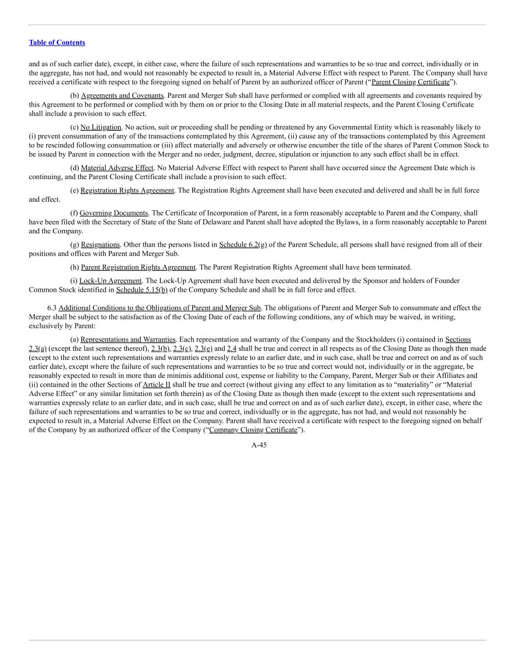 Table of Contents and as of such earlier date), except, in either case, where the failure of such representations and warranties to be so true and correct, individually or in the aggregate, has not had, and would not reasonably be expected to result in, a Material Adverse Effect with respect to Parent. The Company shall have received a certificate with respect to the foregoing signed on behalf of Parent by an authorized officer of Parent (“Parent Closing Certificate”). (b) Agreements and Covenants. Parent and Merger Sub shall have performed or complied with all agreements and covenants required by this Agreement to be performed or complied with by them on or prior to the Closing Date in all material respects, and the Parent Closing Certificate shall include a provision to such effect. (c) No Litigation. No action, suit or proceeding shall be pending or threatened by any Governmental Entity which is reasonably likely to (i) prevent consummation of any of the transactions contemplated by this Agreement, (ii) cause any of the transactions contemplated by this Agreement to be rescinded following consummation or (iii) affect materially and adversely or otherwise encumber the title of the shares of Parent Common Stock to be issued by Parent in connection with the Merger and no order, judgment, decree, stipulation or injunction to any such effect shall be in effect. (d) Material Adverse Effect. No Material Adverse Effect with respect to Parent shall have occurred since the Agreement Date which is continuing, and the Parent Closing Certificate shall include a provision to such effect. (e) Registration Rights Agreement. The Registration Rights Agreement shall have been executed and delivered and shall be in full force and effect. (f) Governing Documents. The Certificate of Incorporation of Parent, in a form reasonably acceptable to Parent and the Company, shall have been filed with the Secretary of State of the State of Delaware and Parent shall have adopted the Bylaws, in a form reasonably acceptable to Parent and the Company. (g) Resignations. Other than the persons listed in Schedule 6.2(g) of the Parent Schedule, all persons shall have resigned from all of their positions and offices with Parent and Merger Sub. (h) Parent Registration Rights Agreement. The Parent Registration Rights Agreement shall have been terminated. (i) Lock-Up Agreement. The Lock-Up Agreement shall have been executed and delivered by the Sponsor and holders of Founder Common Stock identified in Schedule 5.15(b) of the Company Schedule and shall be in full force and effect. 6.3 Additional Conditions to the Obligations of Parent and Merger Sub. The obligations of Parent and Merger Sub to consummate and effect the Merger shall be subject to the satisfaction as of the Closing Date of each of the following conditions, any of which may be waived, in writing, exclusively by Parent: (a) Representations and Warranties. Each representation and warranty of the Company and the Stockholders (i) contained in Sections 2.3(a) (except the last sentence thereof), 2.3(b), 2.3(c), 2.3(e) and 2.4 shall be true and correct in all respects as of the Closing Date as though then made (except to the extent such representations and warranties expressly relate to an earlier date, and in such case, shall be true and correct on and as of such earlier date), except where the failure of such representations and warranties to be so true and correct would not, individually or in the aggregate, be reasonably expected to result in more than de minimis additional cost, expense or liability to the Company, Parent, Merger Sub or their Affiliates and (ii) contained in the other Sections of Article II shall be true and correct (without giving any effect to any limitation as to “materiality” or “Material Adverse Effect” or any similar limitation set forth therein) as of the Closing Date as though then made (except to the extent such representations and warranties expressly relate to an earlier date, and in such case, shall be true and correct on and as of such earlier date), except, in either case, where the failure of such representations and warranties to be so true and correct, individually or in the aggregate, has not had, and would not reasonably be expected to result in, a Material Adverse Effect on the Company. Parent shall have received a certificate with respect to the foregoing signed on behalf of the Company by an authorized officer of the Company (“Company Closing Certificate”).   A-45