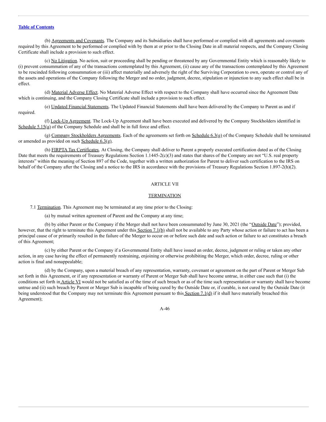 Table of Contents (b) Agreements and Covenants. The Company and its Subsidiaries shall have performed or complied with all agreements and covenants required by this Agreement to be performed or complied with by them at or prior to the Closing Date in all material respects, and the Company Closing Certificate shall include a provision to such effect. (c) No Litigation. No action, suit or proceeding shall be pending or threatened by any Governmental Entity which is reasonably likely to (i) prevent consummation of any of the transactions contemplated by this Agreement, (ii) cause any of the transactions contemplated by this Agreement to be rescinded following consummation or (iii) affect materially and adversely the right of the Surviving Corporation to own, operate or control any of the assets and operations of the Company following the Merger and no order, judgment, decree, stipulation or injunction to any such effect shall be in effect. (d) Material Adverse Effect. No Material Adverse Effect with respect to the Company shall have occurred since the Agreement Date which is continuing, and the Company Closing Certificate shall include a provision to such effect. (e) Updated Financial Statements. The Updated Financial Statements shall have been delivered by the Company to Parent as and if required. (f) Lock-Up Agreement. The Lock-Up Agreement shall have been executed and delivered by the Company Stockholders identified in Schedule 5.15(a) of the Company Schedule and shall be in full force and effect. (g) Company Stockholders Agreements. Each of the agreements set forth on Schedule 6.3(g) of the Company Schedule shall be terminated or amended as provided on such Schedule 6.3(g). (h) FIRPTA Tax Certificates. At Closing, the Company shall deliver to Parent a properly executed certification dated as of the Closing Date that meets the requirements of Treasury Regulations Section 1.1445-2(c)(3) and states that shares of the Company are not “U.S. real property interests” within the meaning of Section 897 of the Code, together with a written authorization for Parent to deliver such certification to the IRS on behalf of the Company after the Closing and a notice to the IRS in accordance with the provisions of Treasury Regulations Section 1.897-2(h)(2). ARTICLE VII TERMINATION 7.1 Termination. This Agreement may be terminated at any time prior to the Closing: (a) by mutual written agreement of Parent and the Company at any time; (b) by either Parent or the Company if the Merger shall not have been consummated by June 30, 2021 (the “Outside Date”); provided, however, that the right to terminate this Agreement under this Section 7.1(b) shall not be available to any Party whose action or failure to act has been a principal cause of or primarily resulted in the failure of the Merger to occur on or before such date and such action or failure to act constitutes a breach of this Agreement; (c) by either Parent or the Company if a Governmental Entity shall have issued an order, decree, judgment or ruling or taken any other action, in any case having the effect of permanently restraining, enjoining or otherwise prohibiting the Merger, which order, decree, ruling or other action is final and nonappealable; (d) by the Company, upon a material breach of any representation, warranty, covenant or agreement on the part of Parent or Merger Sub set forth in this Agreement, or if any representation or warranty of Parent or Merger Sub shall have become untrue, in either case such that (i) the conditions set forth in Article VI would not be satisfied as of the time of such breach or as of the time such representation or warranty shall have become untrue and (ii) such breach by Parent or Merger Sub is incapable of being cured by the Outside Date or, if curable, is not cured by the Outside Date (it being understood that the Company may not terminate this Agreement pursuant to this Section 7.1(d) if it shall have materially breached this Agreement);   A-46