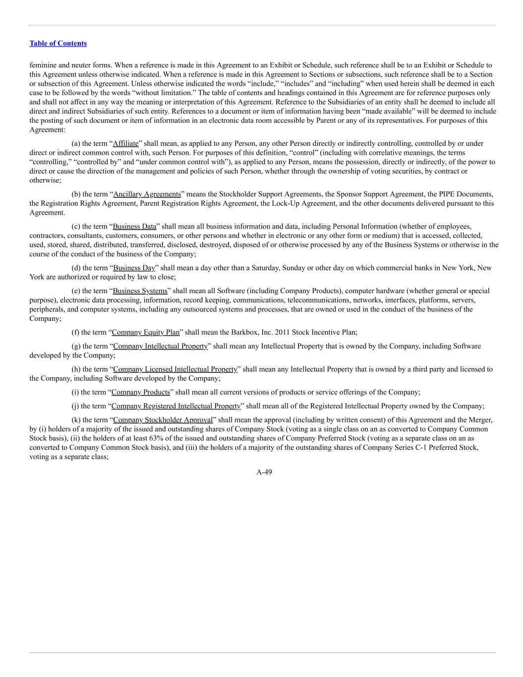 Table of Contents feminine and neuter forms. When a reference is made in this Agreement to an Exhibit or Schedule, such reference shall be to an Exhibit or Schedule to this Agreement unless otherwise indicated. When a reference is made in this Agreement to Sections or subsections, such reference shall be to a Section or subsection of this Agreement. Unless otherwise indicated the words “include,” “includes” and “including” when used herein shall be deemed in each case to be followed by the words “without limitation.” The table of contents and headings contained in this Agreement are for reference purposes only and shall not affect in any way the meaning or interpretation of this Agreement. Reference to the Subsidiaries of an entity shall be deemed to include all direct and indirect Subsidiaries of such entity. References to a document or item of information having been “made available” will be deemed to include the posting of such document or item of information in an electronic data room accessible by Parent or any of its representatives. For purposes of this Agreement: (a) the term “Affiliate” shall mean, as applied to any Person, any other Person directly or indirectly controlling, controlled by or under direct or indirect common control with, such Person. For purposes of this definition, “control” (including with correlative meanings, the terms “controlling,” “controlled by” and “under common control with”), as applied to any Person, means the possession, directly or indirectly, of the power to direct or cause the direction of the management and policies of such Person, whether through the ownership of voting securities, by contract or otherwise; (b) the term “Ancillary Agreements” means the Stockholder Support Agreements, the Sponsor Support Agreement, the PIPE Documents, the Registration Rights Agreement, Parent Registration Rights Agreement, the Lock-Up Agreement, and the other documents delivered pursuant to this Agreement. (c) the term “Business Data” shall mean all business information and data, including Personal Information (whether of employees, contractors, consultants, customers, consumers, or other persons and whether in electronic or any other form or medium) that is accessed, collected, used, stored, shared, distributed, transferred, disclosed, destroyed, disposed of or otherwise processed by any of the Business Systems or otherwise in the course of the conduct of the business of the Company; (d) the term “Business Day” shall mean a day other than a Saturday, Sunday or other day on which commercial banks in New York, New York are authorized or required by law to close; (e) the term “Business Systems” shall mean all Software (including Company Products), computer hardware (whether general or special purpose), electronic data processing, information, record keeping, communications, telecommunications, networks, interfaces, platforms, servers, peripherals, and computer systems, including any outsourced systems and processes, that are owned or used in the conduct of the business of the Company; (f) the term “Company Equity Plan” shall mean the Barkbox, Inc. 2011 Stock Incentive Plan; (g) the term “Company Intellectual Property” shall mean any Intellectual Property that is owned by the Company, including Software developed by the Company; (h) the term “Company Licensed Intellectual Property” shall mean any Intellectual Property that is owned by a third party and licensed to the Company, including Software developed by the Company; (i) the term “Company Products” shall mean all current versions of products or service offerings of the Company; (j) the term “Company Registered Intellectual Property” shall mean all of the Registered Intellectual Property owned by the Company; (k) the term “Company Stockholder Approval” shall mean the approval (including by written consent) of this Agreement and the Merger, by (i) holders of a majority of the issued and outstanding shares of Company Stock (voting as a single class on an as converted to Company Common Stock basis), (ii) the holders of at least 63% of the issued and outstanding shares of Company Preferred Stock (voting as a separate class on an as converted to Company Common Stock basis), and (iii) the holders of a majority of the outstanding shares of Company Series C-1 Preferred Stock, voting as a separate class;   A-49