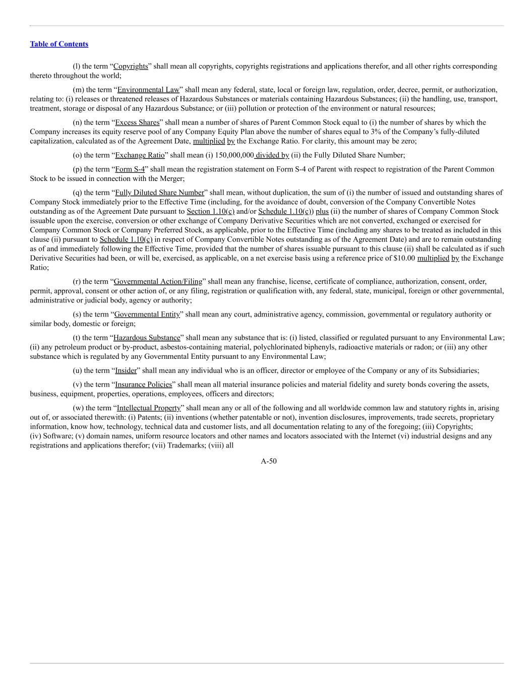 Table of Contents (l) the term “Copyrights” shall mean all copyrights, copyrights registrations and applications therefor, and all other rights corresponding thereto throughout the world; (m) the term “Environmental Law” shall mean any federal, state, local or foreign law, regulation, order, decree, permit, or authorization, relating to: (i) releases or threatened releases of Hazardous Substances or materials containing Hazardous Substances; (ii) the handling, use, transport, treatment, storage or disposal of any Hazardous Substance; or (iii) pollution or protection of the environment or natural resources; (n) the term “Excess Shares” shall mean a number of shares of Parent Common Stock equal to (i) the number of shares by which the Company increases its equity reserve pool of any Company Equity Plan above the number of shares equal to 3% of the Company’s fully-diluted capitalization, calculated as of the Agreement Date, multiplied by the Exchange Ratio. For clarity, this amount may be zero; (o) the term “Exchange Ratio” shall mean (i) 150,000,000 divided by (ii) the Fully Diluted Share Number; (p) the term “Form S-4” shall mean the registration statement on Form S-4 of Parent with respect to registration of the Parent Common Stock to be issued in connection with the Merger; (q) the term “Fully Diluted Share Number” shall mean, without duplication, the sum of (i) the number of issued and outstanding shares of Company Stock immediately prior to the Effective Time (including, for the avoidance of doubt, conversion of the Company Convertible Notes outstanding as of the Agreement Date pursuant to Section 1.10(c) and/or Schedule 1.10(c)) plus (ii) the number of shares of Company Common Stock issuable upon the exercise, conversion or other exchange of Company Derivative Securities which are not converted, exchanged or exercised for Company Common Stock or Company Preferred Stock, as applicable, prior to the Effective Time (including any shares to be treated as included in this clause (ii) pursuant to Schedule 1.10(c) in respect of Company Convertible Notes outstanding as of the Agreement Date) and are to remain outstanding as of and immediately following the Effective Time, provided that the number of shares issuable pursuant to this clause (ii) shall be calculated as if such Derivative Securities had been, or will be, exercised, as applicable, on a net exercise basis using a reference price of $10.00 multiplied by the Exchange Ratio; (r) the term “Governmental Action/Filing” shall mean any franchise, license, certificate of compliance, authorization, consent, order, permit, approval, consent or other action of, or any filing, registration or qualification with, any federal, state, municipal, foreign or other governmental, administrative or judicial body, agency or authority; (s) the term “Governmental Entity” shall mean any court, administrative agency, commission, governmental or regulatory authority or similar body, domestic or foreign; (t) the term “Hazardous Substance” shall mean any substance that is: (i) listed, classified or regulated pursuant to any Environmental Law; (ii) any petroleum product or by-product, asbestos-containing material, polychlorinated biphenyls, radioactive materials or radon; or (iii) any other substance which is regulated by any Governmental Entity pursuant to any Environmental Law; (u) the term “Insider” shall mean any individual who is an officer, director or employee of the Company or any of its Subsidiaries; (v) the term “Insurance Policies” shall mean all material insurance policies and material fidelity and surety bonds covering the assets, business, equipment, properties, operations, employees, officers and directors; (w) the term “Intellectual Property” shall mean any or all of the following and all worldwide common law and statutory rights in, arising out of, or associated therewith: (i) Patents; (ii) inventions (whether patentable or not), invention disclosures, improvements, trade secrets, proprietary information, know how, technology, technical data and customer lists, and all documentation relating to any of the foregoing; (iii) Copyrights; (iv) Software; (v) domain names, uniform resource locators and other names and locators associated with the Internet (vi) industrial designs and any registrations and applications therefor; (vii) Trademarks; (viii) all   A-50