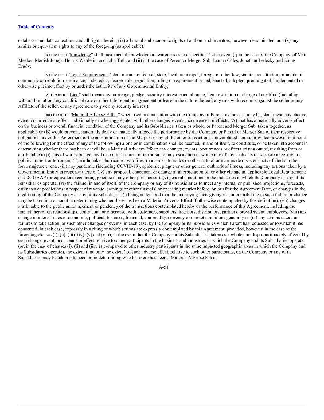 Table of Contents databases and data collections and all rights therein; (ix) all moral and economic rights of authors and inventors, however denominated, and (x) any similar or equivalent rights to any of the foregoing (as applicable); (x) the term “knowledge” shall mean actual knowledge or awareness as to a specified fact or event (i) in the case of the Company, of Matt Meeker, Manish Joneja, Henrik Werdelin, and John Toth, and (ii) in the case of Parent or Merger Sub, Joanna Coles, Jonathan Ledecky and James Brady; (y) the term “Legal Requirements” shall mean any federal, state, local, municipal, foreign or other law, statute, constitution, principle of common law, resolution, ordinance, code, edict, decree, rule, regulation, ruling or requirement issued, enacted, adopted, promulgated, implemented or otherwise put into effect by or under the authority of any Governmental Entity; (z) the term “Lien” shall mean any mortgage, pledge, security interest, encumbrance, lien, restriction or charge of any kind (including, without limitation, any conditional sale or other title retention agreement or lease in the nature thereof, any sale with recourse against the seller or any Affiliate of the seller, or any agreement to give any security interest); (aa) the term “Material Adverse Effect” when used in connection with the Company or Parent, as the case may be, shall mean any change, event, occurrence or effect, individually or when aggregated with other changes, events, occurrences or effects, (A) that has a materially adverse effect on the business or overall financial condition of the Company and its Subsidiaries, taken as whole, or Parent and Merger Sub, taken together, as applicable or (B) would prevent, materially delay or materially impede the performance by the Company or Parent or Merger Sub of their respective obligations under this Agreement or the consummation of the Merger or any of the other transactions contemplated herein, provided however that none of the following (or the effect of any of the following) alone or in combination shall be deemed, in and of itself, to constitute, or be taken into account in determining whether there has been or will be, a Material Adverse Effect: any changes, events, occurrences or effects arising out of, resulting from or attributable to (i) acts of war, sabotage, civil or political unrest or terrorism, or any escalation or worsening of any such acts of war, sabotage, civil or political unrest or terrorism, (ii) earthquakes, hurricanes, wildfires, mudslides, tornados or other natural or man-made disasters, acts of God or other force majeure events, (iii) any pandemic (including COVID-19), epidemic, plague or other general outbreak of illness, including any actions taken by a Governmental Entity in response thereto, (iv) any proposal, enactment or change in interpretation of, or other change in, applicable Legal Requirements or U.S. GAAP (or equivalent accounting practice in any other jurisdiction), (v) general conditions in the industries in which the Company or any of its Subsidiaries operate, (vi) the failure, in and of itself, of the Company or any of its Subsidiaries to meet any internal or published projections, forecasts, estimates or predictions in respect of revenue, earnings or other financial or operating metrics before, on or after the Agreement Date, or changes in the credit rating of the Company or any of its Subsidiaries (it being understood that the underlying facts giving rise or contributing to such failure or change may be taken into account in determining whether there has been a Material Adverse Effect if otherwise contemplated by this definition), (vii) changes attributable to the public announcement or pendency of the transactions contemplated hereby or the performance of this Agreement, including the impact thereof on relationships, contractual or otherwise, with customers, suppliers, licensors, distributors, partners, providers and employees, (viii) any change in interest rates or economic, political, business, financial, commodity, currency or market conditions generally or (ix) any actions taken, or failures to take action, or such other changes or events, in each case, by the Company or its Subsidiaries which Parent has requested or to which it has consented, in each case, expressly in writing or which actions are expressly contemplated by this Agreement; provided, however, in the case of the foregoing clauses (i), (ii), (iii), (iv), (v) and (viii), in the event that the Company and its Subsidiaries, taken as a whole, are disproportionately affected by such change, event, occurrence or effect relative to other participants in the business and industries in which the Company and its Subsidiaries operate (or, in the case of clauses (i), (ii) and (iii), as compared to other industry participants in the same impacted geographic areas in which the Company and its Subsidiaries operate), the extent (and only the extent) of such adverse effect, relative to such other participants, on the Company or any of its Subsidiaries may be taken into account in determining whether there has been a Material Adverse Effect;   A-51