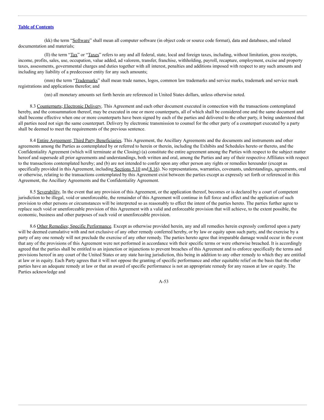 Table of Contents (kk) the term “Software” shall mean all computer software (in object code or source code format), data and databases, and related documentation and materials; (ll) the term “Tax” or “Taxes” refers to any and all federal, state, local and foreign taxes, including, without limitation, gross receipts, income, profits, sales, use, occupation, value added, ad valorem, transfer, franchise, withholding, payroll, recapture, employment, excise and property taxes, assessments, governmental charges and duties together with all interest, penalties and additions imposed with respect to any such amounts and including any liability of a predecessor entity for any such amounts; (mm) the term “Trademarks” shall mean trade names, logos, common law trademarks and service marks, trademark and service mark registrations and applications therefor; and (nn) all monetary amounts set forth herein are referenced in United States dollars, unless otherwise noted. 8.3 Counterparts; Electronic Delivery. This Agreement and each other document executed in connection with the transactions contemplated hereby, and the consummation thereof, may be executed in one or more counterparts, all of which shall be considered one and the same document and shall become effective when one or more counterparts have been signed by each of the parties and delivered to the other party, it being understood that all parties need not sign the same counterpart. Delivery by electronic transmission to counsel for the other party of a counterpart executed by a party shall be deemed to meet the requirements of the previous sentence. 8.4 Entire Agreement; Third Party Beneficiaries. This Agreement, the Ancillary Agreements and the documents and instruments and other agreements among the Parties as contemplated by or referred to herein or therein, including the Exhibits and Schedules hereto or thereto, and the Confidentiality Agreement (which will terminate at the Closing) (a) constitute the entire agreement among the Parties with respect to the subject matter hereof and supersede all prior agreements and understandings, both written and oral, among the Parties and any of their respective Affiliates with respect to the transactions contemplated hereby; and (b) are not intended to confer upon any other person any rights or remedies hereunder (except as specifically provided in this Agreement, including Sections 5.10 and 8.16). No representations, warranties, covenants, understandings, agreements, oral or otherwise, relating to the transactions contemplated by this Agreement exist between the parties except as expressly set forth or referenced in this Agreement, the Ancillary Agreements and the Confidentiality Agreement. 8.5 Severability. In the event that any provision of this Agreement, or the application thereof, becomes or is declared by a court of competent jurisdiction to be illegal, void or unenforceable, the remainder of this Agreement will continue in full force and effect and the application of such provision to other persons or circumstances will be interpreted so as reasonably to effect the intent of the parties hereto. The parties further agree to replace such void or unenforceable provision of this Agreement with a valid and enforceable provision that will achieve, to the extent possible, the economic, business and other purposes of such void or unenforceable provision. 8.6 Other Remedies; Specific Performance. Except as otherwise provided herein, any and all remedies herein expressly conferred upon a party will be deemed cumulative with and not exclusive of any other remedy conferred hereby, or by law or equity upon such party, and the exercise by a party of any one remedy will not preclude the exercise of any other remedy. The parties hereto agree that irreparable damage would occur in the event that any of the provisions of this Agreement were not performed in accordance with their specific terms or were otherwise breached. It is accordingly agreed that the parties shall be entitled to an injunction or injunctions to prevent breaches of this Agreement and to enforce specifically the terms and provisions hereof in any court of the United States or any state having jurisdiction, this being in addition to any other remedy to which they are entitled at law or in equity. Each Party agrees that it will not oppose the granting of specific performance and other equitable relief on the basis that the other parties have an adequate remedy at law or that an award of specific performance is not an appropriate remedy for any reason at law or equity. The Parties acknowledge and   A-53
