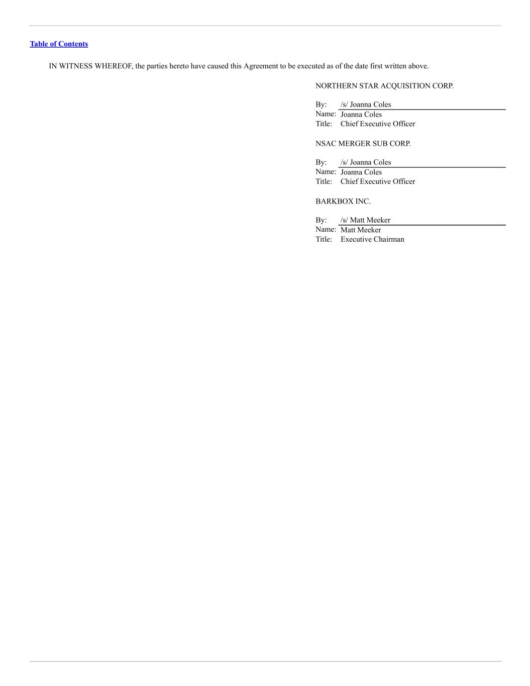 Table of Contents IN WITNESS WHEREOF, the parties hereto have caused this Agreement to be executed as of the date first written above.   NORTHERN STAR ACQUISITION CORP. By:  /s/ Joanna Coles Name:  Joanna Coles Title:  Chief Executive Officer   NSAC MERGER SUB CORP. By:  /s/ Joanna Coles Name:  Joanna Coles Title:  Chief Executive Officer   BARKBOX INC. By:  /s/ Matt Meeker Name:  Matt Meeker Title:  Executive Chairman