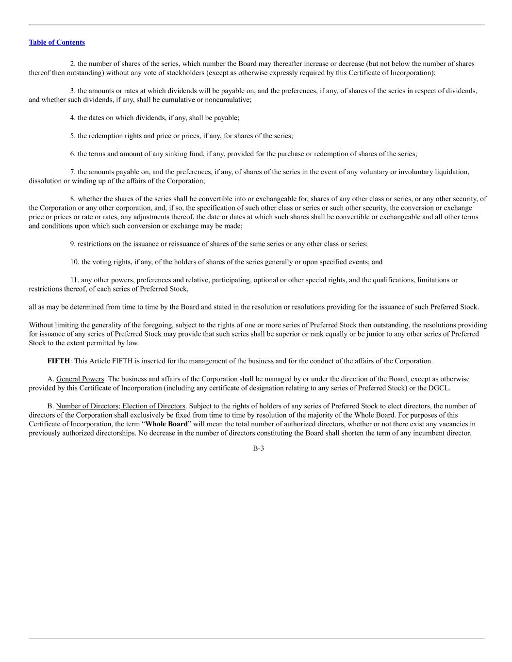 Table of Contents 2. the number of shares of the series, which number the Board may thereafter increase or decrease (but not below the number of shares thereof then outstanding) without any vote of stockholders (except as otherwise expressly required by this Certificate of Incorporation); 3. the amounts or rates at which dividends will be payable on, and the preferences, if any, of shares of the series in respect of dividends, and whether such dividends, if any, shall be cumulative or noncumulative; 4. the dates on which dividends, if any, shall be payable; 5. the redemption rights and price or prices, if any, for shares of the series; 6. the terms and amount of any sinking fund, if any, provided for the purchase or redemption of shares of the series; 7. the amounts payable on, and the preferences, if any, of shares of the series in the event of any voluntary or involuntary liquidation, dissolution or winding up of the affairs of the Corporation; 8. whether the shares of the series shall be convertible into or exchangeable for, shares of any other class or series, or any other security, of the Corporation or any other corporation, and, if so, the specification of such other class or series or such other security, the conversion or exchange price or prices or rate or rates, any adjustments thereof, the date or dates at which such shares shall be convertible or exchangeable and all other terms and conditions upon which such conversion or exchange may be made; 9. restrictions on the issuance or reissuance of shares of the same series or any other class or series; 10. the voting rights, if any, of the holders of shares of the series generally or upon specified events; and 11. any other powers, preferences and relative, participating, optional or other special rights, and the qualifications, limitations or restrictions thereof, of each series of Preferred Stock, all as may be determined from time to time by the Board and stated in the resolution or resolutions providing for the issuance of such Preferred Stock. Without limiting the generality of the foregoing, subject to the rights of one or more series of Preferred Stock then outstanding, the resolutions providing for issuance of any series of Preferred Stock may provide that such series shall be superior or rank equally or be junior to any other series of Preferred Stock to the extent permitted by law. FIFTH: This Article FIFTH is inserted for the management of the business and for the conduct of the affairs of the Corporation. A. General Powers. The business and affairs of the Corporation shall be managed by or under the direction of the Board, except as otherwise provided by this Certificate of Incorporation (including any certificate of designation relating to any series of Preferred Stock) or the DGCL. B. Number of Directors; Election of Directors. Subject to the rights of holders of any series of Preferred Stock to elect directors, the number of directors of the Corporation shall exclusively be fixed from time to time by resolution of the majority of the Whole Board. For purposes of this Certificate of Incorporation, the term “Whole Board” will mean the total number of authorized directors, whether or not there exist any vacancies in previously authorized directorships. No decrease in the number of directors constituting the Board shall shorten the term of any incumbent director.   B-3