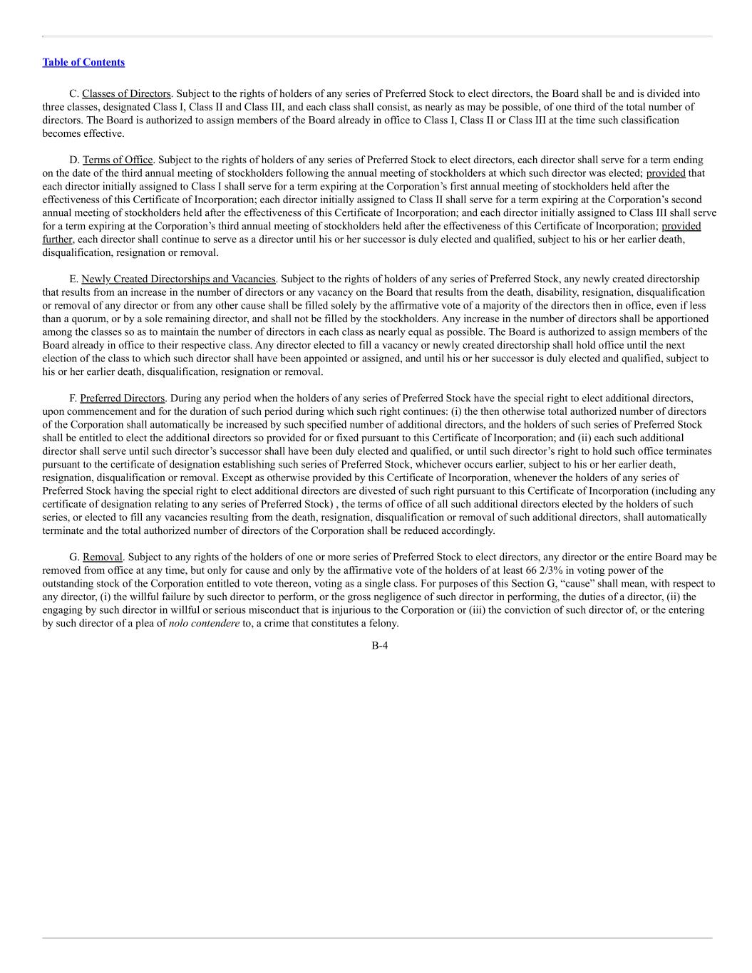 Table of Contents C. Classes of Directors. Subject to the rights of holders of any series of Preferred Stock to elect directors, the Board shall be and is divided into three classes, designated Class I, Class II and Class III, and each class shall consist, as nearly as may be possible, of one third of the total number of directors. The Board is authorized to assign members of the Board already in office to Class I, Class II or Class III at the time such classification becomes effective. D. Terms of Office. Subject to the rights of holders of any series of Preferred Stock to elect directors, each director shall serve for a term ending on the date of the third annual meeting of stockholders following the annual meeting of stockholders at which such director was elected; provided that each director initially assigned to Class I shall serve for a term expiring at the Corporation’s first annual meeting of stockholders held after the effectiveness of this Certificate of Incorporation; each director initially assigned to Class II shall serve for a term expiring at the Corporation’s second annual meeting of stockholders held after the effectiveness of this Certificate of Incorporation; and each director initially assigned to Class III shall serve for a term expiring at the Corporation’s third annual meeting of stockholders held after the effectiveness of this Certificate of Incorporation; provided further, each director shall continue to serve as a director until his or her successor is duly elected and qualified, subject to his or her earlier death, disqualification, resignation or removal. E. Newly Created Directorships and Vacancies. Subject to the rights of holders of any series of Preferred Stock, any newly created directorship that results from an increase in the number of directors or any vacancy on the Board that results from the death, disability, resignation, disqualification or removal of any director or from any other cause shall be filled solely by the affirmative vote of a majority of the directors then in office, even if less than a quorum, or by a sole remaining director, and shall not be filled by the stockholders. Any increase in the number of directors shall be apportioned among the classes so as to maintain the number of directors in each class as nearly equal as possible. The Board is authorized to assign members of the Board already in office to their respective class. Any director elected to fill a vacancy or newly created directorship shall hold office until the next election of the class to which such director shall have been appointed or assigned, and until his or her successor is duly elected and qualified, subject to his or her earlier death, disqualification, resignation or removal. F. Preferred Directors. During any period when the holders of any series of Preferred Stock have the special right to elect additional directors, upon commencement and for the duration of such period during which such right continues: (i) the then otherwise total authorized number of directors of the Corporation shall automatically be increased by such specified number of additional directors, and the holders of such series of Preferred Stock shall be entitled to elect the additional directors so provided for or fixed pursuant to this Certificate of Incorporation; and (ii) each such additional director shall serve until such director’s successor shall have been duly elected and qualified, or until such director’s right to hold such office terminates pursuant to the certificate of designation establishing such series of Preferred Stock, whichever occurs earlier, subject to his or her earlier death, resignation, disqualification or removal. Except as otherwise provided by this Certificate of Incorporation, whenever the holders of any series of Preferred Stock having the special right to elect additional directors are divested of such right pursuant to this Certificate of Incorporation (including any certificate of designation relating to any series of Preferred Stock) , the terms of office of all such additional directors elected by the holders of such series, or elected to fill any vacancies resulting from the death, resignation, disqualification or removal of such additional directors, shall automatically terminate and the total authorized number of directors of the Corporation shall be reduced accordingly. G. Removal. Subject to any rights of the holders of one or more series of Preferred Stock to elect directors, any director or the entire Board may be removed from office at any time, but only for cause and only by the affirmative vote of the holders of at least 66 2/3% in voting power of the outstanding stock of the Corporation entitled to vote thereon, voting as a single class. For purposes of this Section G, “cause” shall mean, with respect to any director, (i) the willful failure by such director to perform, or the gross negligence of such director in performing, the duties of a director, (ii) the engaging by such director in willful or serious misconduct that is injurious to the Corporation or (iii) the conviction of such director of, or the entering by such director of a plea of