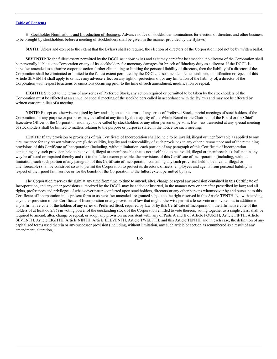 Table of Contents H. Stockholder Nominations and Introduction of Business. Advance notice of stockholder nominations for election of directors and other business to be brought by stockholders before a meeting of stockholders shall be given in the manner provided by the Bylaws. SIXTH: Unless and except to the extent that the Bylaws shall so require, the election of directors of the Corporation need not be by written ballot. SEVENTH: To the fullest extent permitted by the DGCL as it now exists and as it may hereafter be amended, no director of the Corporation shall be personally liable to the Corporation or any of its stockholders for monetary damages for breach of fiduciary duty as a director. If the DGCL is hereafter amended to authorize corporate action further eliminating or limiting the personal liability of directors, then the liability of a director of the Corporation shall be eliminated or limited to the fullest extent permitted by the DGCL, as so amended. No amendment, modification or repeal of this Article SEVENTH shall apply to or have any adverse effect on any right or protection of, or any limitation of the liability of, a director of the Corporation with respect to actions or omissions occurring prior to the time of such amendment, modification or repeal. EIGHTH: Subject to the terms of any series of Preferred Stock, any action required or permitted to be taken by the stockholders of the Corporation must be effected at an annual or special meeting of the stockholders called in accordance with the Bylaws and may not be effected by written consent in lieu of a meeting. NINTH: Except as otherwise required by law and subject to the terms of any series of Preferred Stock, special meetings of stockholders of the Corporation for any purpose or purposes may be called at any time by the majority of the Whole Board or the Chairman of the Board or the Chief Executive Officer of the Corporation and may not be called by stockholders or any other person or persons. Business transacted at any special meeting of stockholders shall be limited to matters relating to the purpose or purposes stated in the notice for such meeting. TENTH: If any provision or provisions of this Certificate of Incorporation shall be held to be invalid, illegal or unenforceable as applied to any circumstance for any reason whatsoever: (i) the validity, legality and enforceability of such provisions in any other circumstance and of the remaining provisions of this Certificate of Incorporation (including, without limitation, each portion of any paragraph of this Certificate of Incorporation containing any such provision held to be invalid, illegal or unenforceable that is not itself held to be invalid, illegal or unenforceable) shall not in any way be affected or impaired thereby and (ii) to the fullest extent possible, the provisions of this Certificate of Incorporation (including, without limitation, each such portion of any paragraph of this Certificate of Incorporation containing any such provision held to be invalid, illegal or unenforceable) shall be construed so as to permit the Corporation to protect its directors, officers, employees and agents from personal liability in respect of their good faith service or for the benefit of the Corporation to the fullest extent permitted by law. The Corporation reserves the right at any time from time to time to amend, alter, change or repeal any provision contained in this Certificate of Incorporation, and any other provisions authorized by the DGCL may be added or inserted, in the manner now or hereafter prescribed by law; and all rights, preferences and privileges of whatsoever nature conferred upon stockholders, directors or any other persons whomsoever by and pursuant to this Certificate of Incorporation in its present form or as hereafter amended are granted subject to the right reserved in this Article TENTH. Notwithstanding any other provision of this Certificate of Incorporation or any provision of law that might otherwise permit a lesser vote or no vote, but in addition to any affirmative vote of the holders of any series of Preferred Stock required by law or by this Certificate of Incorporation, the affirmative vote of the holders of at least 66 2/3% in voting power of the outstanding stock of the Corporation entitled to vote thereon, voting together as a single class, shall be required to amend, alter, change or repeal, or adopt any provision inconsistent with, any of Parts A and B of Article FOURTH, Article FIFTH, Article SEVENTH, Article EIGHTH, Article NINTH, Article ELEVENTH, Article TWELFTH, and this Article TENTH, and in each case, the definition of any capitalized terms used therein or any successor provision (including, without limitation, any such article or section as renumbered as a result of any amendment, alteration,   B-5