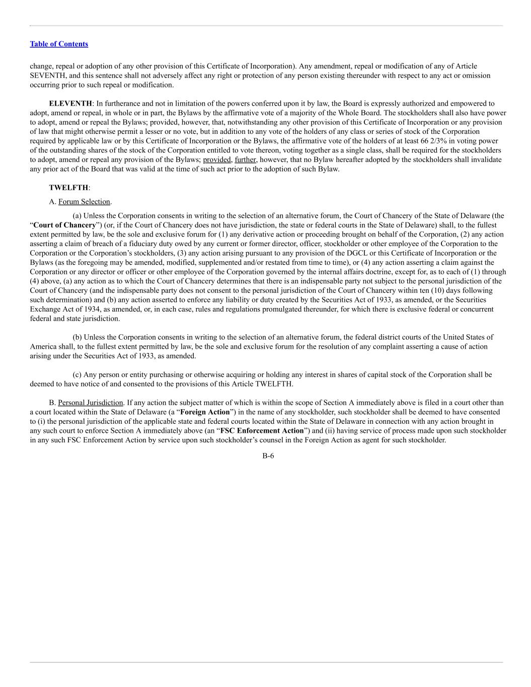 Table of Contents change, repeal or adoption of any other provision of this Certificate of Incorporation). Any amendment, repeal or modification of any of Article SEVENTH, and this sentence shall not adversely affect any right or protection of any person existing thereunder with respect to any act or omission occurring prior to such repeal or modification. ELEVENTH: In furtherance and not in limitation of the powers conferred upon it by law, the Board is expressly authorized and empowered to adopt, amend or repeal, in whole or in part, the Bylaws by the affirmative vote of a majority of the Whole Board. The stockholders shall also have power to adopt, amend or repeal the Bylaws; provided, however, that, notwithstanding any other provision of this Certificate of Incorporation or any provision of law that might otherwise permit a lesser or no vote, but in addition to any vote of the holders of any class or series of stock of the Corporation required by applicable law or by this Certificate of Incorporation or the Bylaws, the affirmative vote of the holders of at least 66 2/3% in voting power of the outstanding shares of the stock of the Corporation entitled to vote thereon, voting together as a single class, shall be required for the stockholders to adopt, amend or repeal any provision of the Bylaws; provided, further, however, that no Bylaw hereafter adopted by the stockholders shall invalidate any prior act of the Board that was valid at the time of such act prior to the adoption of such Bylaw. TWELFTH: A. Forum Selection. (a) Unless the Corporation consents in writing to the selection of an alternative forum, the Court of Chancery of the State of Delaware (the “Court of Chancery”) (or, if the Court of Chancery does not have jurisdiction, the state or federal courts in the State of Delaware) shall, to the fullest extent permitted by law, be the sole and exclusive forum for (1) any derivative action or proceeding brought on behalf of the Corporation, (2) any action asserting a claim of breach of a fiduciary duty owed by any current or former director, officer, stockholder or other employee of the Corporation to the Corporation or the Corporation’s stockholders, (3) any action arising pursuant to any provision of the DGCL or this Certificate of Incorporation or the Bylaws (as the foregoing may be amended, modified, supplemented and/or restated from time to time), or (4) any action asserting a claim against the Corporation or any director or officer or other employee of the Corporation governed by the internal affairs doctrine, except for, as to each of (1) through (4) above, (a) any action as to which the Court of Chancery determines that there is an indispensable party not subject to the personal jurisdiction of the Court of Chancery (and the indispensable party does not consent to the personal jurisdiction of the Court of Chancery within ten (10) days following such determination) and (b) any action asserted to enforce any liability or duty created by the Securities Act of 1933, as amended, or the Securities Exchange Act of 1934, as amended, or, in each case, rules and regulations promulgated thereunder, for which there is exclusive federal or concurrent federal and state jurisdiction. (b) Unless the Corporation consents in writing to the selection of an alternative forum, the federal district courts of the United States of America shall, to the fullest extent permitted by law, be the sole and exclusive forum for the resolution of any complaint asserting a cause of action arising under the Securities Act of 1933, as amended. (c) Any person or entity purchasing or otherwise acquiring or holding any interest in shares of capital stock of the Corporation shall be deemed to have notice of and consented to the provisions of this Article TWELFTH. B. Personal Jurisdiction. If any action the subject matter of which is within the scope of Section A immediately above is filed in a court other than a court located within the State of Delaware (a “Foreign Action”) in the name of any stockholder, such stockholder shall be deemed to have consented to (i) the personal jurisdiction of the applicable state and federal courts located within the State of Delaware in connection with any action brought in any such court to enforce Section A immediately above (an “FSC Enforcement Action”) and (ii) having service of process made upon such stockholder in any such FSC Enforcement Action by service upon such stockholder’s counsel in the Foreign Action as agent for such stockholder.   B-6