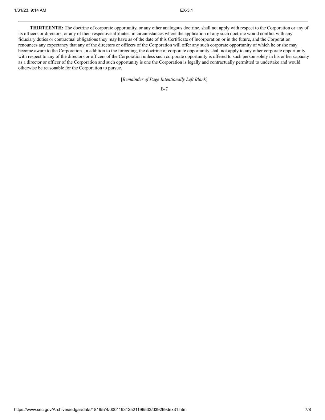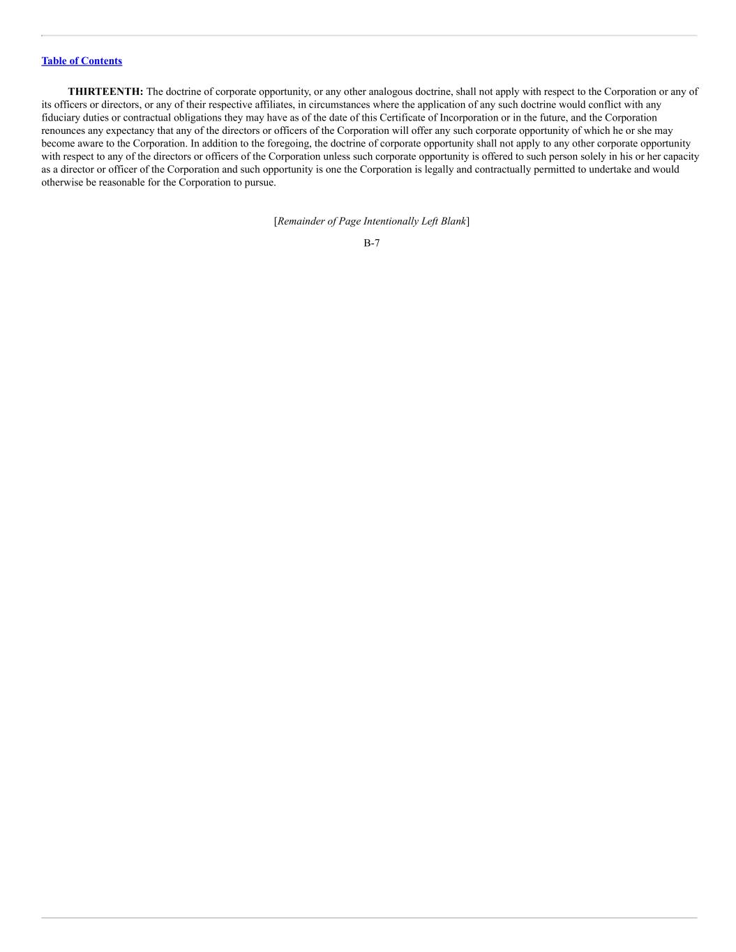 Table of Contents THIRTEENTH: The doctrine of corporate opportunity, or any other analogous doctrine, shall not apply with respect to the Corporation or any of its officers or directors, or any of their respective affiliates, in circumstances where the application of any such doctrine would conflict with any fiduciary duties or contractual obligations they may have as of the date of this Certificate of Incorporation or in the future, and the Corporation renounces any expectancy that any of the directors or officers of the Corporation will offer any such corporate opportunity of which he or she may become aware to the Corporation. In addition to the foregoing, the doctrine of corporate opportunity shall not apply to any other corporate opportunity with respect to any of the directors or officers of the Corporation unless such corporate opportunity is offered to such person solely in his or her capacity as a director or officer of the Corporation and such opportunity is one the Corporation is legally and contractually permitted to undertake and would otherwise be reasonable for the Corporation to pursue. [Remainder of Page Intentionally Left Blank]   B-7