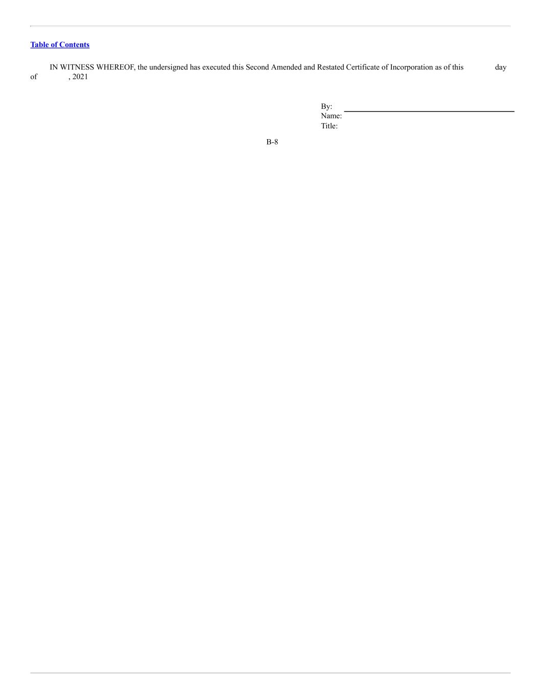 Table of Contents IN WITNESS WHEREOF, the undersigned has executed this Second Amended and Restated Certificate of Incorporation as of this                day of                , 2021   By:               Name:   Title:     B-8