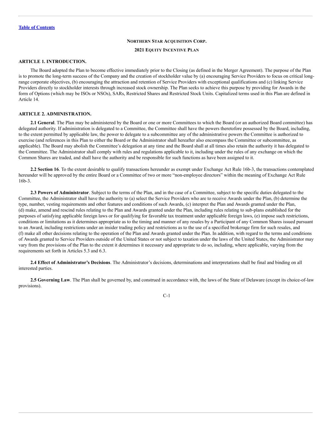 Table of Contents NORTHERN STAR ACQUISITION CORP. 2021 EQUITY INCENTIVE PLAN ARTICLE 1. INTRODUCTION. The Board adopted the Plan to become effective immediately prior to the Closing (as defined in the Merger Agreement). The purpose of the Plan is to promote the long-term success of the Company and the creation of stockholder value by (a) encouraging Service Providers to focus on critical long- range corporate objectives, (b) encouraging the attraction and retention of Service Providers with exceptional qualifications and (c) linking Service Providers directly to stockholder interests through increased stock ownership. The Plan seeks to achieve this purpose by providing for Awards in the form of Options (which may be ISOs or NSOs), SARs, Restricted Shares and Restricted Stock Units. Capitalized terms used in this Plan are defined in Article 14. ARTICLE 2. ADMINISTRATION. 2.1 General. The Plan may be administered by the Board or one or more Committees to which the Board (or an authorized Board committee) has delegated authority. If administration is delegated to a Committee, the Committee shall have the powers theretofore possessed by the Board, including, to the extent permitted by applicable law, the power to delegate to a subcommittee any of the administrative powers the Committee is authorized to exercise (and references in this Plan to either the Board or the Administrator shall hereafter also encompass the Committee or subcommittee, as applicable). The Board may abolish the Committee’s delegation at any time and the Board shall at all times also retain the authority it has delegated to the Committee. The Administrator shall comply with rules and regulations applicable to it, including under the rules of any exchange on which the Common Shares are traded, and shall have the authority and be responsible for such functions as have been assigned to it. 2.2 Section 16. To the extent desirable to qualify transactions hereunder as exempt under Exchange Act Rule 16b-3, the transactions contemplated hereunder will be approved by the entire Board or a Committee of two or more “non-employee directors” within the meaning of Exchange Act Rule 16b-3. 2.3 Powers of Administrator. Subject to the terms of the Plan, and in the case of a Committee, subject to the specific duties delegated to the Committee, the Administrator shall have the authority to (a) select the Service Providers who are to receive Awards under the Plan, (b) determine the type, number, vesting requirements and other features and conditions of such Awards, (c) interpret the Plan and Awards granted under the Plan, (d) make, amend and rescind rules relating to the Plan and Awards granted under the Plan, including rules relating to sub-plans established for the purposes of satisfying applicable foreign laws or for qualifying for favorable tax treatment under applicable foreign laws, (e) impose such restrictions, conditions or limitations as it determines appropriate as to the timing and manner of any resales by a Participant of any Common Shares issued pursuant to an Award, including restrictions under an insider trading policy and restrictions as to the use of a specified brokerage firm for such resales, and (f) make all other decisions relating to the operation of the Plan and Awards granted under the Plan. In addition, with regard to the terms and conditions of Awards granted to Service Providers outside of the United States or not subject to taxation under the laws of the United States, the Administrator may vary from the provisions of the Plan to the extent it determines it necessary and appropriate to do so, including, where applicable, varying from the requirements set forth in Articles 5.3 and 6.3. 2.4 Effect of Administrator’s Decisions. The Administrator’s decisions, determinations and interpretations shall be final and binding on all interested parties. 2.5 Governing Law. The Plan shall be governed by, and construed in accordance with, the laws of the State of Delaware (except its choice-of-law provisions).   C-1