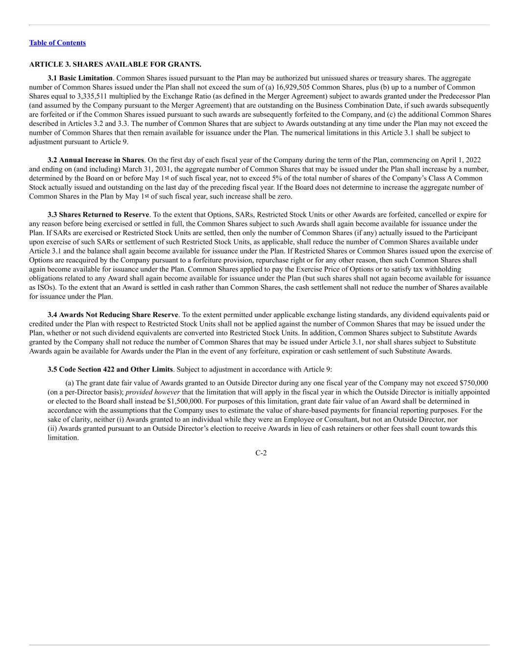 Table of Contents ARTICLE 3. SHARES AVAILABLE FOR GRANTS. 3.1 Basic Limitation. Common Shares issued pursuant to the Plan may be authorized but unissued shares or treasury shares. The aggregate number of Common Shares issued under the Plan shall not exceed the sum of (a) 16,929,505 Common Shares, plus (b) up to a number of Common Shares equal to 3,335,511 multiplied by the Exchange Ratio (as defined in the Merger Agreement) subject to awards granted under the Predecessor Plan (and assumed by the Company pursuant to the Merger Agreement) that are outstanding on the Business Combination Date, if such awards subsequently are forfeited or if the Common Shares issued pursuant to such awards are subsequently forfeited to the Company, and (c) the additional Common Shares described in Articles 3.2 and 3.3. The number of Common Shares that are subject to Awards outstanding at any time under the Plan may not exceed the number of Common Shares that then remain available for issuance under the Plan. The numerical limitations in this Article 3.1 shall be subject to adjustment pursuant to Article 9. 3.2 Annual Increase in Shares. On the first day of each fiscal year of the Company during the term of the Plan, commencing on April 1, 2022 and ending on (and including) March 31, 2031, the aggregate number of Common Shares that may be issued under the Plan shall increase by a number, determined by the Board on or before May 1st of such fiscal year, not to exceed 5% of the total number of shares of the Company’s Class A Common Stock actually issued and outstanding on the last day of the preceding fiscal year. If the Board does not determine to increase the aggregate number of Common Shares in the Plan by May 1st of such fiscal year, such increase shall be zero. 3.3 Shares Returned to Reserve. To the extent that Options, SARs, Restricted Stock Units or other Awards are forfeited, cancelled or expire for any reason before being exercised or settled in full, the Common Shares subject to such Awards shall again become available for issuance under the Plan. If SARs are exercised or Restricted Stock Units are settled, then only the number of Common Shares (if any) actually issued to the Participant upon exercise of such SARs or settlement of such Restricted Stock Units, as applicable, shall reduce the number of Common Shares available under Article 3.1 and the balance shall again become available for issuance under the Plan. If Restricted Shares or Common Shares issued upon the exercise of Options are reacquired by the Company pursuant to a forfeiture provision, repurchase right or for any other reason, then such Common Shares shall again become available for issuance under the Plan. Common Shares applied to pay the Exercise Price of Options or to satisfy tax withholding obligations related to any Award shall again become available for issuance under the Plan (but such shares shall not again become available for issuance as ISOs). To the extent that an Award is settled in cash rather than Common Shares, the cash settlement shall not reduce the number of Shares available for issuance under the Plan. 3.4 Awards Not Reducing Share Reserve. To the extent permitted under applicable exchange listing standards, any dividend equivalents paid or credited under the Plan with respect to Restricted Stock Units shall not be applied against the number of Common Shares that may be issued under the Plan, whether or not such dividend equivalents are converted into Restricted Stock Units. In addition, Common Shares subject to Substitute Awards granted by the Company shall not reduce the number of Common Shares that may be issued under Article 3.1, nor shall shares subject to Substitute Awards again be available for Awards under the Plan in the event of any forfeiture, expiration or cash settlement of such Substitute Awards. 3.5 Code Section 422 and Other Limits. Subject to adjustment in accordance with Article 9: (a) The grant date fair value of Awards granted to an Outside Director during any one fiscal year of the Company may not exceed $750,000 (on a per-Director basis); provided however that the limitation that will apply in the fiscal year in which the Outside Director is initially appointed or elected to the Board shall instead be $1,500,000. For purposes of this limitation, grant date fair value of an Award shall be determined in accordance with the assumptions that the Company uses to estimate the value of share-based payments for financial reporting purposes. For the sake of clarity, neither (i) Awards granted to an individual while they were an Employee or Consultant, but not an Outside Director, nor (ii) Awards granted pursuant to an Outside Director’s election to receive Awards in lieu of cash retainers or other fees shall count towards this limitation.   C-2