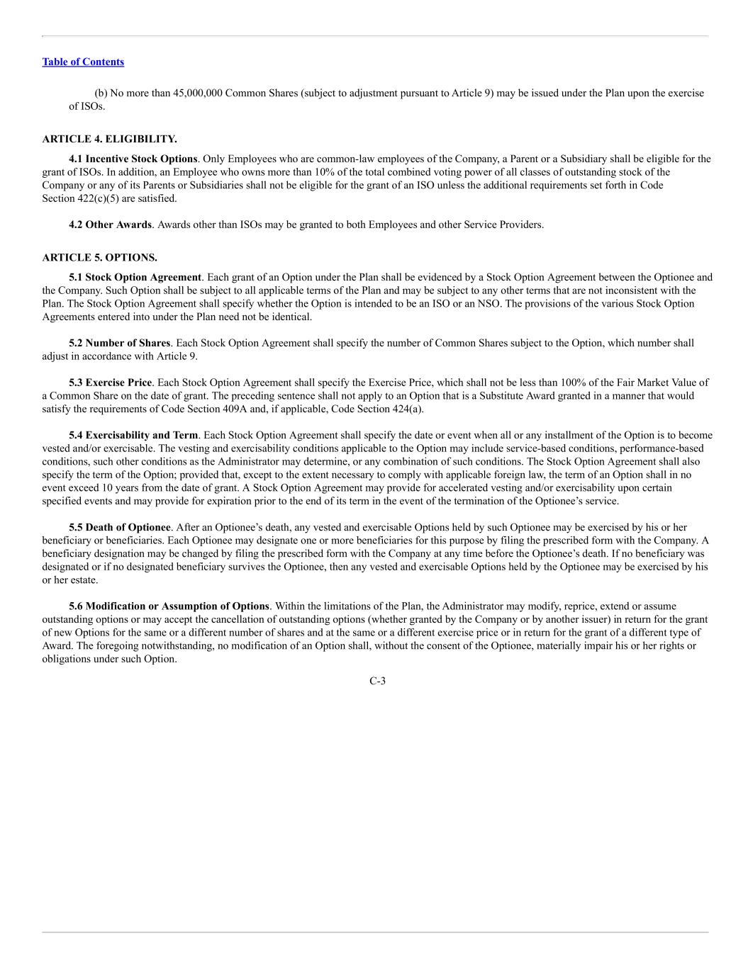 Table of Contents (b) No more than 45,000,000 Common Shares (subject to adjustment pursuant to Article 9) may be issued under the Plan upon the exercise of ISOs. ARTICLE 4. ELIGIBILITY. 4.1 Incentive Stock Options. Only Employees who are common-law employees of the Company, a Parent or a Subsidiary shall be eligible for the grant of ISOs. In addition, an Employee who owns more than 10% of the total combined voting power of all classes of outstanding stock of the Company or any of its Parents or Subsidiaries shall not be eligible for the grant of an ISO unless the additional requirements set forth in Code Section 422(c)(5) are satisfied. 4.2 Other Awards. Awards other than ISOs may be granted to both Employees and other Service Providers. ARTICLE 5. OPTIONS. 5.1 Stock Option Agreement. Each grant of an Option under the Plan shall be evidenced by a Stock Option Agreement between the Optionee and the Company. Such Option shall be subject to all applicable terms of the Plan and may be subject to any other terms that are not inconsistent with the Plan. The Stock Option Agreement shall specify whether the Option is intended to be an ISO or an NSO. The provisions of the various Stock Option Agreements entered into under the Plan need not be identical. 5.2 Number of Shares. Each Stock Option Agreement shall specify the number of Common Shares subject to the Option, which number shall adjust in accordance with Article 9. 5.3 Exercise Price. Each Stock Option Agreement shall specify the Exercise Price, which shall not be less than 100% of the Fair Market Value of a Common Share on the date of grant. The preceding sentence shall not apply to an Option that is a Substitute Award granted in a manner that would satisfy the requirements of Code Section 409A and, if applicable, Code Section 424(a). 5.4 Exercisability and Term. Each Stock Option Agreement shall specify the date or event when all or any installment of the Option is to become vested and/or exercisable. The vesting and exercisability conditions applicable to the Option may include service-based conditions, performance-based conditions, such other conditions as the Administrator may determine, or any combination of such conditions. The Stock Option Agreement shall also specify the term of the Option; provided that, except to the extent necessary to comply with applicable foreign law, the term of an Option shall in no event exceed 10 years from the date of grant. A Stock Option Agreement may provide for accelerated vesting and/or exercisability upon certain specified events and may provide for expiration prior to the end of its term in the event of the termination of the Optionee’s service. 5.5 Death of Optionee. After an Optionee’s death, any vested and exercisable Options held by such Optionee may be exercised by his or her beneficiary or beneficiaries. Each Optionee may designate one or more beneficiaries for this purpose by filing the prescribed form with the Company. A beneficiary designation may be changed by filing the prescribed form with the Company at any time before the Optionee’s death. If no beneficiary was designated or if no designated beneficiary survives the Optionee, then any vested and exercisable Options held by the Optionee may be exercised by his or her estate. 5.6 Modification or Assumption of Options. Within the limitations of the Plan, the Administrator may modify, reprice, extend or assume outstanding options or may accept the cancellation of outstanding options (whether granted by the Company or by another issuer) in return for the grant of new Options for the same or a different number of shares and at the same or a different exercise price or in return for the grant of a different type of Award. The foregoing notwithstanding, no modification of an Option shall, without the consent of the Optionee, materially impair his or her rights or obligations under such Option.   C-3