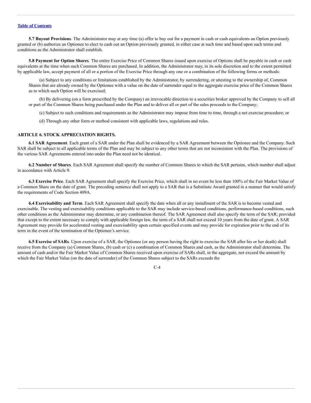 Table of Contents 5.7 Buyout Provisions. The Administrator may at any time (a) offer to buy out for a payment in cash or cash equivalents an Option previously granted or (b) authorize an Optionee to elect to cash out an Option previously granted, in either case at such time and based upon such terms and conditions as the Administrator shall establish. 5.8 Payment for Option Shares. The entire Exercise Price of Common Shares issued upon exercise of Options shall be payable in cash or cash equivalents at the time when such Common Shares are purchased. In addition, the Administrator may, in its sole discretion and to the extent permitted by applicable law, accept payment of all or a portion of the Exercise Price through any one or a combination of the following forms or methods: (a) Subject to any conditions or limitations established by the Administrator, by surrendering, or attesting to the ownership of, Common Shares that are already owned by the Optionee with a value on the date of surrender equal to the aggregate exercise price of the Common Shares as to which such Option will be exercised; (b) By delivering (on a form prescribed by the Company) an irrevocable direction to a securities broker approved by the Company to sell all or part of the Common Shares being purchased under the Plan and to deliver all or part of the sales proceeds to the Company; (c) Subject to such conditions and requirements as the Administrator may impose from time to time, through a net exercise procedure; or (d) Through any other form or method consistent with applicable laws, regulations and rules. ARTICLE 6. STOCK APPRECIATION RIGHTS. 6.1 SAR Agreement. Each grant of a SAR under the Plan shall be evidenced by a SAR Agreement between the Optionee and the Company. Such SAR shall be subject to all applicable terms of the Plan and may be subject to any other terms that are not inconsistent with the Plan. The provisions of the various SAR Agreements entered into under the Plan need not be identical. 6.2 Number of Shares. Each SAR Agreement shall specify the number of Common Shares to which the SAR pertains, which number shall adjust in accordance with Article 9. 6.3 Exercise Price. Each SAR Agreement shall specify the Exercise Price, which shall in no event be less than 100% of the Fair Market Value of a Common Share on the date of grant. The preceding sentence shall not apply to a SAR that is a Substitute Award granted in a manner that would satisfy the requirements of Code Section 409A. 6.4 Exercisability and Term. Each SAR Agreement shall specify the date when all or any installment of the SAR is to become vested and exercisable. The vesting and exercisability conditions applicable to the SAR may include service-based conditions, performance-based conditions, such other conditions as the Administrator may determine, or any combination thereof. The SAR Agreement shall also specify the term of the SAR; provided that except to the extent necessary to comply with applicable foreign law, the term of a SAR shall not exceed 10 years from the date of grant. A SAR Agreement may provide for accelerated vesting and exercisability upon certain specified events and may provide for expiration prior to the end of its term in the event of the termination of the Optionee’s service. 6.5 Exercise of SARs. Upon exercise of a SAR, the Optionee (or any person having the right to exercise the SAR after his or her death) shall receive from the Company (a) Common Shares, (b) cash or (c) a combination of Common Shares and cash, as the Administrator shall determine. The amount of cash and/or the Fair Market Value of Common Shares received upon exercise of SARs shall, in the aggregate, not exceed the amount by which the Fair Market Value (on the date of surrender) of the Common Shares subject to the SARs exceeds the   C-4