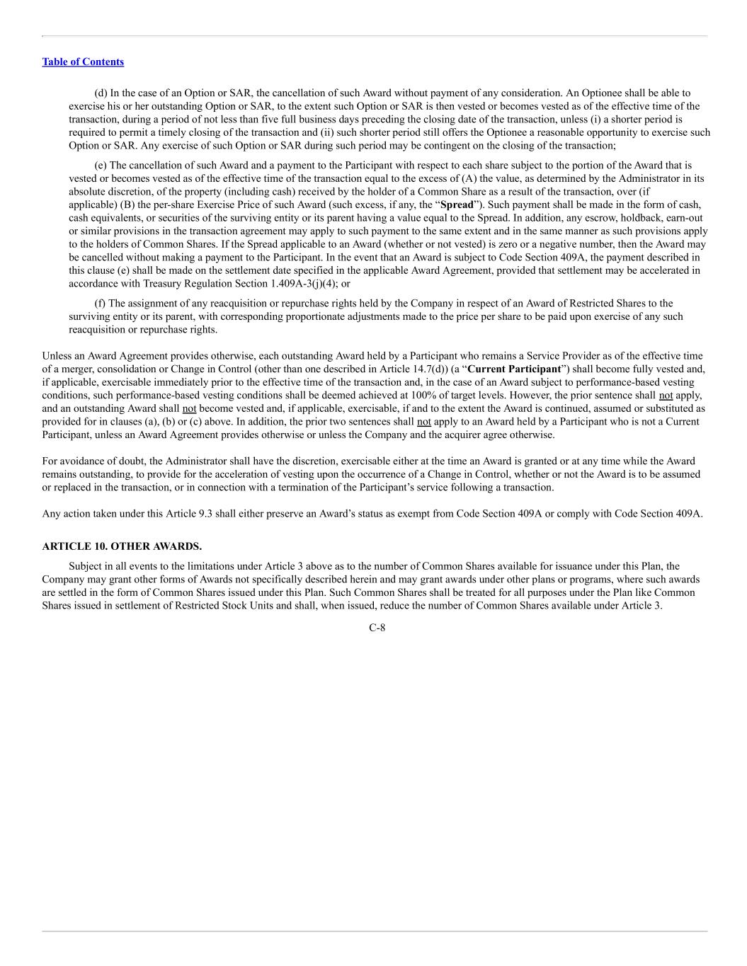 Table of Contents (d) In the case of an Option or SAR, the cancellation of such Award without payment of any consideration. An Optionee shall be able to exercise his or her outstanding Option or SAR, to the extent such Option or SAR is then vested or becomes vested as of the effective time of the transaction, during a period of not less than five full business days preceding the closing date of the transaction, unless (i) a shorter period is required to permit a timely closing of the transaction and (ii) such shorter period still offers the Optionee a reasonable opportunity to exercise such Option or SAR. Any exercise of such Option or SAR during such period may be contingent on the closing of the transaction; (e) The cancellation of such Award and a payment to the Participant with respect to each share subject to the portion of the Award that is vested or becomes vested as of the effective time of the transaction equal to the excess of (A) the value, as determined by the Administrator in its absolute discretion, of the property (including cash) received by the holder of a Common Share as a result of the transaction, over (if applicable) (B) the per-share Exercise Price of such Award (such excess, if any, the “Spread”). Such payment shall be made in the form of cash, cash equivalents, or securities of the surviving entity or its parent having a value equal to the Spread. In addition, any escrow, holdback, earn-out or similar provisions in the transaction agreement may apply to such payment to the same extent and in the same manner as such provisions apply to the holders of Common Shares. If the Spread applicable to an Award (whether or not vested) is zero or a negative number, then the Award may be cancelled without making a payment to the Participant. In the event that an Award is subject to Code Section 409A, the payment described in this clause (e) shall be made on the settlement date specified in the applicable Award Agreement, provided that settlement may be accelerated in accordance with Treasury Regulation Section 1.409A-3(j)(4); or (f) The assignment of any reacquisition or repurchase rights held by the Company in respect of an Award of Restricted Shares to the surviving entity or its parent, with corresponding proportionate adjustments made to the price per share to be paid upon exercise of any such reacquisition or repurchase rights. Unless an Award Agreement provides otherwise, each outstanding Award held by a Participant who remains a Service Provider as of the effective time of a merger, consolidation or Change in Control (other than one described in Article 14.7(d)) (a “Current Participant”) shall become fully vested and, if applicable, exercisable immediately prior to the effective time of the transaction and, in the case of an Award subject to performance-based vesting conditions, such performance-based vesting conditions shall be deemed achieved at 100% of target levels. However, the prior sentence shall not apply, and an outstanding Award shall not become vested and, if applicable, exercisable, if and to the extent the Award is continued, assumed or substituted as provided for in clauses (a), (b) or (c) above. In addition, the prior two sentences shall not apply to an Award held by a Participant who is not a Current Participant, unless an Award Agreement provides otherwise or unless the Company and the acquirer agree otherwise. For avoidance of doubt, the Administrator shall have the discretion, exercisable either at the time an Award is granted or at any time while the Award remains outstanding, to provide for the acceleration of vesting upon the occurrence of a Change in Control, whether or not the Award is to be assumed or replaced in the transaction, or in connection with a termination of the Participant’s service following a transaction. Any action taken under this Article 9.3 shall either preserve an Award’s status as exempt from Code Section 409A or comply with Code Section 409A. ARTICLE 10. OTHER AWARDS. Subject in all events to the limitations under Article 3 above as to the number of Common Shares available for issuance under this Plan, the Company may grant other forms of Awards not specifically described herein and may grant awards under other plans or programs, where such awards are settled in the form of Common Shares issued under this Plan. Such Common Shares shall be treated for all purposes under the Plan like Common Shares issued in settlement of Restricted Stock Units and shall, when issued, reduce the number of Common Shares available under Article 3.   C-8