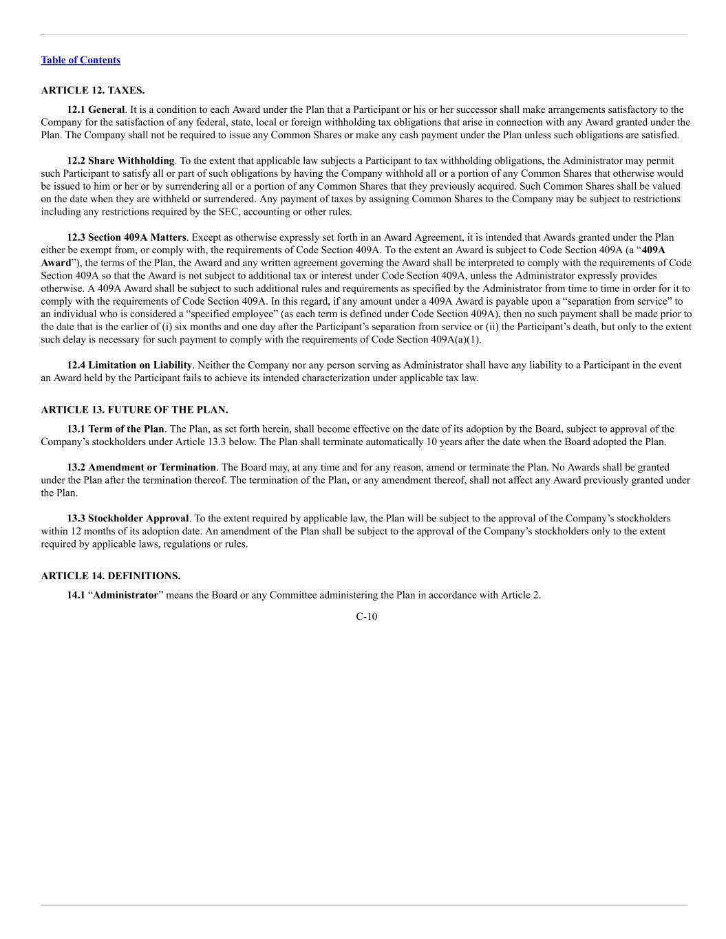 Table of Contents ARTICLE 12. TAXES. 12.1 General. It is a condition to each Award under the Plan that a Participant or his or her successor shall make arrangements satisfactory to the Company for the satisfaction of any federal, state, local or foreign withholding tax obligations that arise in connection with any Award granted under the Plan. The Company shall not be required to issue any Common Shares or make any cash payment under the Plan unless such obligations are satisfied. 12.2 Share Withholding. To the extent that applicable law subjects a Participant to tax withholding obligations, the Administrator may permit such Participant to satisfy all or part of such obligations by having the Company withhold all or a portion of any Common Shares that otherwise would be issued to him or her or by surrendering all or a portion of any Common Shares that they previously acquired. Such Common Shares shall be valued on the date when they are withheld or surrendered. Any payment of taxes by assigning Common Shares to the Company may be subject to restrictions including any restrictions required by the SEC, accounting or other rules. 12.3 Section 409A Matters. Except as otherwise expressly set forth in an Award Agreement, it is intended that Awards granted under the Plan either be exempt from, or comply with, the requirements of Code Section 409A. To the extent an Award is subject to Code Section 409A (a “409A Award”), the terms of the Plan, the Award and any written agreement governing the Award shall be interpreted to comply with the requirements of Code Section 409A so that the Award is not subject to additional tax or interest under Code Section 409A, unless the Administrator expressly provides otherwise. A 409A Award shall be subject to such additional rules and requirements as specified by the Administrator from time to time in order for it to comply with the requirements of Code Section 409A. In this regard, if any amount under a 409A Award is payable upon a “separation from service” to an individual who is considered a “specified employee” (as each term is defined under Code Section 409A), then no such payment shall be made prior to the date that is the earlier of (i) six months and one day after the Participant’s separation from service or (ii) the Participant’s death, but only to the extent such delay is necessary for such payment to comply with the requirements of Code Section 409A(a)(1). 12.4 Limitation on Liability. Neither the Company nor any person serving as Administrator shall have any liability to a Participant in the event an Award held by the Participant fails to achieve its intended characterization under applicable tax law. ARTICLE 13. FUTURE OF THE PLAN. 13.1 Term of the Plan. The Plan, as set forth herein, shall become effective on the date of its adoption by the Board, subject to approval of the Company’s stockholders under Article 13.3 below. The Plan shall terminate automatically 10 years after the date when the Board adopted the Plan. 13.2 Amendment or Termination. The Board may, at any time and for any reason, amend or terminate the Plan. No Awards shall be granted under the Plan after the termination thereof. The termination of the Plan, or any amendment thereof, shall not affect any Award previously granted under the Plan. 13.3 Stockholder Approval. To the extent required by applicable law, the Plan will be subject to the approval of the Company’s stockholders within 12 months of its adoption date. An amendment of the Plan shall be subject to the approval of the Company’s stockholders only to the extent required by applicable laws, regulations or rules. ARTICLE 14. DEFINITIONS. 14.1 “Administrator” means the Board or any Committee administering the Plan in accordance with Article 2.   C-10