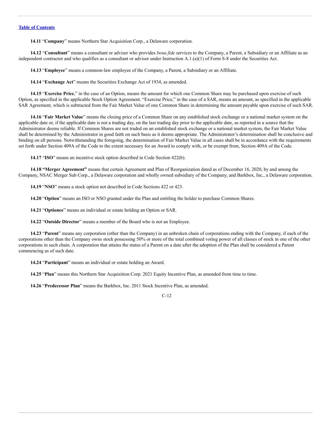 Table of Contents 14.11 “Company” means Northern Star Acquisition Corp., a Delaware corporation. 14.12 “Consultant” means a consultant or adviser who provides bona fide services to the Company, a Parent, a Subsidiary or an Affiliate as an independent contractor and who qualifies as a consultant or advisor under Instruction A.1.(a)(1) of Form S-8 under the Securities Act. 14.13 “Employee” means a common-law employee of the Company, a Parent, a Subsidiary or an Affiliate. 14.14 “Exchange Act” means the Securities Exchange Act of 1934, as amended. 14.15 “Exercise Price,” in the case of an Option, means the amount for which one Common Share may be purchased upon exercise of such Option, as specified in the applicable Stock Option Agreement. “Exercise Price,” in the case of a SAR, means an amount, as specified in the applicable SAR Agreement, which is subtracted from the Fair Market Value of one Common Share in determining the amount payable upon exercise of such SAR. 14.16 “Fair Market Value” means the closing price of a Common Share on any established stock exchange or a national market system on the applicable date or, if the applicable date is not a trading day, on the last trading day prior to the applicable date, as reported in a source that the Administrator deems reliable. If Common Shares are not traded on an established stock exchange or a national market system, the Fair Market Value shall be determined by the Administrator in good faith on such basis as it deems appropriate. The Administrator’s determination shall be conclusive and binding on all persons. Notwithstanding the foregoing, the determination of Fair Market Value in all cases shall be in accordance with the requirements set forth under Section 409A of the Code to the extent necessary for an Award to comply with, or be exempt from, Section 409A of the Code. 14.17 “ISO” means an incentive stock option described in Code Section 422(b). 14.18 “Merger Agreement” means that certain Agreement and Plan of Reorganization dated as of December 16, 2020, by and among the Company, NSAC Merger Sub Corp., a Delaware corporation and wholly owned subsidiary of the Company, and Barkbox, Inc., a Delaware corporation. 14.19 “NSO” means a stock option not described in Code Sections 422 or 423. 14.20 “Option” means an ISO or NSO granted under the Plan and entitling the holder to purchase Common Shares. 14.21 “Optionee” means an individual or estate holding an Option or SAR. 14.22 “Outside Director” means a member of the Board who is not an Employee. 14.23 “Parent” means any corporation (other than the Company) in an unbroken chain of corporations ending with the Company, if each of the corporations other than the Company owns stock possessing 50% or more of the total combined voting power of all classes of stock in one of the other corporations in such chain. A corporation that attains the status of a Parent on a date after the adoption of the Plan shall be considered a Parent commencing as of such date. 14.24 “Participant” means an individual or estate holding an Award. 14.25 “Plan” means this Northern Star Acquisition Corp. 2021 Equity Incentive Plan, as amended from time to time. 14.26 “Predecessor Plan” means the Barkbox, Inc. 2011 Stock Incentive Plan, as amended.   C-12