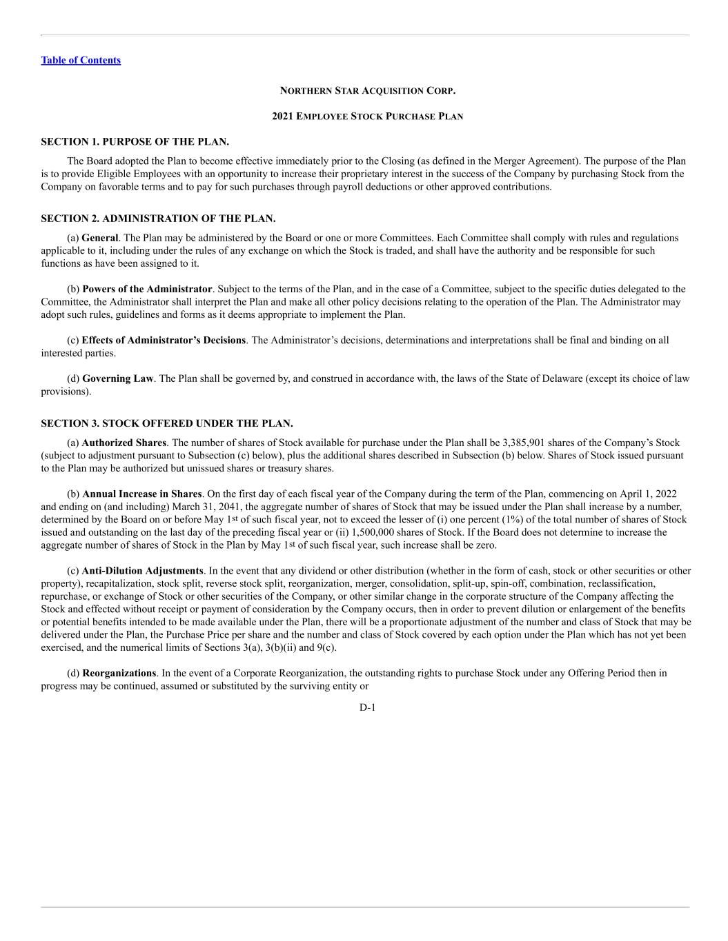 Table of Contents NORTHERN STAR ACQUISITION CORP. 2021 EMPLOYEE STOCK PURCHASE PLAN SECTION 1. PURPOSE OF THE PLAN. The Board adopted the Plan to become effective immediately prior to the Closing (as defined in the Merger Agreement). The purpose of the Plan is to provide Eligible Employees with an opportunity to increase their proprietary interest in the success of the Company by purchasing Stock from the Company on favorable terms and to pay for such purchases through payroll deductions or other approved contributions. SECTION 2. ADMINISTRATION OF THE PLAN. (a) General. The Plan may be administered by the Board or one or more Committees. Each Committee shall comply with rules and regulations applicable to it, including under the rules of any exchange on which the Stock is traded, and shall have the authority and be responsible for such functions as have been assigned to it. (b) Powers of the Administrator. Subject to the terms of the Plan, and in the case of a Committee, subject to the specific duties delegated to the Committee, the Administrator shall interpret the Plan and make all other policy decisions relating to the operation of the Plan. The Administrator may adopt such rules, guidelines and forms as it deems appropriate to implement the Plan. (c) Effects of Administrator’s Decisions. The Administrator’s decisions, determinations and interpretations shall be final and binding on all interested parties. (d) Governing Law. The Plan shall be governed by, and construed in accordance with, the laws of the State of Delaware (except its choice of law provisions). SECTION 3. STOCK OFFERED UNDER THE PLAN. (a) Authorized Shares. The number of shares of Stock available for purchase under the Plan shall be 3,385,901 shares of the Company’s Stock (subject to adjustment pursuant to Subsection (c) below), plus the additional shares described in Subsection (b) below. Shares of Stock issued pursuant to the Plan may be authorized but unissued shares or treasury shares. (b) Annual Increase in Shares. On the first day of each fiscal year of the Company during the term of the Plan, commencing on April 1, 2022 and ending on (and including) March 31, 2041, the aggregate number of shares of Stock that may be issued under the Plan shall increase by a number, determined by the Board on or before May 1st of such fiscal year, not to exceed the lesser of (i) one percent (1%) of the total number of shares of Stock issued and outstanding on the last day of the preceding fiscal year or (ii) 1,500,000 shares of Stock. If the Board does not determine to increase the aggregate number of shares of Stock in the Plan by May 1st of such fiscal year, such increase shall be zero. (c) Anti-Dilution Adjustments. In the event that any dividend or other distribution (whether in the form of cash, stock or other securities or other property), recapitalization, stock split, reverse stock split, reorganization, merger, consolidation, split-up, spin-off, combination, reclassification, repurchase, or exchange of Stock or other securities of the Company, or other similar change in the corporate structure of the Company affecting the Stock and effected without receipt or payment of consideration by the Company occurs, then in order to prevent dilution or enlargement of the benefits or potential benefits intended to be made available under the Plan, there will be a proportionate adjustment of the number and class of Stock that may be delivered under the Plan, the Purchase Price per share and the number and class of Stock covered by each option under the Plan which has not yet been exercised, and the numerical limits of Sections 3(a), 3(b)(ii) and 9(c). (d) Reorganizations. In the event of a Corporate Reorganization, the outstanding rights to purchase Stock under any Offering Period then in progress may be continued, assumed or substituted by the surviving entity or   D-1
