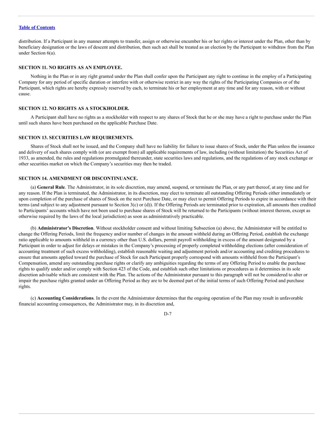 Table of Contents distribution. If a Participant in any manner attempts to transfer, assign or otherwise encumber his or her rights or interest under the Plan, other than by beneficiary designation or the laws of descent and distribution, then such act shall be treated as an election by the Participant to withdraw from the Plan under Section 6(a). SECTION 11. NO RIGHTS AS AN EMPLOYEE. Nothing in the Plan or in any right granted under the Plan shall confer upon the Participant any right to continue in the employ of a Participating Company for any period of specific duration or interfere with or otherwise restrict in any way the rights of the Participating Companies or of the Participant, which rights are hereby expressly reserved by each, to terminate his or her employment at any time and for any reason, with or without cause. SECTION 12. NO RIGHTS AS A STOCKHOLDER. A Participant shall have no rights as a stockholder with respect to any shares of Stock that he or she may have a right to purchase under the Plan until such shares have been purchased on the applicable Purchase Date. SECTION 13. SECURITIES LAW REQUIREMENTS. Shares of Stock shall not be issued, and the Company shall have no liability for failure to issue shares of Stock, under the Plan unless the issuance and delivery of such shares comply with (or are exempt from) all applicable requirements of law, including (without limitation) the Securities Act of 1933, as amended, the rules and regulations promulgated thereunder, state securities laws and regulations, and the regulations of any stock exchange or other securities market on which the Company’s securities may then be traded. SECTION 14. AMENDMENT OR DISCONTINUANCE. (a) General Rule. The Administrator, in its sole discretion, may amend, suspend, or terminate the Plan, or any part thereof, at any time and for any reason. If the Plan is terminated, the Administrator, in its discretion, may elect to terminate all outstanding Offering Periods either immediately or upon completion of the purchase of shares of Stock on the next Purchase Date, or may elect to permit Offering Periods to expire in accordance with their terms (and subject to any adjustment pursuant to Section 3(c) or (d)). If the Offering Periods are terminated prior to expiration, all amounts then credited to Participants’ accounts which have not been used to purchase shares of Stock will be returned to the Participants (without interest thereon, except as otherwise required by the laws of the local jurisdiction) as soon as administratively practicable. (b) Administrator’s Discretion. Without stockholder consent and without limiting Subsection (a) above, the Administrator will be entitled to change the Offering Periods, limit the frequency and/or number of changes in the amount withheld during an Offering Period, establish the exchange ratio applicable to amounts withheld in a currency other than U.S. dollars, permit payroll withholding in excess of the amount designated by a Participant in order to adjust for delays or mistakes in the Company’s processing of properly completed withholding elections (after consideration of accounting treatment of such excess withholding), establish reasonable waiting and adjustment periods and/or accounting and crediting procedures to ensure that amounts applied toward the purchase of Stock for each Participant properly correspond with amounts withheld from the Participant’s Compensation, amend any outstanding purchase rights or clarify any ambiguities regarding the terms of any Offering Period to enable the purchase rights to qualify under and/or comply with Section 423 of the Code, and establish such other limitations or procedures as it determines in its sole discretion advisable which are consistent with the Plan. The actions of the Administrator pursuant to this paragraph will not be considered to alter or impair the purchase rights granted under an Offering Period as they are to be deemed part of the initial terms of such Offering Period and purchase rights. (c) Accounting Considerations. In the event the Administrator determines that the ongoing operation of the Plan may result in unfavorable financial accounting consequences, the Administrator may, in its discretion and,   D-7