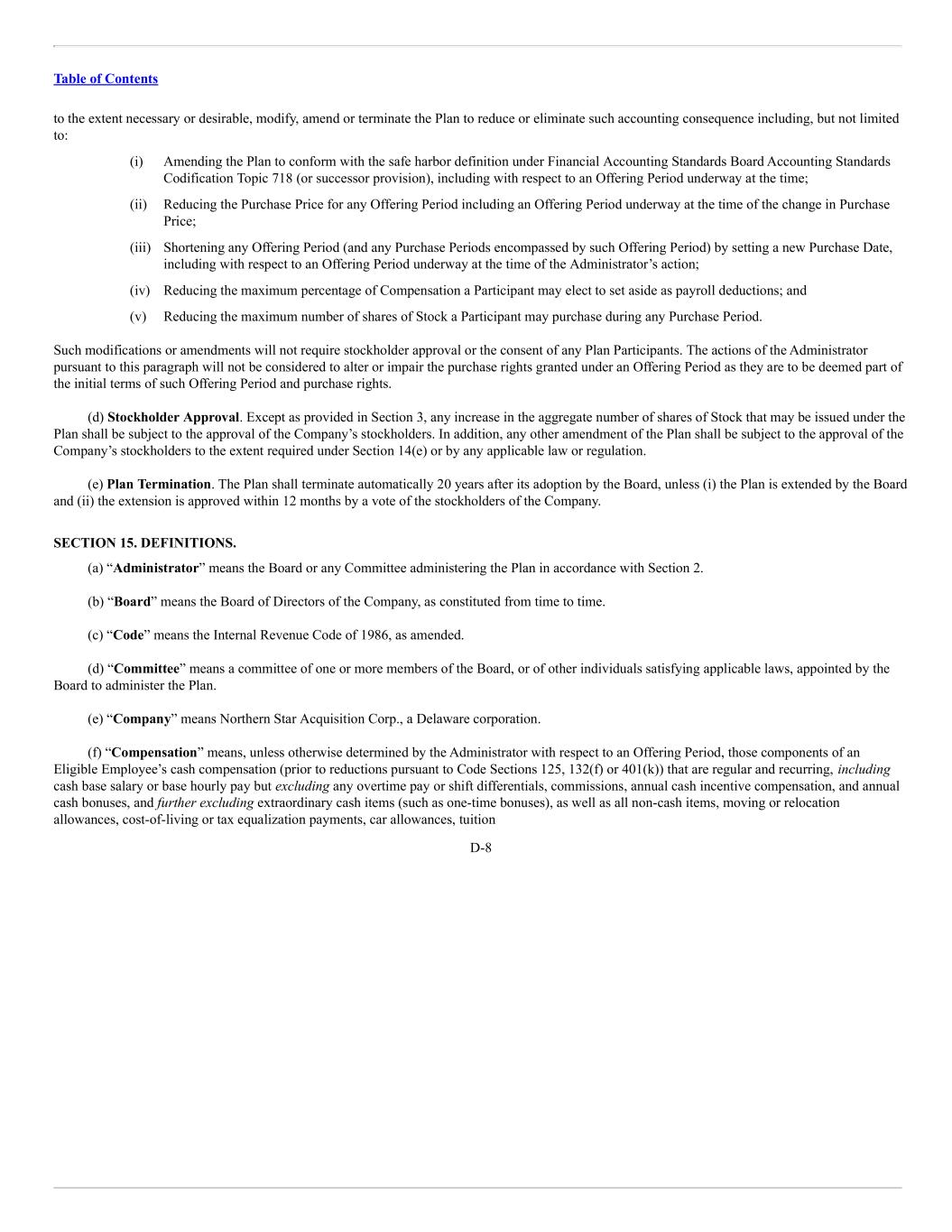 Table of Contents to the extent necessary or desirable, modify, amend or terminate the Plan to reduce or eliminate such accounting consequence including, but not limited to:     (i) Amending the Plan to conform with the safe harbor definition under Financial Accounting Standards Board Accounting Standards Codification Topic 718 (or successor provision), including with respect to an Offering Period underway at the time;     (ii) Reducing the Purchase Price for any Offering Period including an Offering Period underway at the time of the change in Purchase Price;     (iii) Shortening any Offering Period (and any Purchase Periods encompassed by such Offering Period) by setting a new Purchase Date, including with respect to an Offering Period underway at the time of the Administrator’s action;     (iv) Reducing the maximum percentage of Compensation a Participant may elect to set aside as payroll deductions; and     (v) Reducing the maximum number of shares of Stock a Participant may purchase during any Purchase Period. Such modifications or amendments will not require stockholder approval or the consent of any Plan Participants. The actions of the Administrator pursuant to this paragraph will not be considered to alter or impair the purchase rights granted under an Offering Period as they are to be deemed part of the initial terms of such Offering Period and purchase rights. (d) Stockholder Approval. Except as provided in Section 3, any increase in the aggregate number of shares of Stock that may be issued under the Plan shall be subject to the approval of the Company’s stockholders. In addition, any other amendment of the Plan shall be subject to the approval of the Company’s stockholders to the extent required under Section 14(e) or by any applicable law or regulation. (e) Plan Termination. The Plan shall terminate automatically 20 years after its adoption by the Board, unless (i) the Plan is extended by the Board and (ii) the extension is approved within 12 months by a vote of the stockholders of the Company. SECTION 15. DEFINITIONS. (a) “Administrator” means the Board or any Committee administering the Plan in accordance with Section 2. (b) “Board” means the Board of Directors of the Company, as constituted from time to time. (c) “Code” means the Internal Revenue Code of 1986, as amended. (d) “Committee” means a committee of one or more members of the Board, or of other individuals satisfying applicable laws, appointed by the Board to administer the Plan. (e) “Company” means Northern Star Acquisition Corp., a Delaware corporation. (f) “Compensation” means, unless otherwise determined by the Administrator with respect to an Offering Period, those components of an Eligible Employee’s cash compensation (prior to reductions pursuant to Code Sections 125, 132(f) or 401(k)) that are regular and recurring, including cash base salary or base hourly pay but excluding any overtime pay or shift differentials, commissions, annual cash incentive compensation, and annual cash bonuses, and further excluding extraordinary cash items (such as one-time bonuses), as well as all non-cash items, moving or relocation allowances, cost-of-living or tax equalization payments, car allowances, tuition   D-8