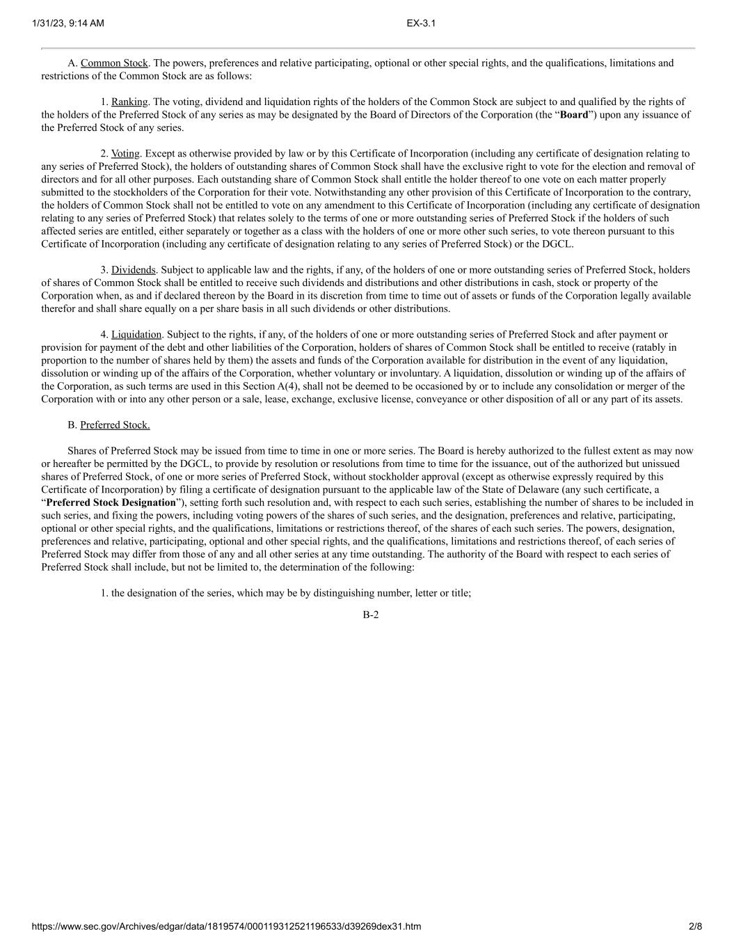1/31/23, 9:14 AM EX-3.1 https://www.sec.gov/Archives/edgar/data/1819574/000119312521196533/d39269dex31.htm 2/8 A. Common Stock. The powers, preferences and relative participating, optional or other special rights, and the qualifications, limitations and restrictions of the Common Stock are as follows: 1. Ranking. The voting, dividend and liquidation rights of the holders of the Common Stock are subject to and qualified by the rights of the holders of the Preferred Stock of any series as may be designated by the Board of Directors of the Corporation (the “Board”) upon any issuance of the Preferred Stock of any series. 2. Voting. Except as otherwise provided by law or by this Certificate of Incorporation (including any certificate of designation relating to any series of Preferred Stock), the holders of outstanding shares of Common Stock shall have the exclusive right to vote for the election and removal of directors and for all other purposes. Each outstanding share of Common Stock shall entitle the holder thereof to one vote on each matter properly submitted to the stockholders of the Corporation for their vote. Notwithstanding any other provision of this Certificate of Incorporation to the contrary, the holders of Common Stock shall not be entitled to vote on any amendment to this Certificate of Incorporation (including any certificate of designation relating to any series of Preferred Stock) that relates solely to the terms of one or more outstanding series of Preferred Stock if the holders of such affected series are entitled, either separately or together as a class with the holders of one or more other such series, to vote thereon pursuant to this Certificate of Incorporation (including any certificate of designation relating to any series of Preferred Stock) or the DGCL. 3. Dividends. Subject to applicable law and the rights, if any, of the holders of one or more outstanding series of Preferred Stock, holders of shares of Common Stock shall be entitled to receive such dividends and distributions and other distributions in cash, stock or property of the Corporation when, as and if declared thereon by the Board in its discretion from time to time out of assets or funds of the Corporation legally available therefor and shall share equally on a per share basis in all such dividends or other distributions. 4. Liquidation. Subject to the rights, if any, of the holders of one or more outstanding series of Preferred Stock and after payment or provision for payment of the debt and other liabilities of the Corporation, holders of shares of Common Stock shall be entitled to receive (ratably in proportion to the number of shares held by them) the assets and funds of the Corporation available for distribution in the event of any liquidation, dissolution or winding up of the affairs of the Corporation, whether voluntary or involuntary. A liquidation, dissolution or winding up of the affairs of the Corporation, as such terms are used in this Section A(4), shall not be deemed to be occasioned by or to include any consolidation or merger of the Corporation with or into any other person or a sale, lease, exchange, exclusive license, conveyance or other disposition of all or any part of its assets. B. Preferred Stock. Shares of Preferred Stock may be issued from time to time in one or more series. The Board is hereby authorized to the fullest extent as may now or hereafter be permitted by the DGCL, to provide by resolution or resolutions from time to time for the issuance, out of the authorized but unissued shares of Preferred Stock, of one or more series of Preferred Stock, without stockholder approval (except as otherwise expressly required by this Certificate of Incorporation) by filing a certificate of designation pursuant to the applicable law of the State of Delaware (any such certificate, a “Preferred Stock Designation”), setting forth such resolution and, with respect to each such series, establishing the number of shares to be included in such series, and fixing the powers, including voting powers of the shares of such series, and the designation, preferences and relative, participating, optional or other special rights, and the qualifications, limitations or restrictions thereof, of the shares of each such series. The powers, designation, preferences and relative, participating, optional and other special rights, and the qualifications, limitations and restrictions thereof, of each series of Preferred Stock may differ from those of any and all other series at any time outstanding. The authority of the Board with respect to each series of Preferred Stock shall include, but not be limited to, the determination of the following: 1. the designation of the series, which may be by distinguishing number, letter or title; B-2