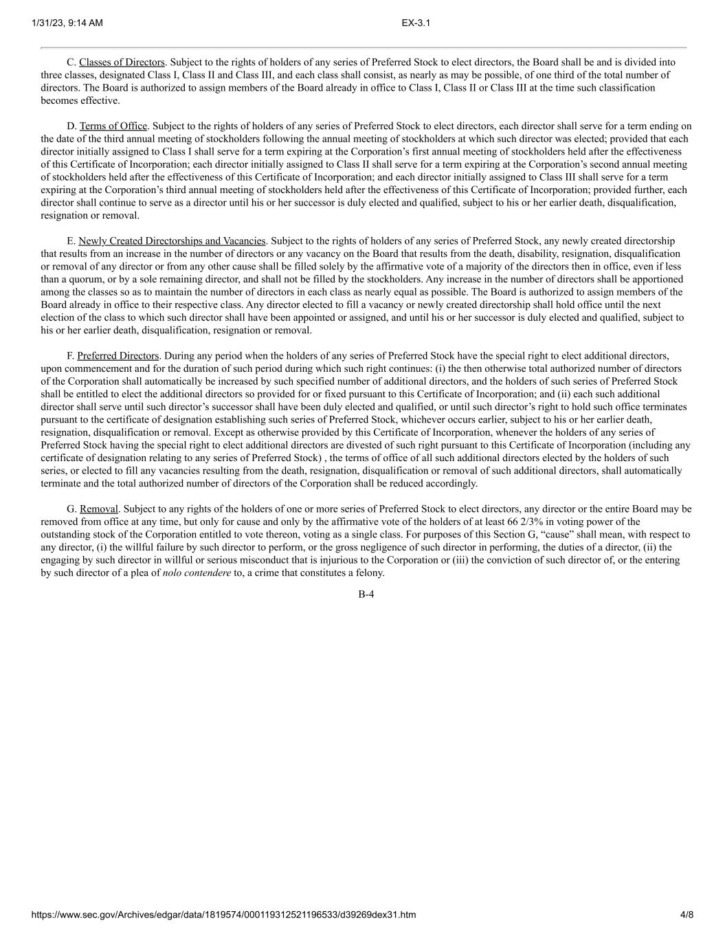 1/31/23, 9:14 AM EX-3.1 https://www.sec.gov/Archives/edgar/data/1819574/000119312521196533/d39269dex31.htm 4/8 C. Classes of Directors. Subject to the rights of holders of any series of Preferred Stock to elect directors, the Board shall be and is divided into three classes, designated Class I, Class II and Class III, and each class shall consist, as nearly as may be possible, of one third of the total number of directors. The Board is authorized to assign members of the Board already in office to Class I, Class II or Class III at the time such classification becomes effective. D. Terms of Office. Subject to the rights of holders of any series of Preferred Stock to elect directors, each director shall serve for a term ending on the date of the third annual meeting of stockholders following the annual meeting of stockholders at which such director was elected; provided that each director initially assigned to Class I shall serve for a term expiring at the Corporation’s first annual meeting of stockholders held after the effectiveness of this Certificate of Incorporation; each director initially assigned to Class II shall serve for a term expiring at the Corporation’s second annual meeting of stockholders held after the effectiveness of this Certificate of Incorporation; and each director initially assigned to Class III shall serve for a term expiring at the Corporation’s third annual meeting of stockholders held after the effectiveness of this Certificate of Incorporation; provided further, each director shall continue to serve as a director until his or her successor is duly elected and qualified, subject to his or her earlier death, disqualification, resignation or removal. E. Newly Created Directorships and Vacancies. Subject to the rights of holders of any series of Preferred Stock, any newly created directorship that results from an increase in the number of directors or any vacancy on the Board that results from the death, disability, resignation, disqualification or removal of any director or from any other cause shall be filled solely by the affirmative vote of a majority of the directors then in office, even if less than a quorum, or by a sole remaining director, and shall not be filled by the stockholders. Any increase in the number of directors shall be apportioned among the classes so as to maintain the number of directors in each class as nearly equal as possible. The Board is authorized to assign members of the Board already in office to their respective class. Any director elected to fill a vacancy or newly created directorship shall hold office until the next election of the class to which such director shall have been appointed or assigned, and until his or her successor is duly elected and qualified, subject to his or her earlier death, disqualification, resignation or removal. F. Preferred Directors. During any period when the holders of any series of Preferred Stock have the special right to elect additional directors, upon commencement and for the duration of such period during which such right continues: (i) the then otherwise total authorized number of directors of the Corporation shall automatically be increased by such specified number of additional directors, and the holders of such series of Preferred Stock shall be entitled to elect the additional directors so provided for or fixed pursuant to this Certificate of Incorporation; and (ii) each such additional director shall serve until such director’s successor shall have been duly elected and qualified, or until such director’s right to hold such office terminates pursuant to the certificate of designation establishing such series of Preferred Stock, whichever occurs earlier, subject to his or her earlier death, resignation, disqualification or removal. Except as otherwise provided by this Certificate of Incorporation, whenever the holders of any series of Preferred Stock having the special right to elect additional directors are divested of such right pursuant to this Certificate of Incorporation (including any certificate of designation relating to any series of Preferred Stock) , the terms of office of all such additional directors elected by the holders of such series, or elected to fill any vacancies resulting from the death, resignation, disqualification or removal of such additional directors, shall automatically terminate and the total authorized number of directors of the Corporation shall be reduced accordingly. G. Removal. Subject to any rights of the holders of one or more series of Preferred Stock to elect directors, any director or the entire Board may be removed from office at any time, but only for cause and only by the affirmative vote of the holders of at least 66 2/3% in voting power of the outstanding stock of the Corporation entitled to vote thereon, voting as a single class. For purposes of this Section G, “cause” shall mean, with respect to any director, (i) the willful failure by such director to perform, or the gross negligence of such director in performing, the duties of a director, (ii) the engaging by such director in willful or serious misconduct that is injurious to the Corporation or (iii) the conviction of such director of, or the entering by such director of a plea of nolo contendere to, a crime that constitutes a felony. B-4