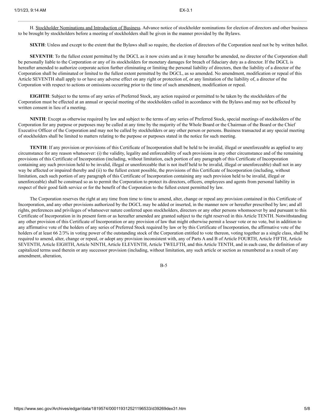 1/31/23, 9:14 AM EX-3.1 https://www.sec.gov/Archives/edgar/data/1819574/000119312521196533/d39269dex31.htm 5/8 H. Stockholder Nominations and Introduction of Business. Advance notice of stockholder nominations for election of directors and other business to be brought by stockholders before a meeting of stockholders shall be given in the manner provided by the Bylaws. SIXTH: Unless and except to the extent that the Bylaws shall so require, the election of directors of the Corporation need not be by written ballot. SEVENTH: To the fullest extent permitted by the DGCL as it now exists and as it may hereafter be amended, no director of the Corporation shall be personally liable to the Corporation or any of its stockholders for monetary damages for breach of fiduciary duty as a director. If the DGCL is hereafter amended to authorize corporate action further eliminating or limiting the personal liability of directors, then the liability of a director of the Corporation shall be eliminated or limited to the fullest extent permitted by the DGCL, as so amended. No amendment, modification or repeal of this Article SEVENTH shall apply to or have any adverse effect on any right or protection of, or any limitation of the liability of, a director of the Corporation with respect to actions or omissions occurring prior to the time of such amendment, modification or repeal. EIGHTH: Subject to the terms of any series of Preferred Stock, any action required or permitted to be taken by the stockholders of the Corporation must be effected at an annual or special meeting of the stockholders called in accordance with the Bylaws and may not be effected by written consent in lieu of a meeting. NINTH: Except as otherwise required by law and subject to the terms of any series of Preferred Stock, special meetings of stockholders of the Corporation for any purpose or purposes may be called at any time by the majority of the Whole Board or the Chairman of the Board or the Chief Executive Officer of the Corporation and may not be called by stockholders or any other person or persons. Business transacted at any special meeting of stockholders shall be limited to matters relating to the purpose or purposes stated in the notice for such meeting. TENTH: If any provision or provisions of this Certificate of Incorporation shall be held to be invalid, illegal or unenforceable as applied to any circumstance for any reason whatsoever: (i) the validity, legality and enforceability of such provisions in any other circumstance and of the remaining provisions of this Certificate of Incorporation (including, without limitation, each portion of any paragraph of this Certificate of Incorporation containing any such provision held to be invalid, illegal or unenforceable that is not itself held to be invalid, illegal or unenforceable) shall not in any way be affected or impaired thereby and (ii) to the fullest extent possible, the provisions of this Certificate of Incorporation (including, without limitation, each such portion of any paragraph of this Certificate of Incorporation containing any such provision held to be invalid, illegal or unenforceable) shall be construed so as to permit the Corporation to protect its directors, officers, employees and agents from personal liability in respect of their good faith service or for the benefit of the Corporation to the fullest extent permitted by law. The Corporation reserves the right at any time from time to time to amend, alter, change or repeal any provision contained in this Certificate of Incorporation, and any other provisions authorized by the DGCL may be added or inserted, in the manner now or hereafter prescribed by law; and all rights, preferences and privileges of whatsoever nature conferred upon stockholders, directors or any other persons whomsoever by and pursuant to this Certificate of Incorporation in its present form or as hereafter amended are granted subject to the right reserved in this Article TENTH. Notwithstanding any other provision of this Certificate of Incorporation or any provision of law that might otherwise permit a lesser vote or no vote, but in addition to any affirmative vote of the holders of any series of Preferred Stock required by law or by this Certificate of Incorporation, the affirmative vote of the holders of at least 66 2/3% in voting power of the outstanding stock of the Corporation entitled to vote thereon, voting together as a single class, shall be required to amend, alter, change or repeal, or adopt any provision inconsistent with, any of Parts A and B of Article FOURTH, Article FIFTH, Article SEVENTH, Article EIGHTH, Article NINTH, Article ELEVENTH, Article TWELFTH, and this Article TENTH, and in each case, the definition of any capitalized terms used therein or any successor provision (including, without limitation, any such article or section as renumbered as a result of any amendment, alteration, B-5