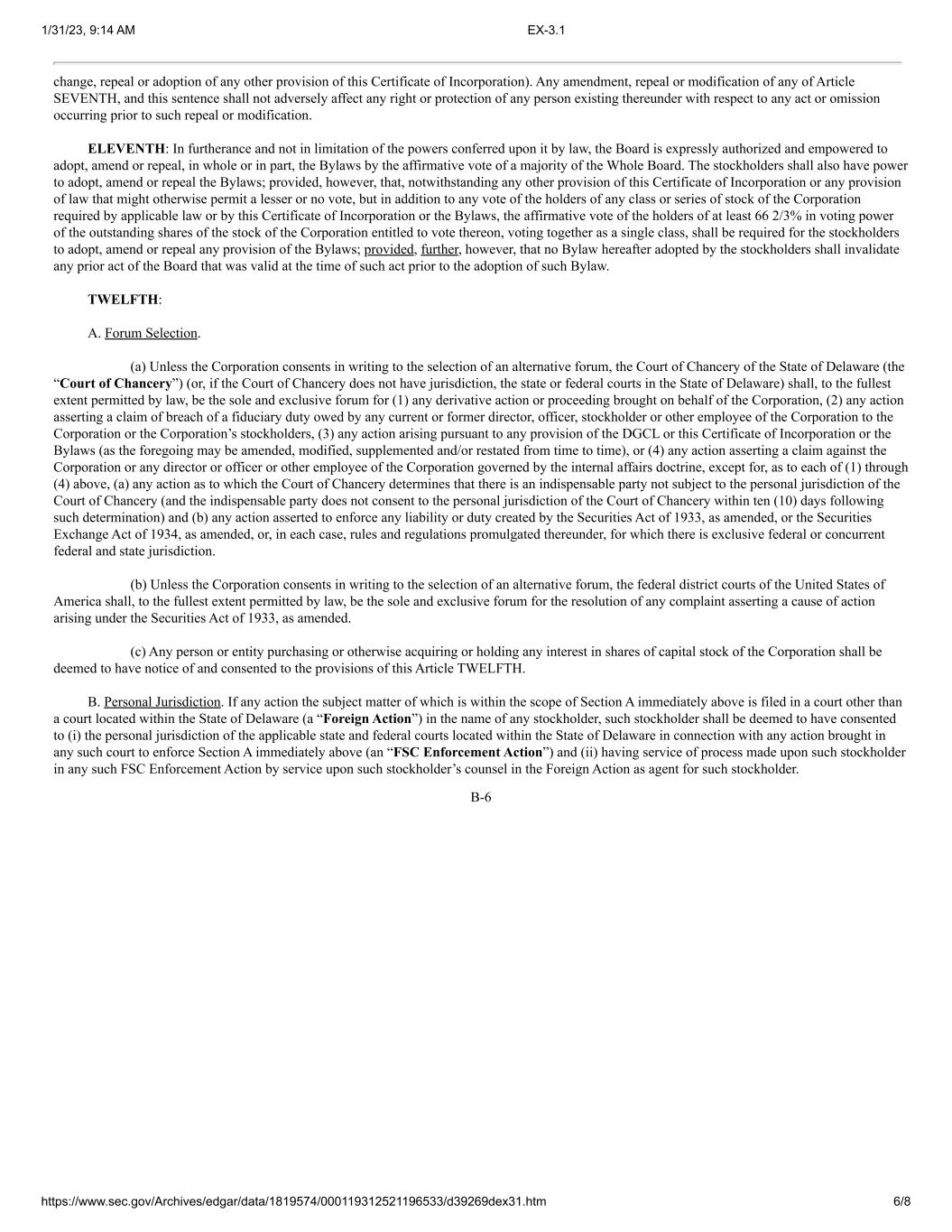 1/31/23, 9:14 AM EX-3.1 https://www.sec.gov/Archives/edgar/data/1819574/000119312521196533/d39269dex31.htm 6/8 change, repeal or adoption of any other provision of this Certificate of Incorporation). Any amendment, repeal or modification of any of Article SEVENTH, and this sentence shall not adversely affect any right or protection of any person existing thereunder with respect to any act or omission occurring prior to such repeal or modification. ELEVENTH: In furtherance and not in limitation of the powers conferred upon it by law, the Board is expressly authorized and empowered to adopt, amend or repeal, in whole or in part, the Bylaws by the affirmative vote of a majority of the Whole Board. The stockholders shall also have power to adopt, amend or repeal the Bylaws; provided, however, that, notwithstanding any other provision of this Certificate of Incorporation or any provision of law that might otherwise permit a lesser or no vote, but in addition to any vote of the holders of any class or series of stock of the Corporation required by applicable law or by this Certificate of Incorporation or the Bylaws, the affirmative vote of the holders of at least 66 2/3% in voting power of the outstanding shares of the stock of the Corporation entitled to vote thereon, voting together as a single class, shall be required for the stockholders to adopt, amend or repeal any provision of the Bylaws; provided, further, however, that no Bylaw hereafter adopted by the stockholders shall invalidate any prior act of the Board that was valid at the time of such act prior to the adoption of such Bylaw. TWELFTH: A. Forum Selection. (a) Unless the Corporation consents in writing to the selection of an alternative forum, the Court of Chancery of the State of Delaware (the “Court of Chancery”) (or, if the Court of Chancery does not have jurisdiction, the state or federal courts in the State of Delaware) shall, to the fullest extent permitted by law, be the sole and exclusive forum for (1) any derivative action or proceeding brought on behalf of the Corporation, (2) any action asserting a claim of breach of a fiduciary duty owed by any current or former director, officer, stockholder or other employee of the Corporation to the Corporation or the Corporation’s stockholders, (3) any action arising pursuant to any provision of the DGCL or this Certificate of Incorporation or the Bylaws (as the foregoing may be amended, modified, supplemented and/or restated from time to time), or (4) any action asserting a claim against the Corporation or any director or officer or other employee of the Corporation governed by the internal affairs doctrine, except for, as to each of (1) through (4) above, (a) any action as to which the Court of Chancery determines that there is an indispensable party not subject to the personal jurisdiction of the Court of Chancery (and the indispensable party does not consent to the personal jurisdiction of the Court of Chancery within ten (10) days following such determination) and (b) any action asserted to enforce any liability or duty created by the Securities Act of 1933, as amended, or the Securities Exchange Act of 1934, as amended, or, in each case, rules and regulations promulgated thereunder, for which there is exclusive federal or concurrent federal and state jurisdiction. (b) Unless the Corporation consents in writing to the selection of an alternative forum, the federal district courts of the United States of America shall, to the fullest extent permitted by law, be the sole and exclusive forum for the resolution of any complaint asserting a cause of action arising under the Securities Act of 1933, as amended. (c) Any person or entity purchasing or otherwise acquiring or holding any interest in shares of capital stock of the Corporation shall be deemed to have notice of and consented to the provisions of this Article TWELFTH. B. Personal Jurisdiction. If any action the subject matter of which is within the scope of Section A immediately above is filed in a court other than a court located within the State of Delaware (a “Foreign Action”) in the name of any stockholder, such stockholder shall be deemed to have consented to (i) the personal jurisdiction of the applicable state and federal courts located within the State of Delaware in connection with any action brought in any such court to enforce Section A immediately above (an “FSC Enforcement Action”) and (ii) having service of process made upon such stockholder in any such FSC Enforcement Action by service upon such stockholder’s counsel in the Foreign Action as agent for such stockholder. B-6